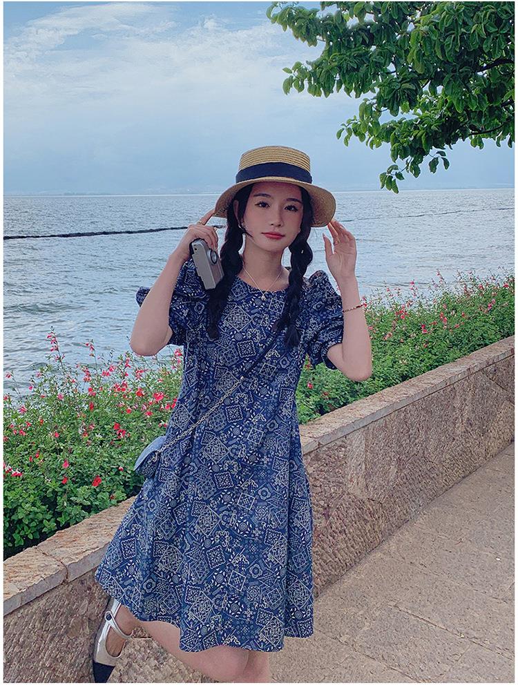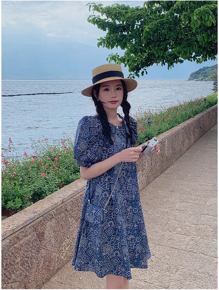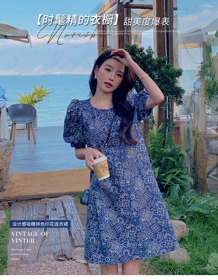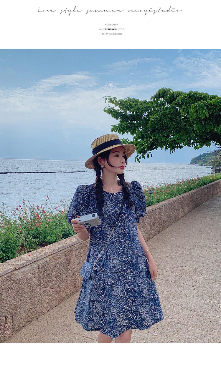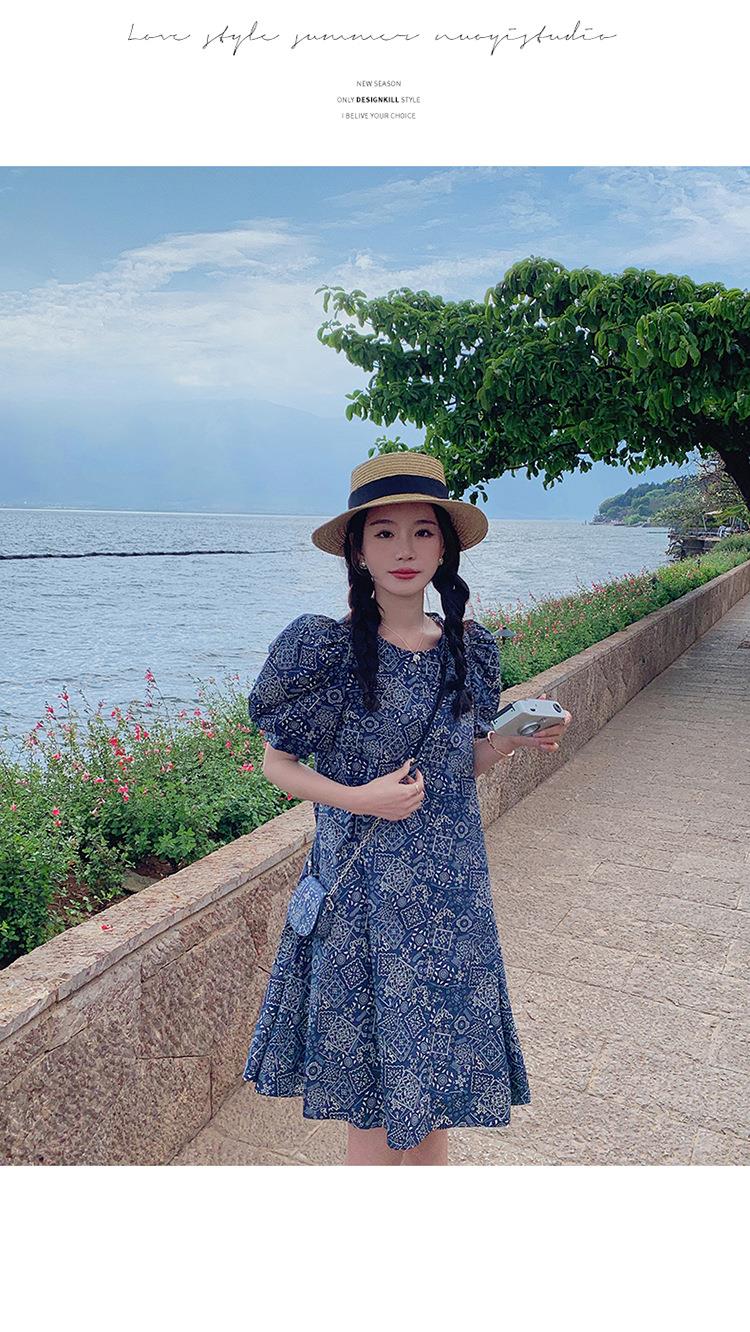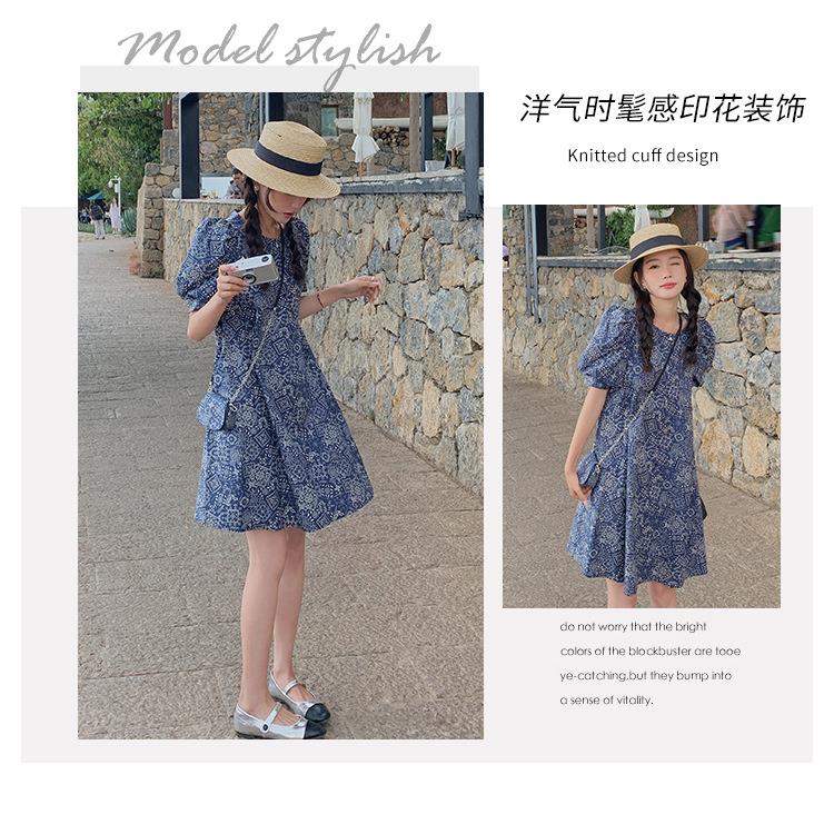 复古名族风印花连衣裙女装2023夏季新款小个子减龄中长款裙子配包