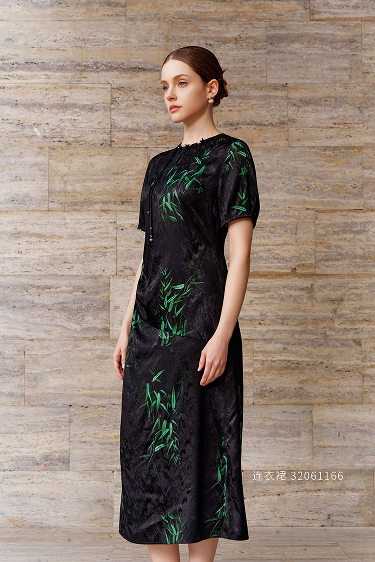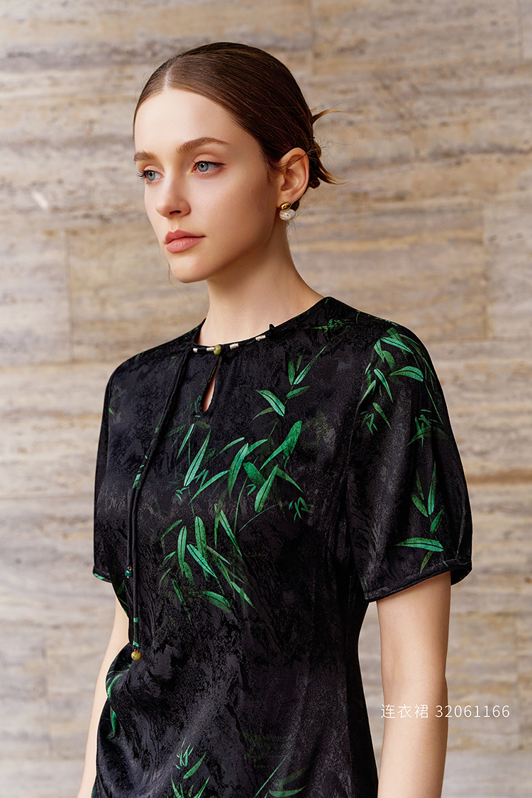 【国风竹叶印花真丝裙】26年春夏新品女士桑蚕丝中长款印花连衣裙
