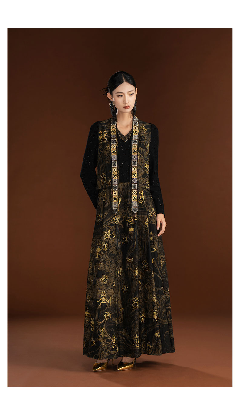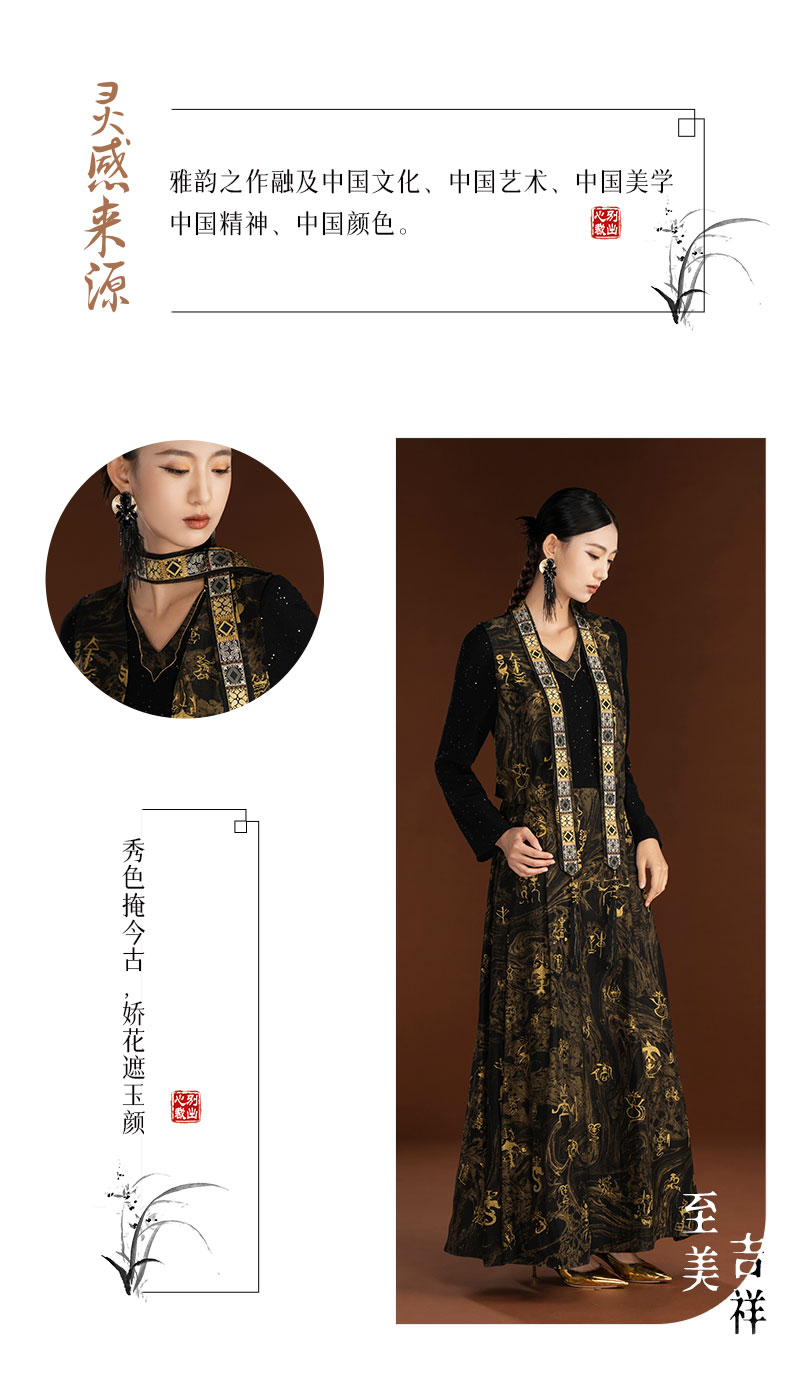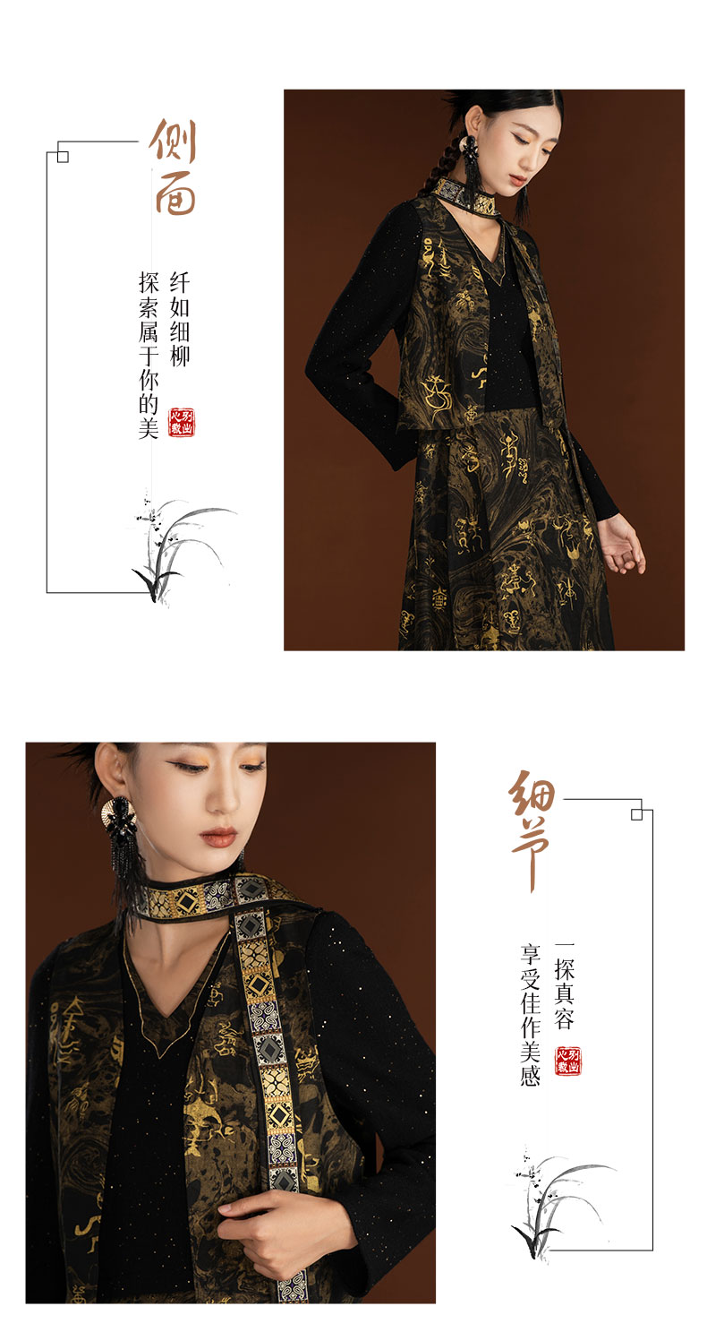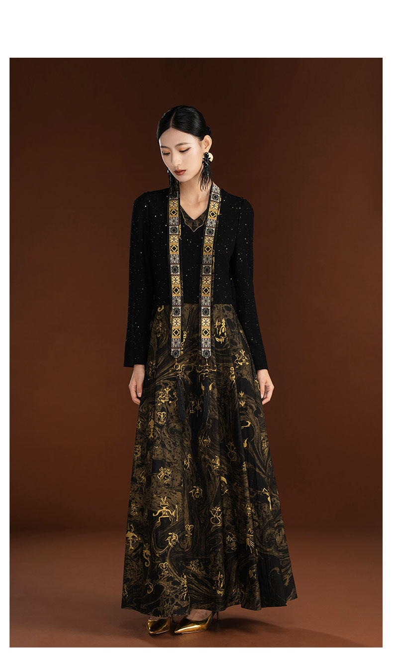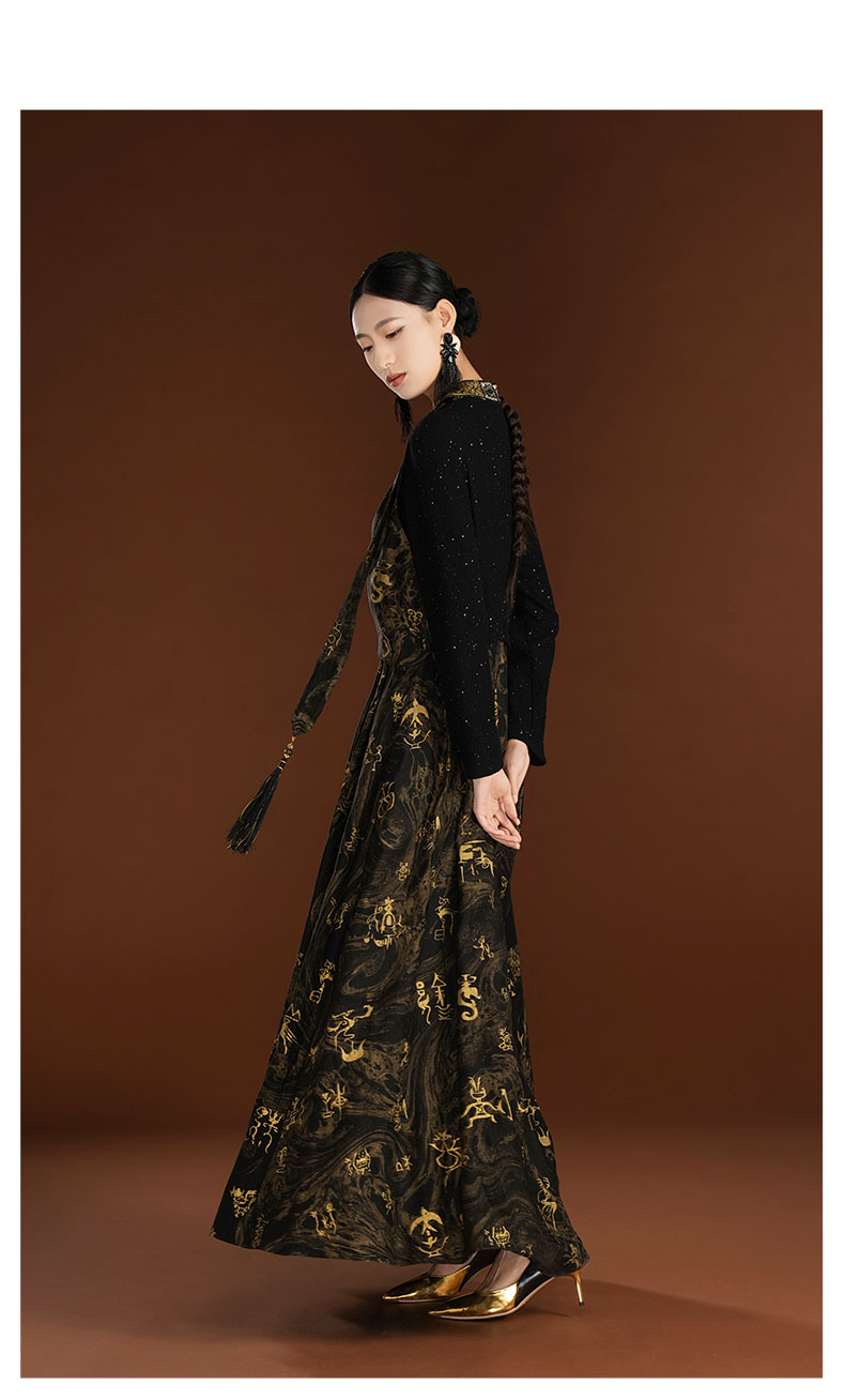 吉祥衣家新中式国风轻奢设计高端黑色假两件女可拆深弘道艺连衣裙