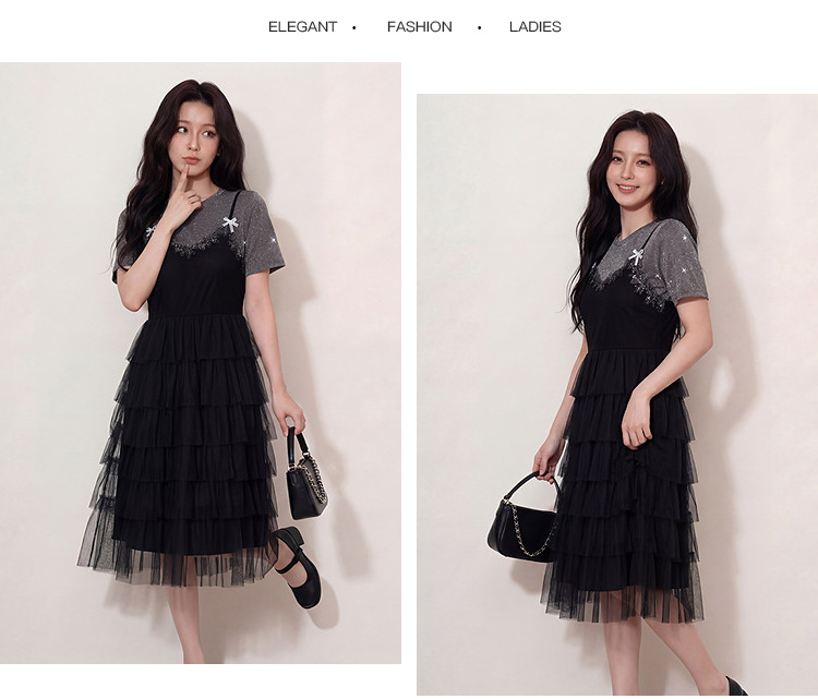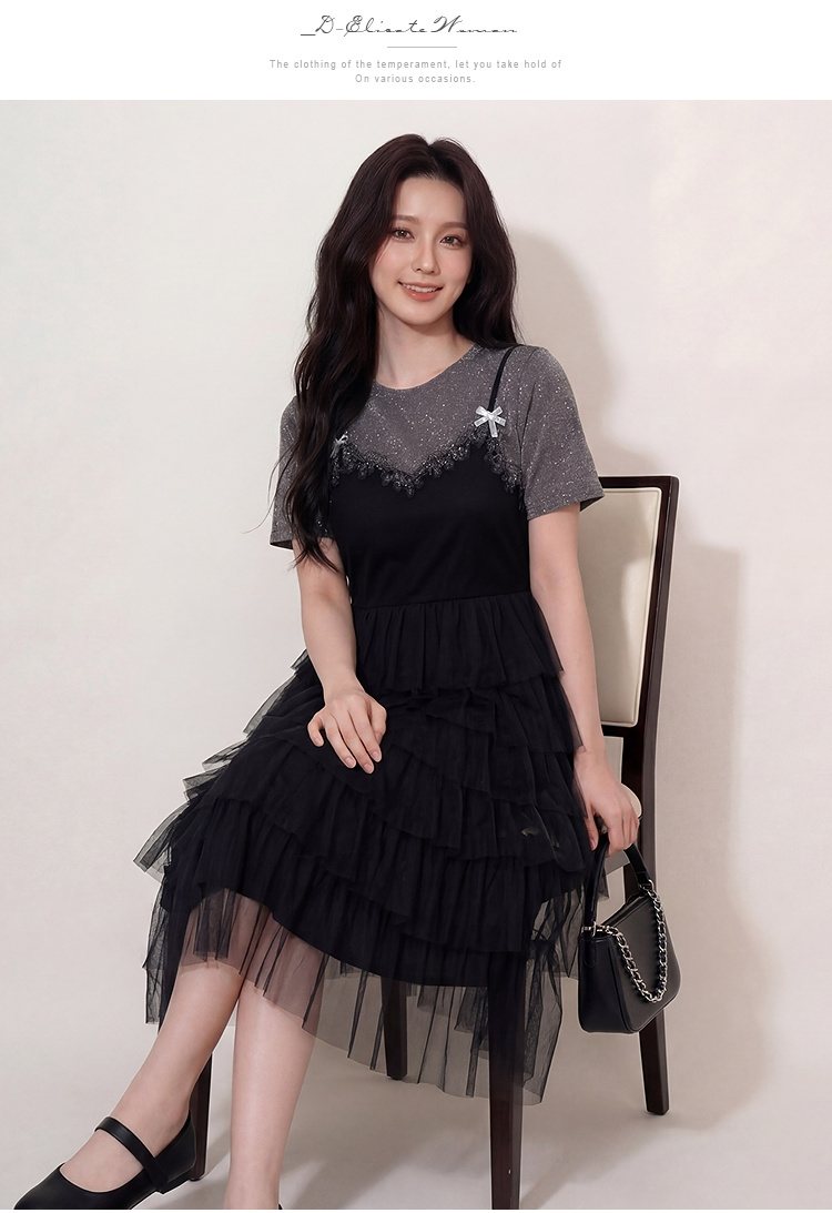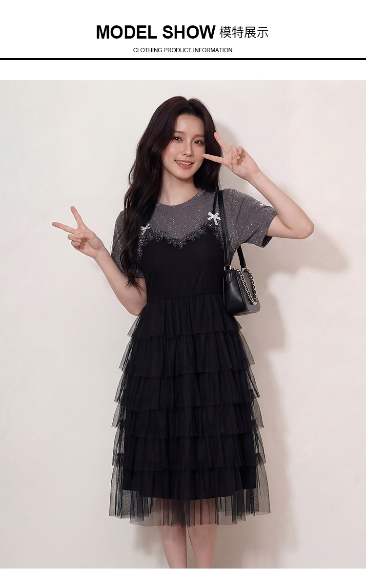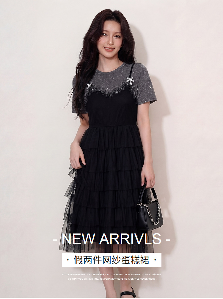 奢姿大码女装2026夏季假两件拼色网纱蛋糕裙胖妹妹遮肉气质长裙9962854701