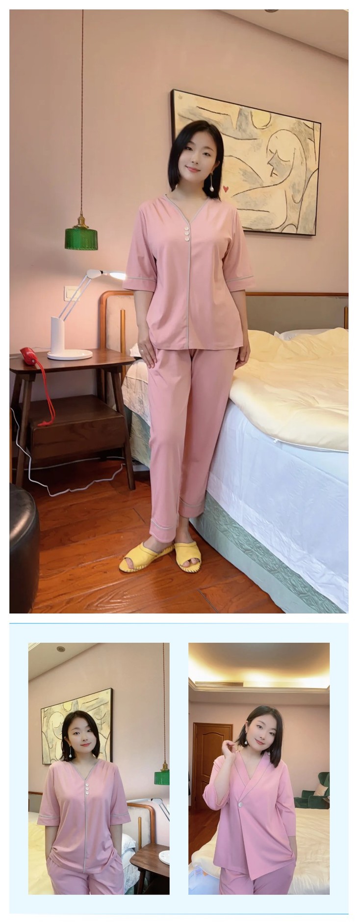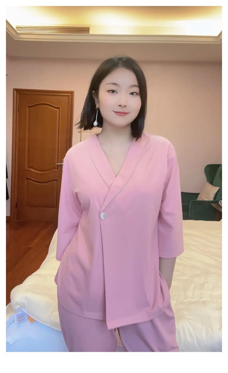 和这款睡衣同材质的还有一个五分袖版本,这款的样式更简约一点,中间是三颗纽扣装饰,配套的是长裤,看姐妹们更喜欢哪个样式,舒适程度都是一样的👍🏻