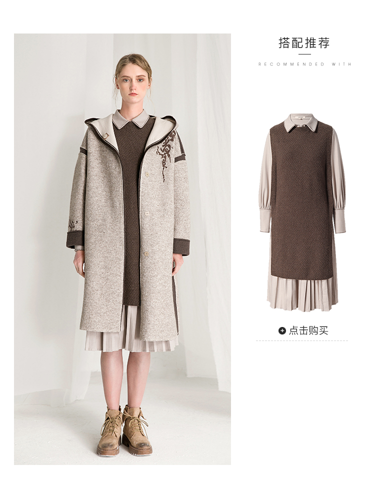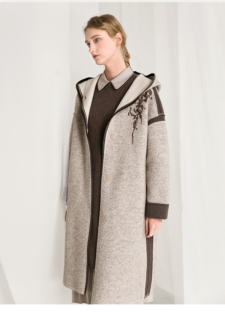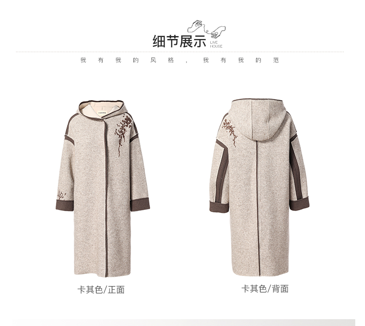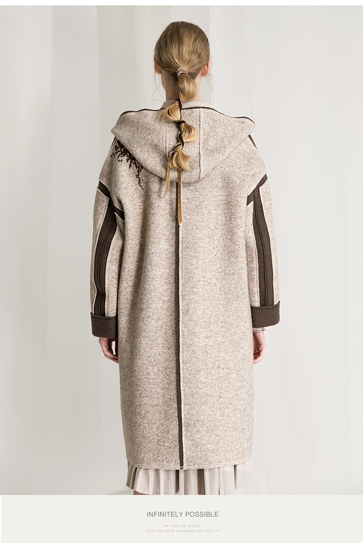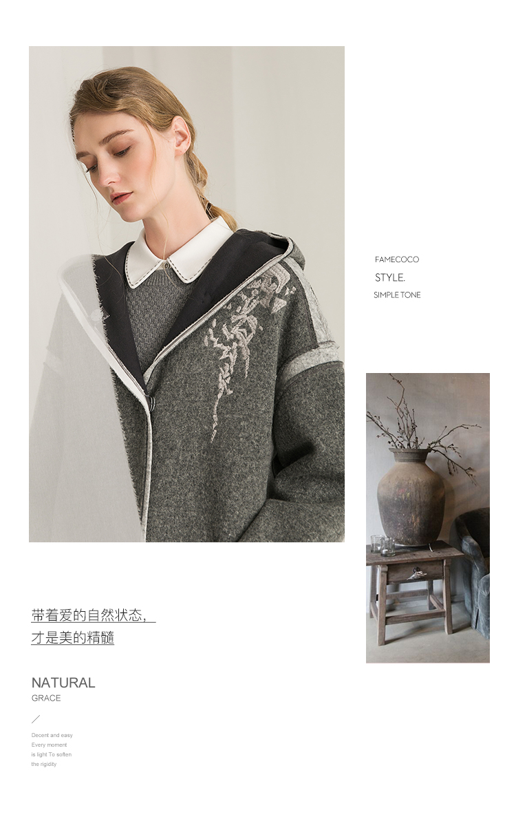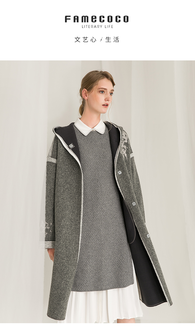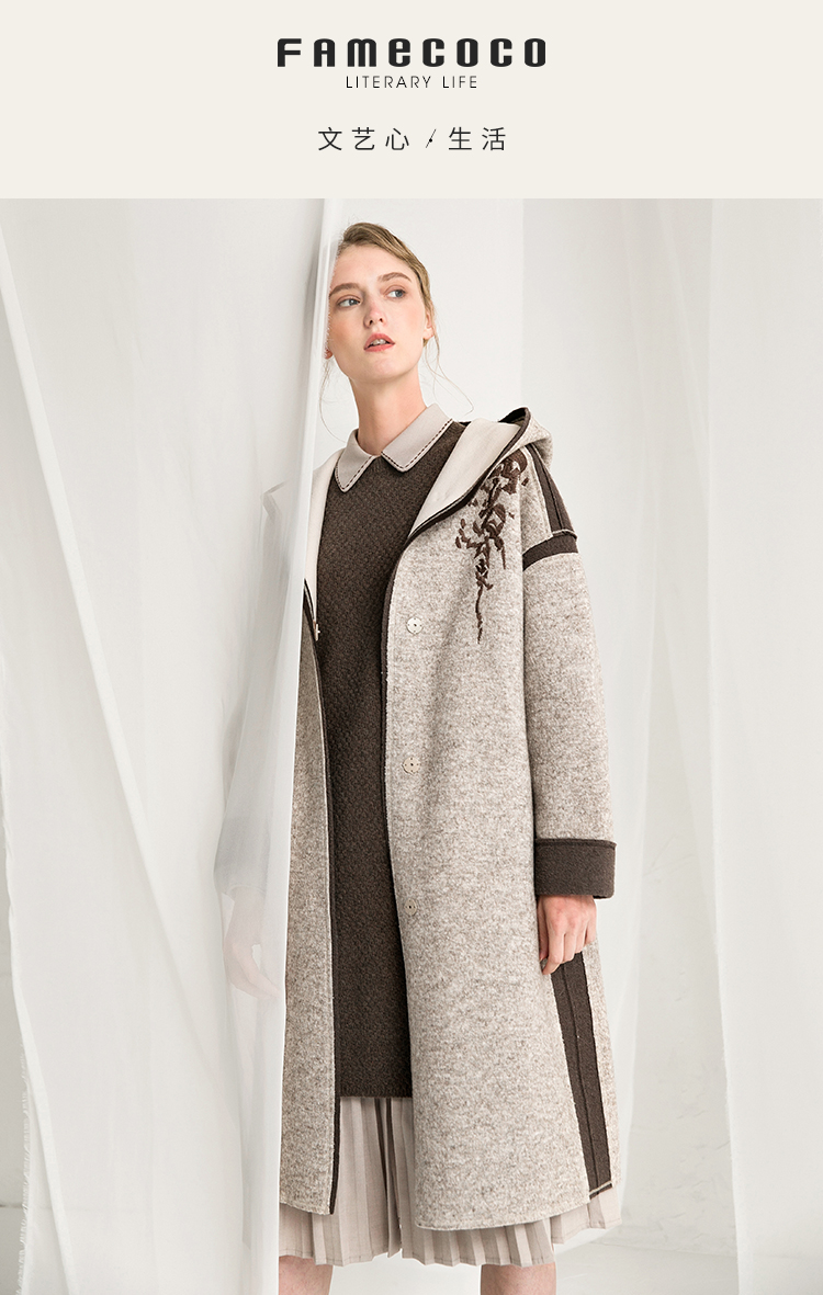 Famecoco范可儿毛呢大衣秋冬款连帽长款外套F218AC001