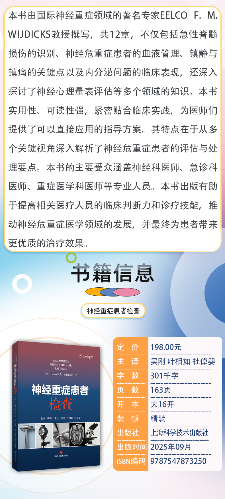 本书由国际神经重症领域的著名专家Eelco F. M. Wijdicks教授撰写,共12章,不仅包括急性脊髓损伤的识别、神经危重症患者的血液管理、镇静与镇痛的关键点以及内分泌问题的临床表现,还深入探讨了神经心理量表评估等多个领域的知识。 本书实用性、可读性强,紧密贴合临床实践,为医师们提供了可以直接应用的指导方案。其特点在于从多个关键视角深入解析了神经危重症患者的评估与处理要点。本书的主要受众涵盖神经科医师、急诊科医师、重症医学科医师等专业人员。本书出版有助于提高相关医疗人员的临床判断力和诊疗技能,推动神经危重症医学领域的发展,并最终为患者带来更优质的治疗效果。
