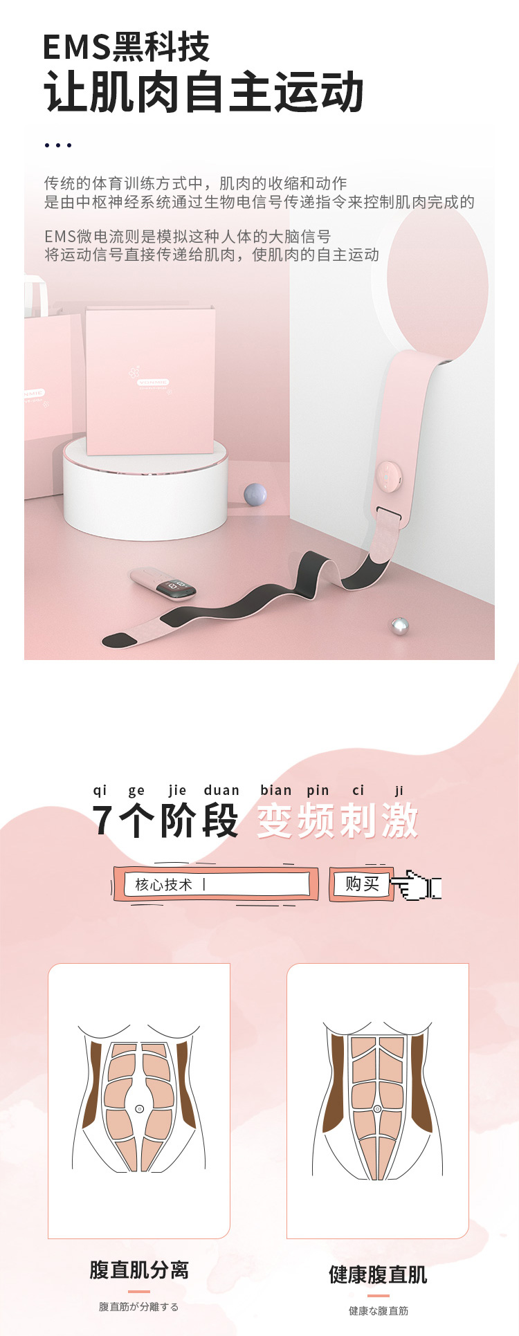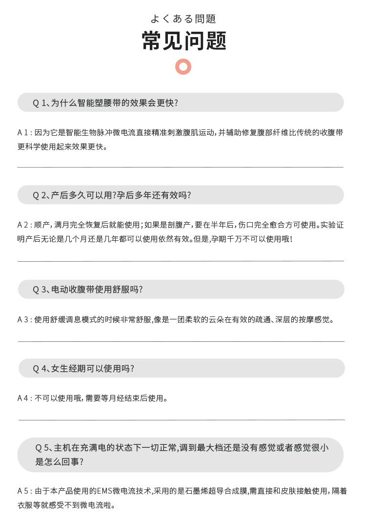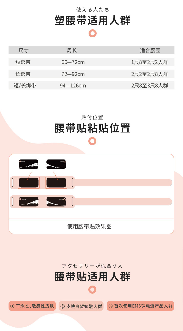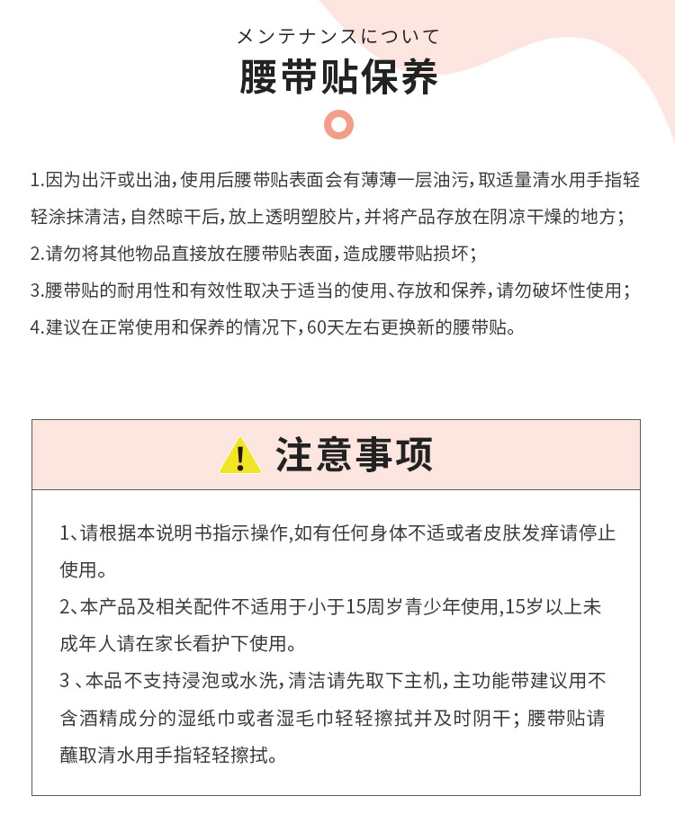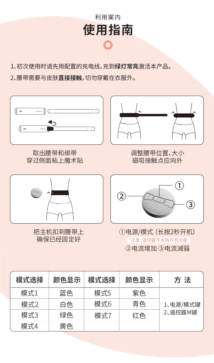 2、腰带需与腹部\腰部皮肤接触,切勿穿戴在衣服外面使用,皮肤干燥直接使用可能会有刺痛感。