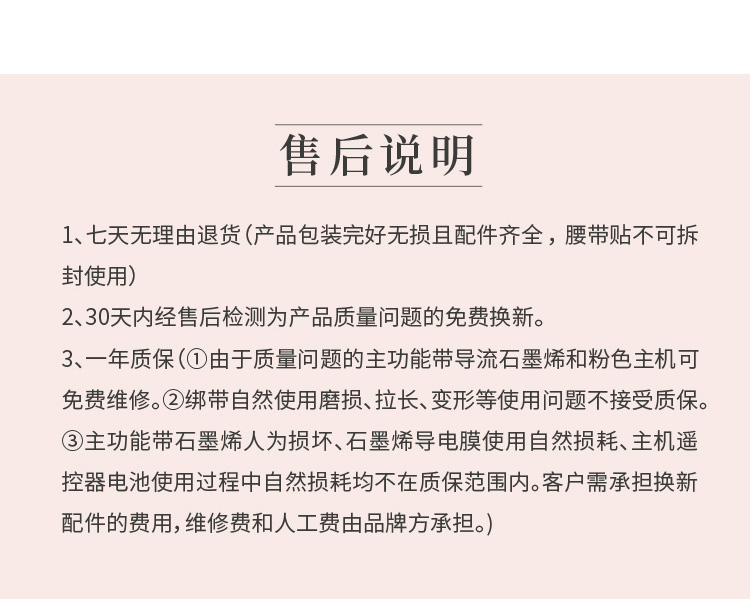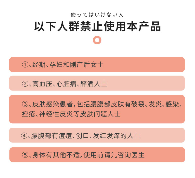 3、禁止使用人群:高血压、心脏病、皮肤病患者、经期、孕期、未出月子女性、腰部有创口、醉酒人士。