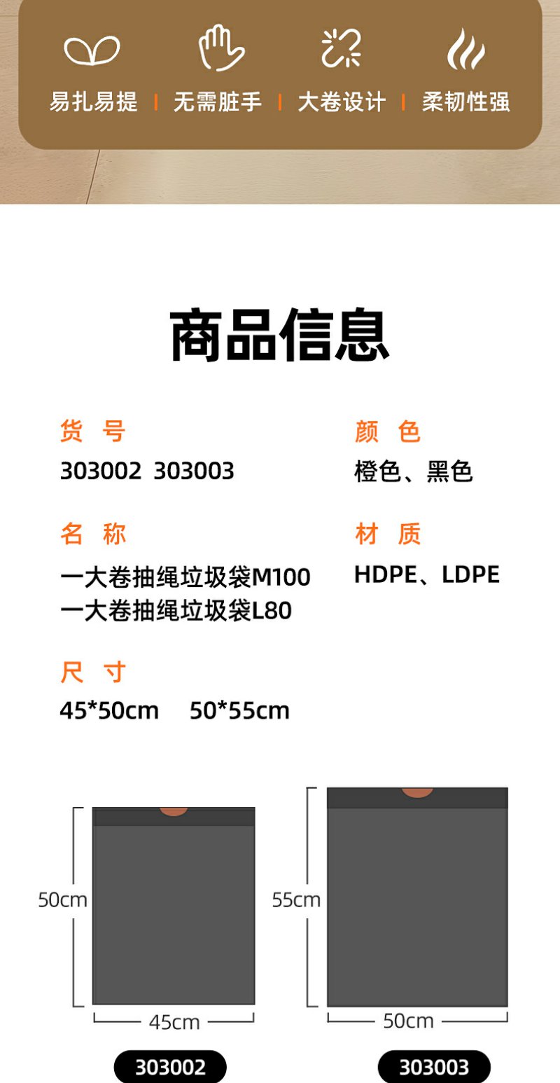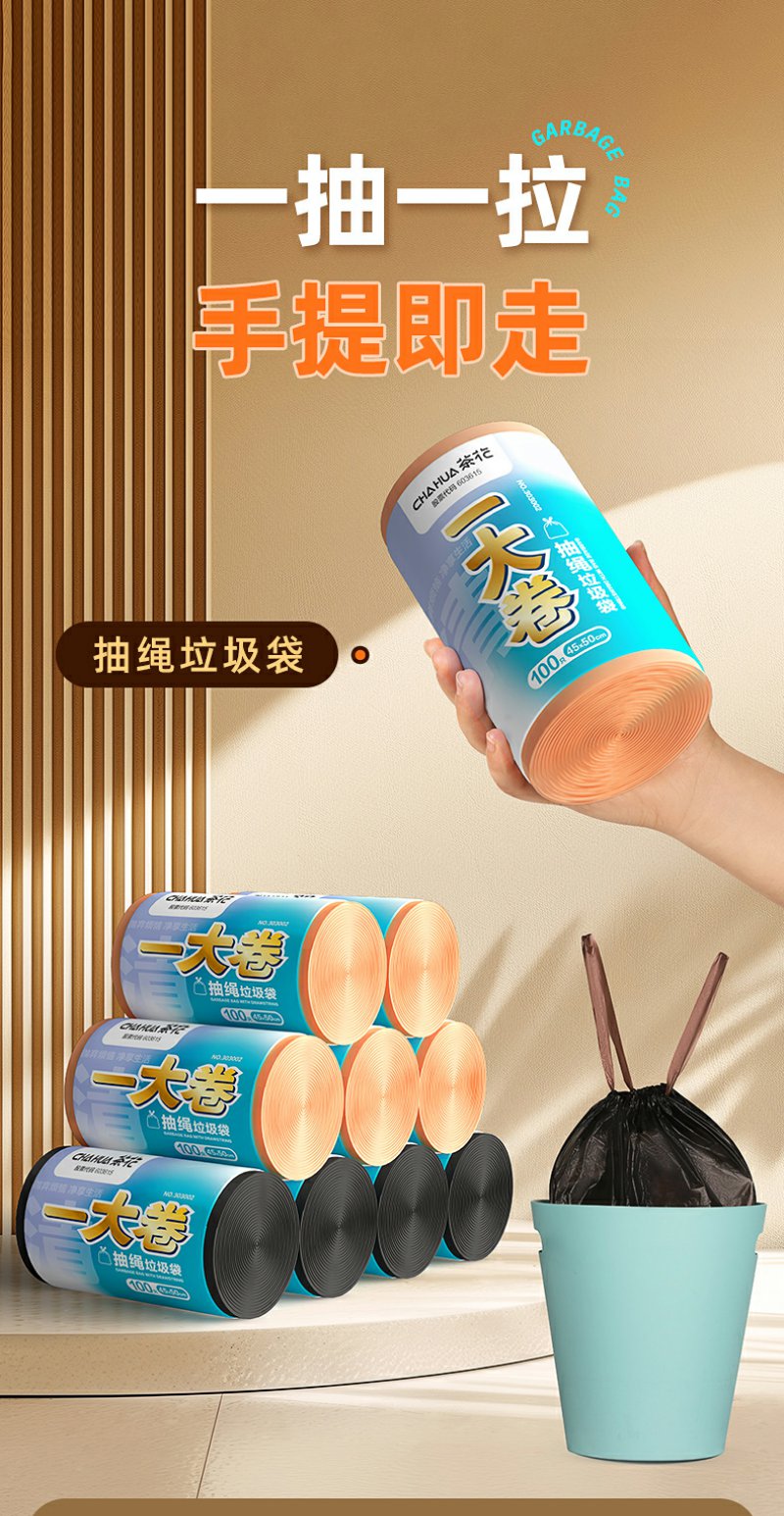 【茶花】一大卷抽绳垃圾袋100只家庭量贩装