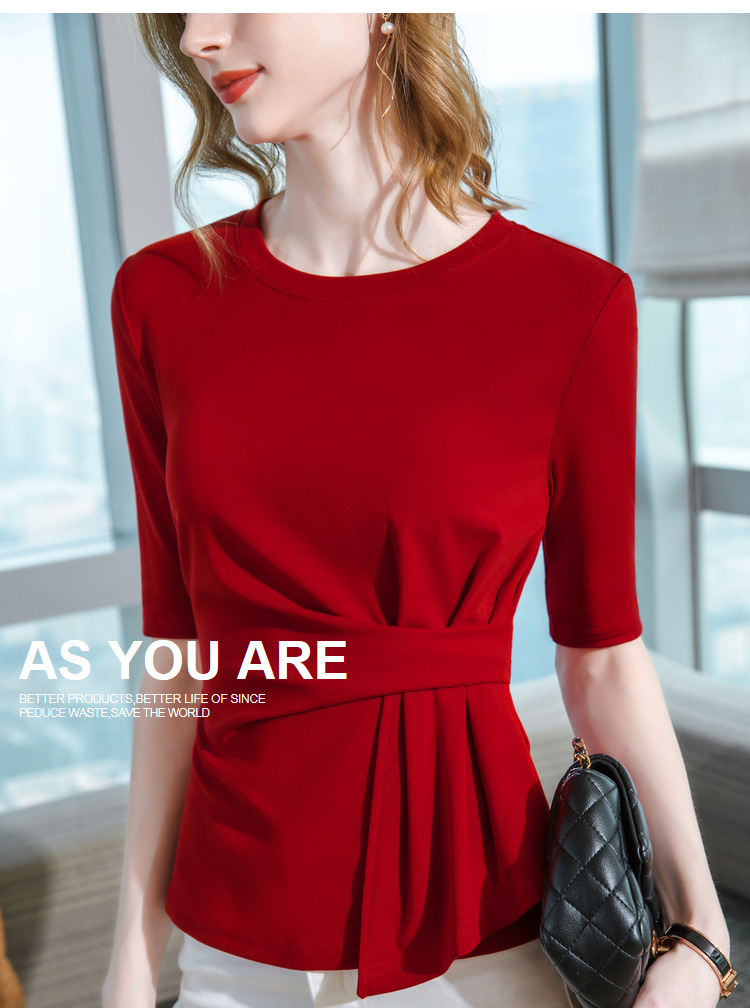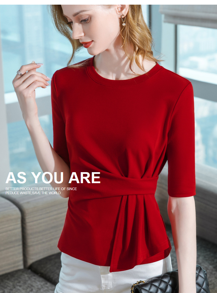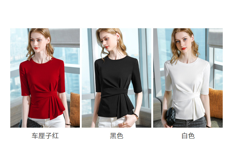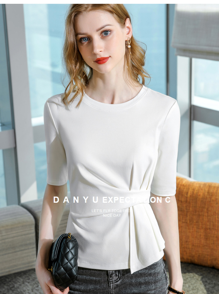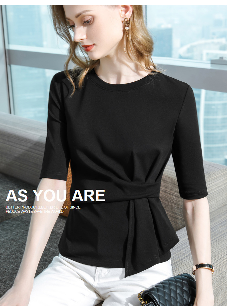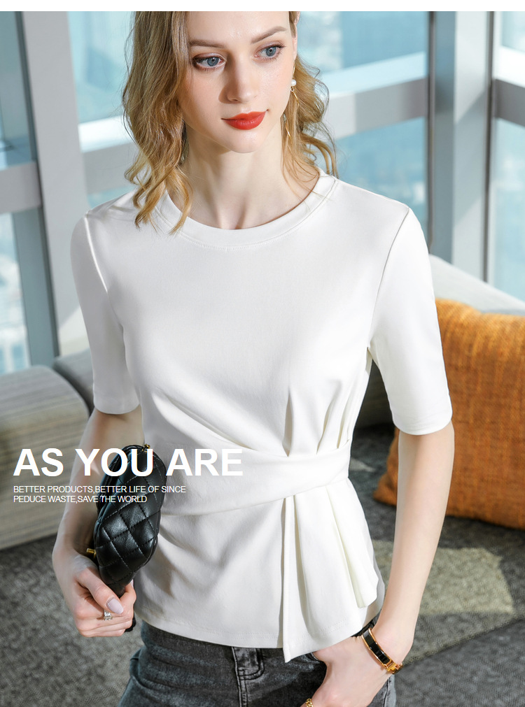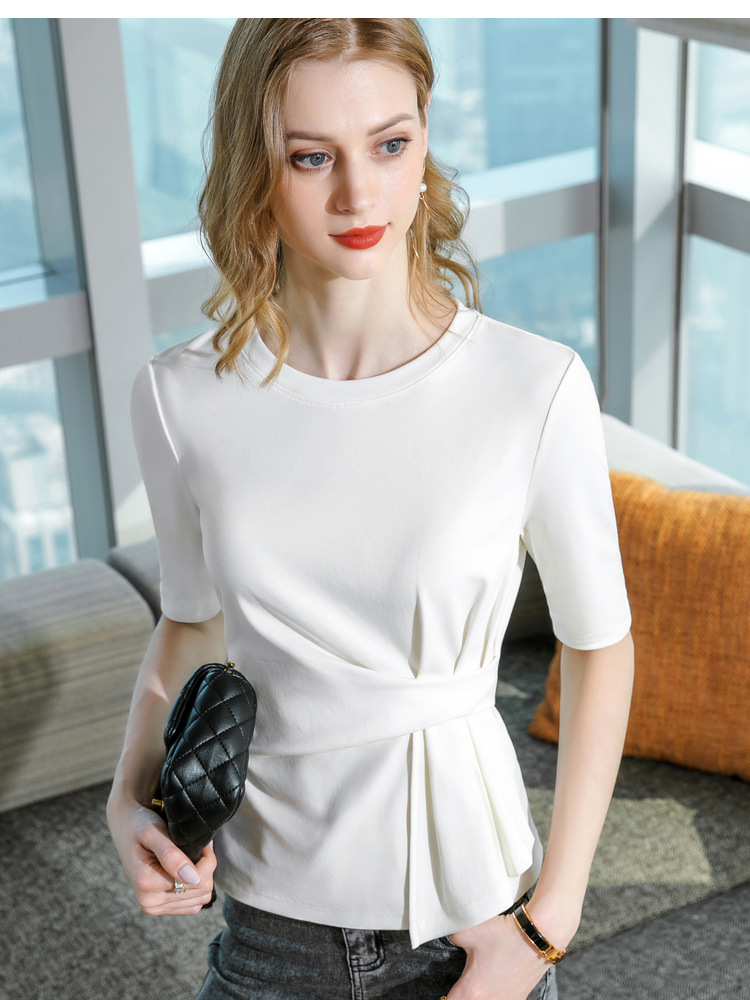中袖t恤,纯色圆领半袖棉设计感收褶高级感上衣SG-T2X0409