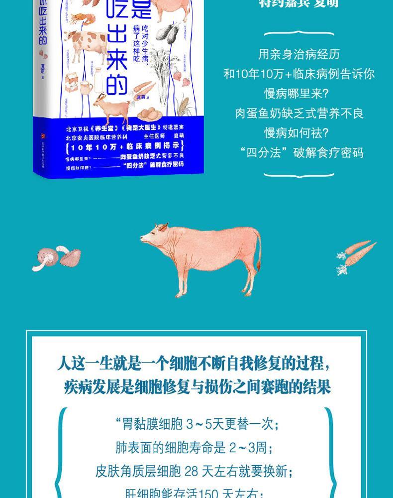 《你是你吃出来的》是前安贞医院营养科主任夏萌总结自身患病经历和10万+临床病例写成。高血压、高血脂、糖尿病、冠心病等慢病人群都曾陷入同一个误区——误以为低油低脂保健康,其实多是蛋白质缺乏式营养不良;误以为只能终生服药或手术,忽略了饮食等生活方式改变带来的真正康复。作者结合实例提出:要预防疾病,先回到目前人类进化突飞猛进阶段的食谱——{植物类食物65%+动物类食物35%},一日三餐才是真正的保健品;针对已患慢病人群,提出“四分法”,讲解冠心病、甲状腺结节、胃炎、心悸、便秘、高血压、痛经、抑郁、老年痴呆14种常见慢病饮食治病方法,帮助患者控制疾病和恢复健康。中国人到底怎样吃才健康?一本书重建健康饮食新认知——吃对少生病,病了这样吃。