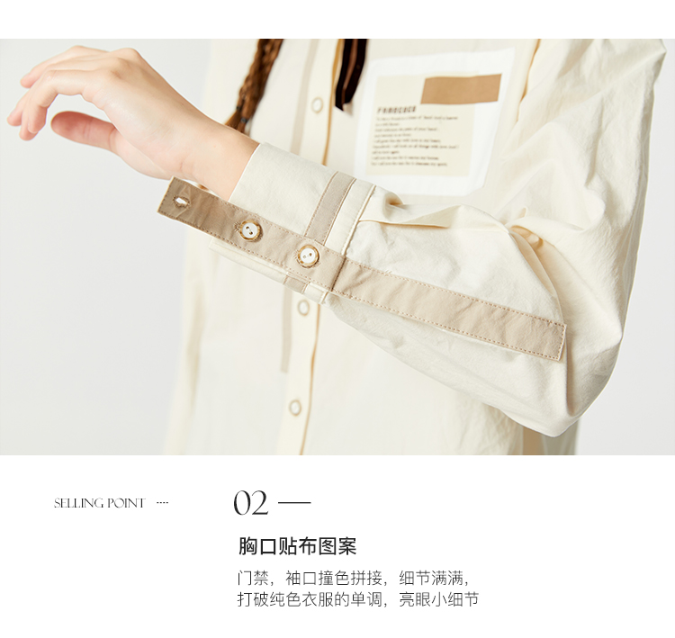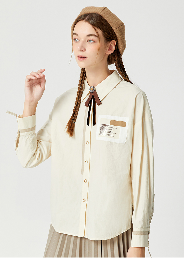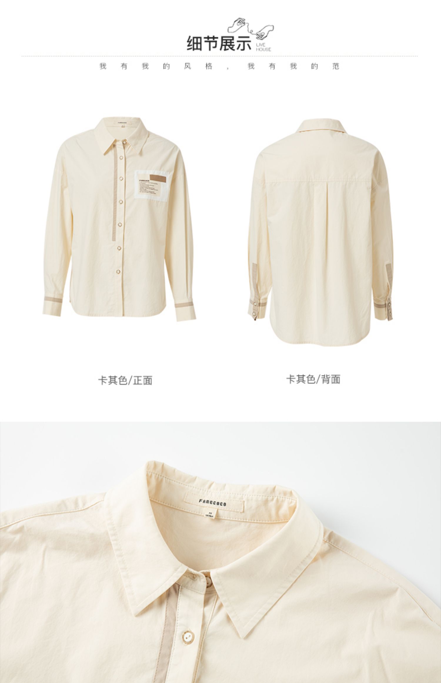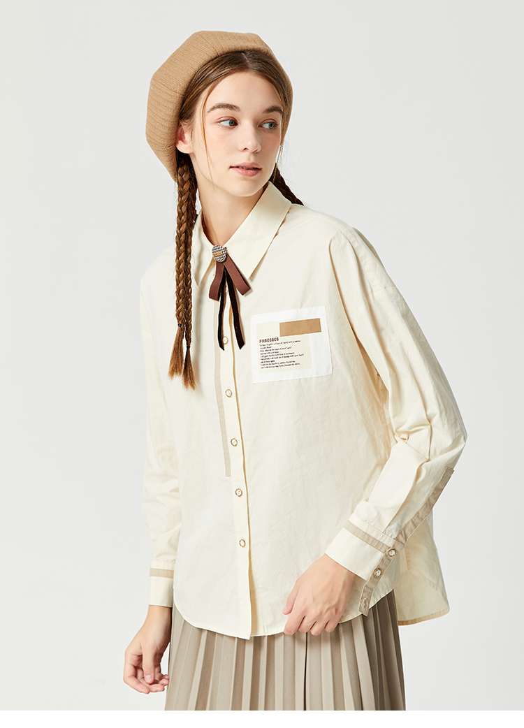 Famecoco范可儿贴布polo领衬衫女卡其色长袖早秋撞色拼接衬衣纯棉F225BH013