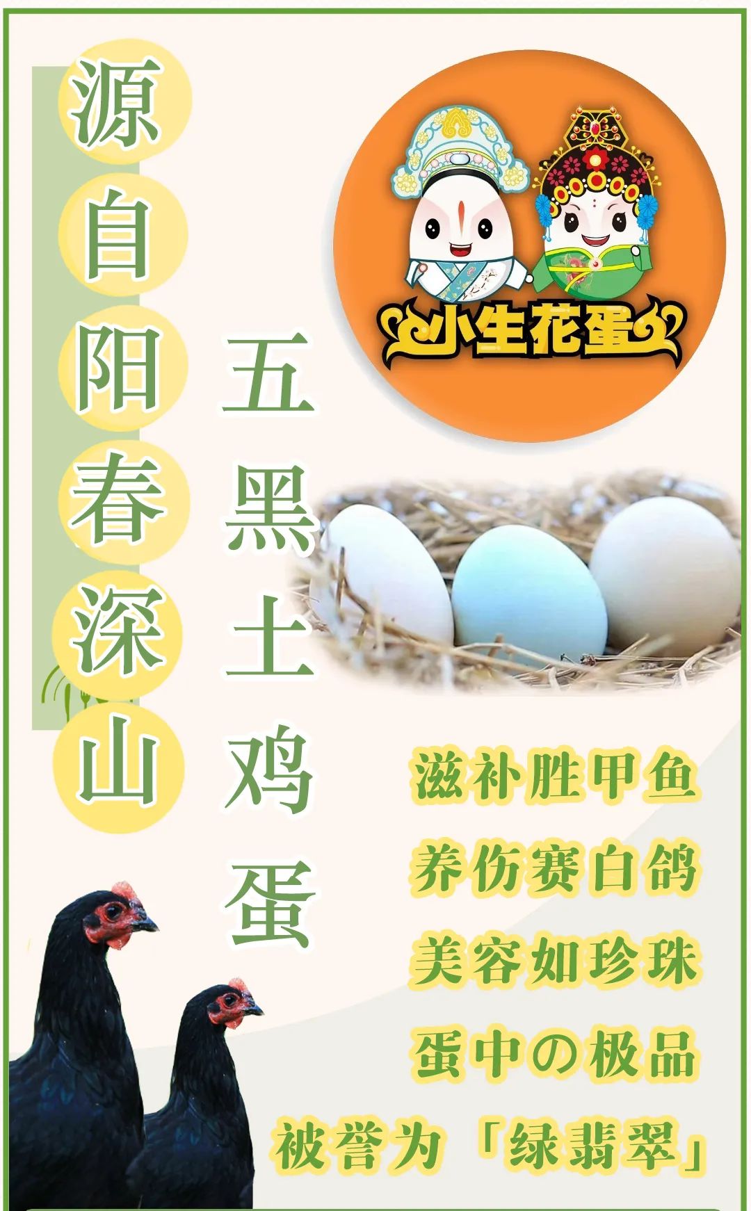 小生花蛋采用原种五黑土鸡作为产蛋鸡种,自主繁育血统纯正。