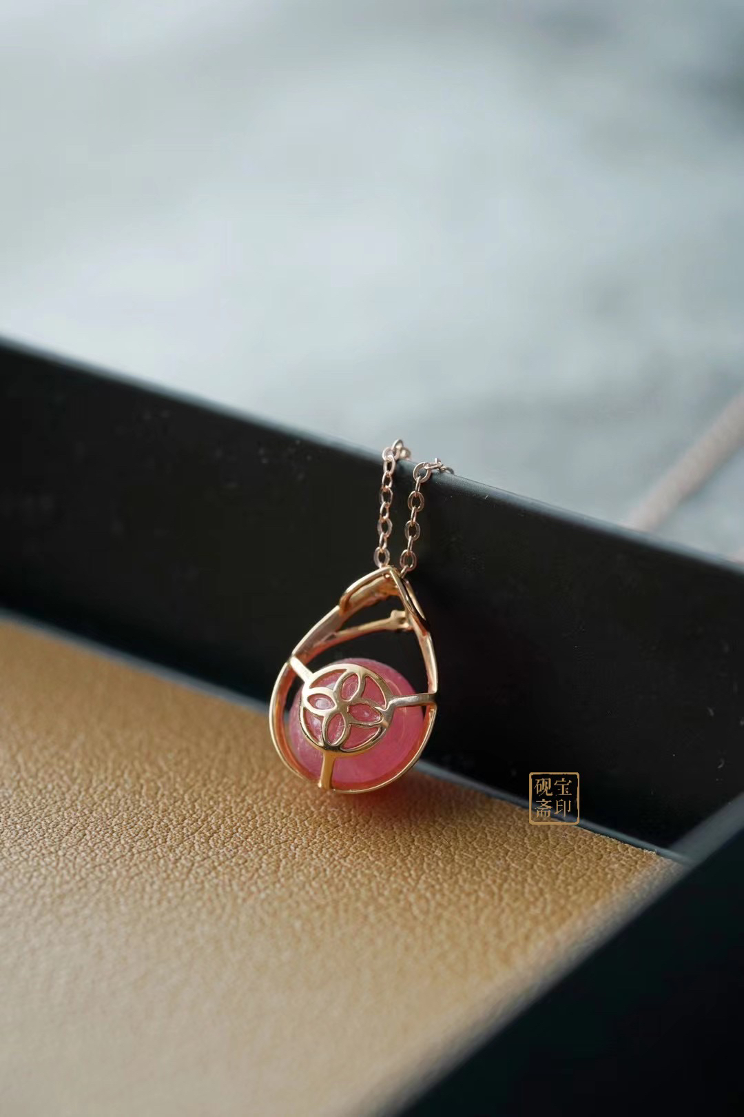 一枚纯元的红纹石珠子,非常通透的设计