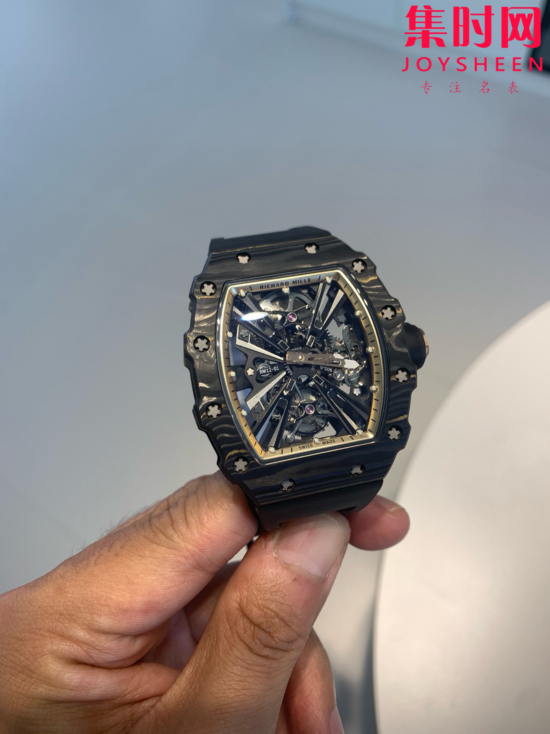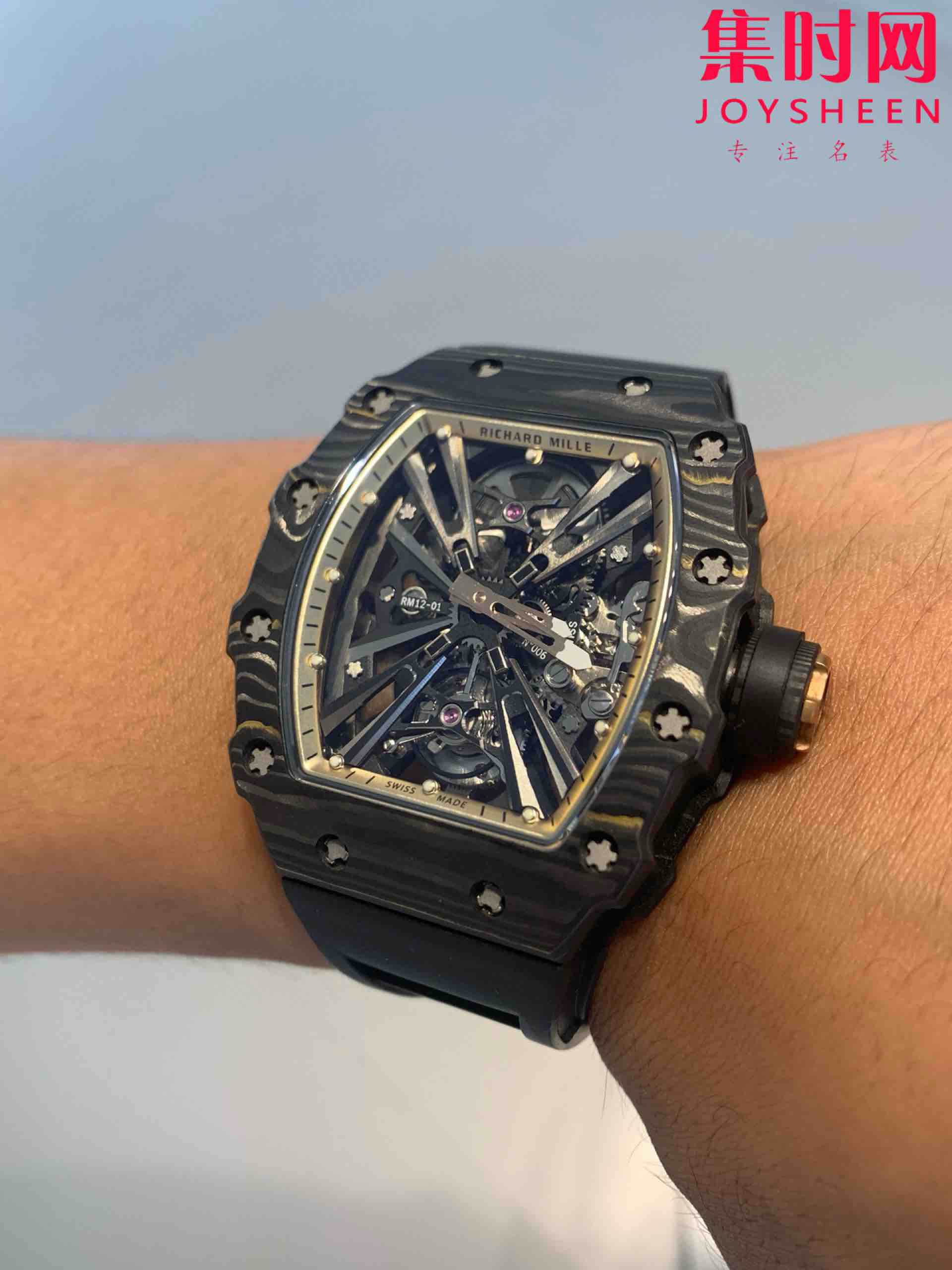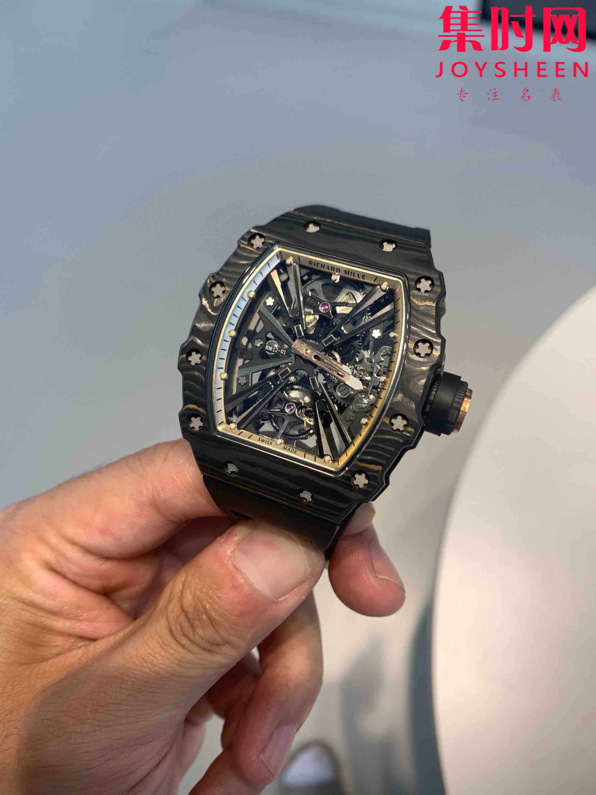 『RICHARDMILLE』理查德米勒RM12-01碳纤维壳 真陀飞轮腕表 桶形表壳使用复合材料「Gold Carbon TPT」金碳纤维制作,金箔与碳纤维形成错落有致的纹理,每只表壳的图案都不同。碳纤维层与金箔薄片交织叠压制成,这种特殊的复合材料一方面继承了碳纤维坚固轻盈的优异性能,另一方面又融入贵金属元素,视觉上更加醒目,明亮的金箔层与碳纤维哑光纹理形成鲜明的对比效果。 金属装饰整齐排列,每款表壳的曲线都散发出全新的光影变幻和夺目的黄金光泽。腕表搭载浮动陀飞轮手动上链机械机芯,动力储备充足,走时精准稳定。RM12-01为专门背透设计,透过表底你能够欣赏到机芯的镂空结构,以及倒角、喷砂、缎面、抛光等润饰细节。