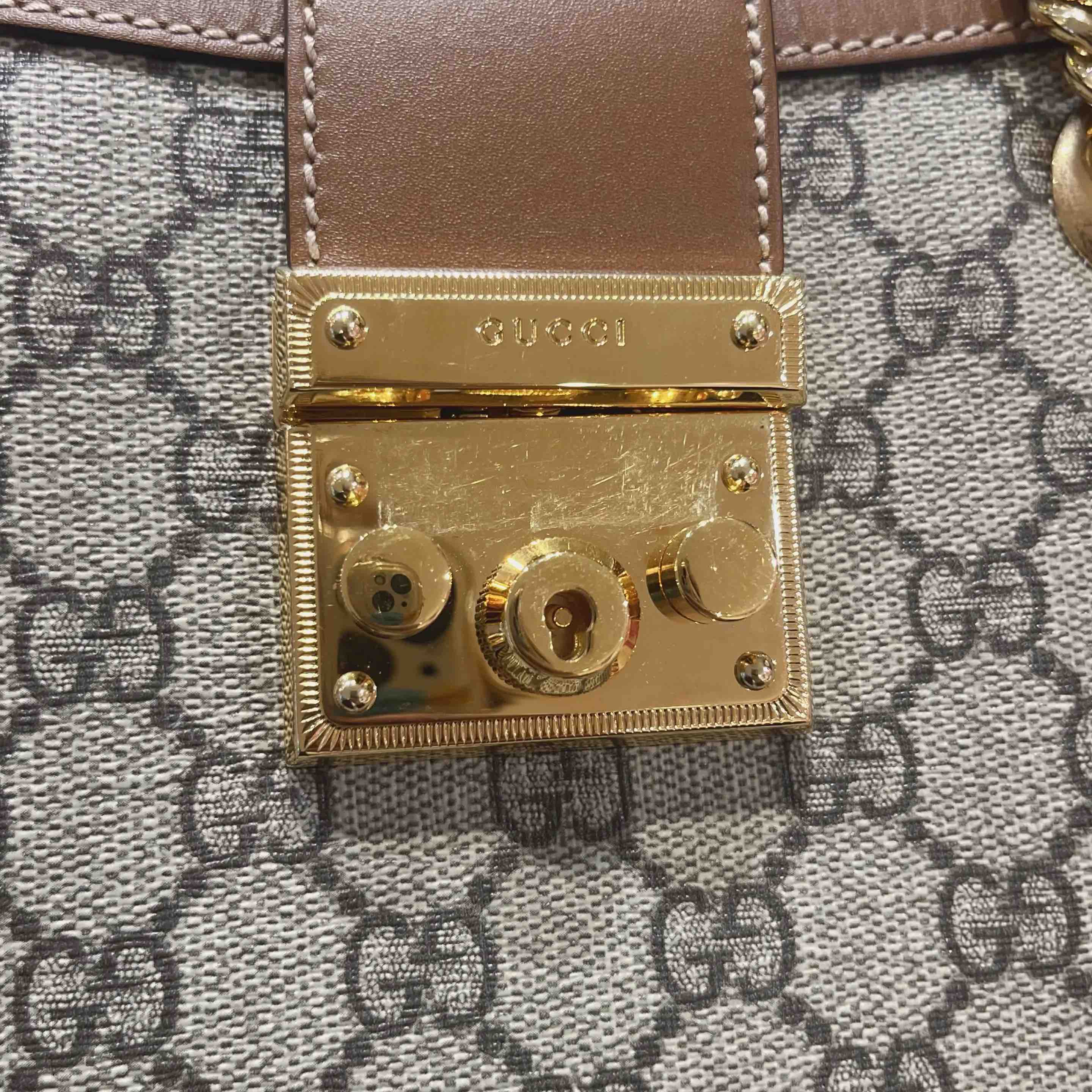 【商品详情】正品二手 GUCCI Padlock 棕色 老花 小号 斜挎包👜95新 26*18 配件:说明书 防尘袋。金属正常使用感。复古感十足