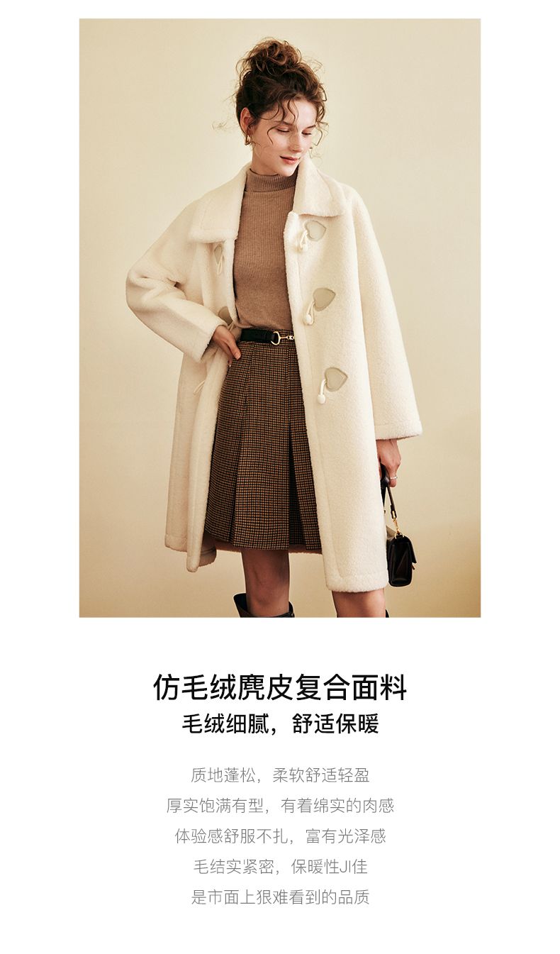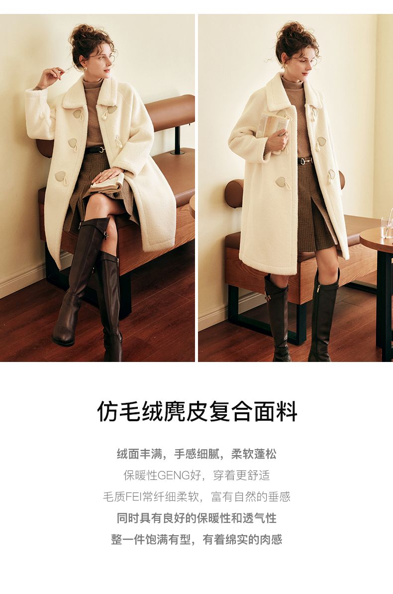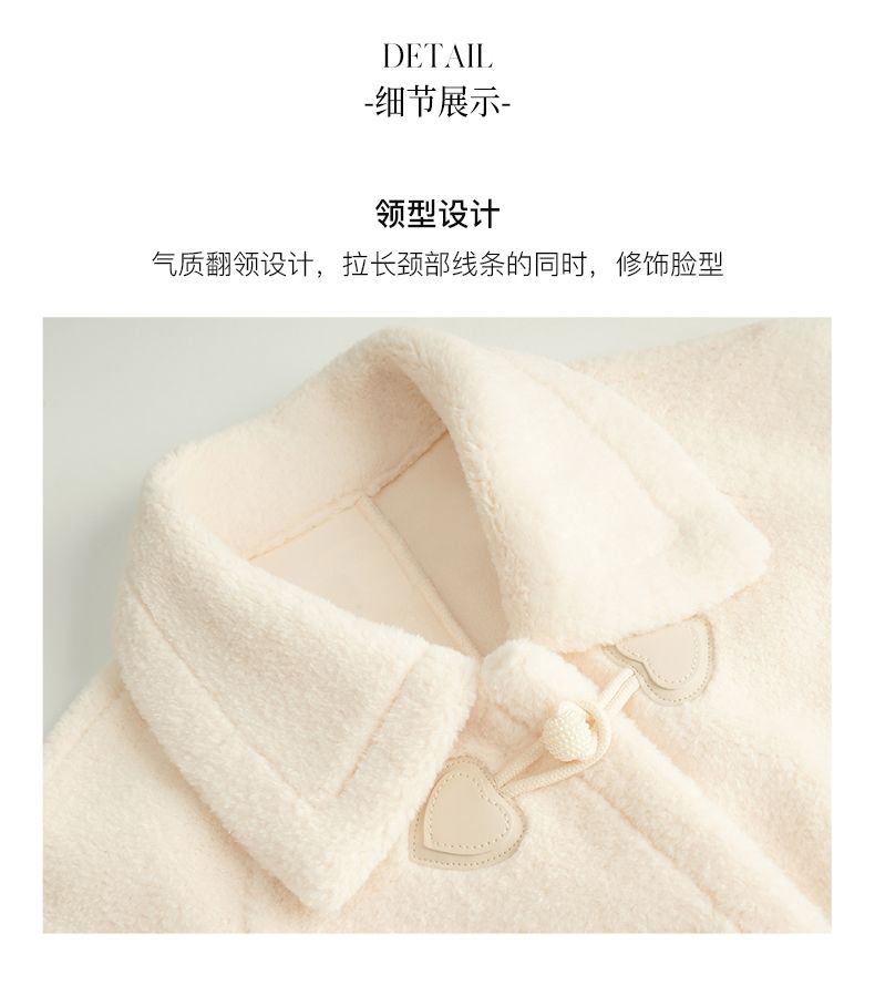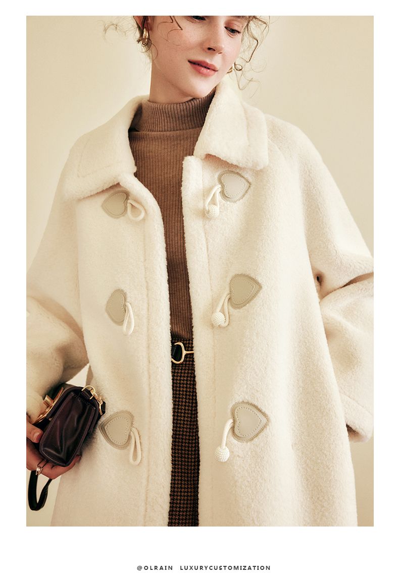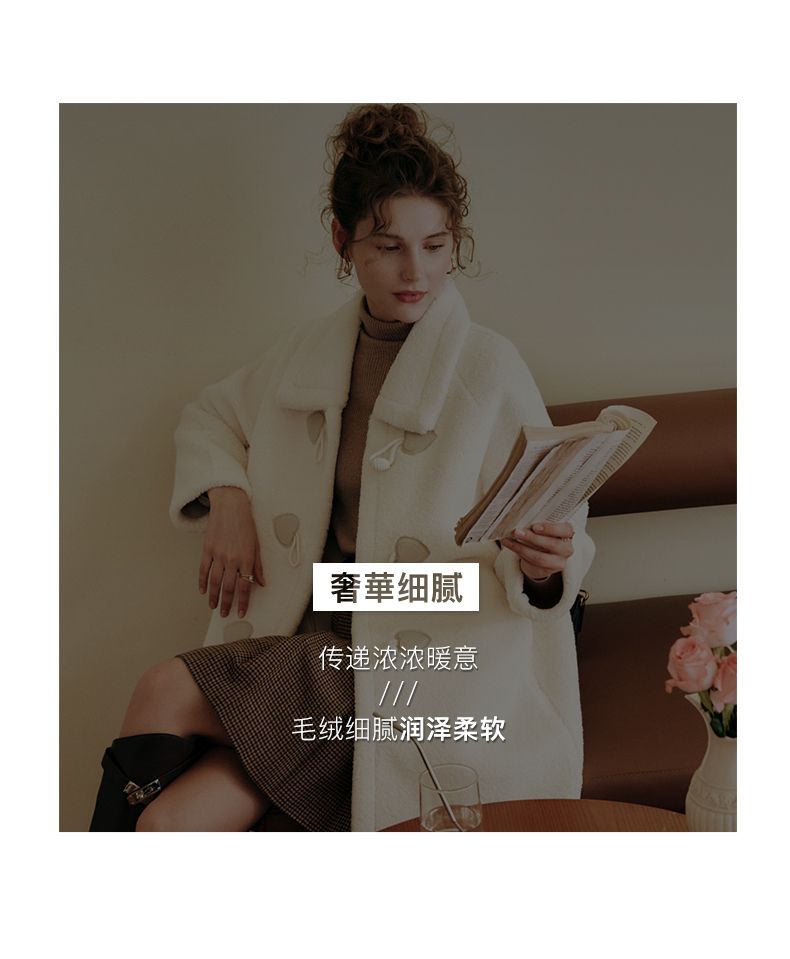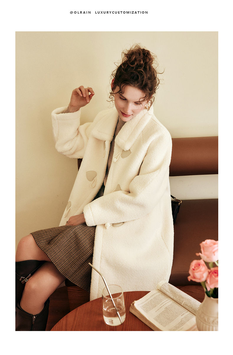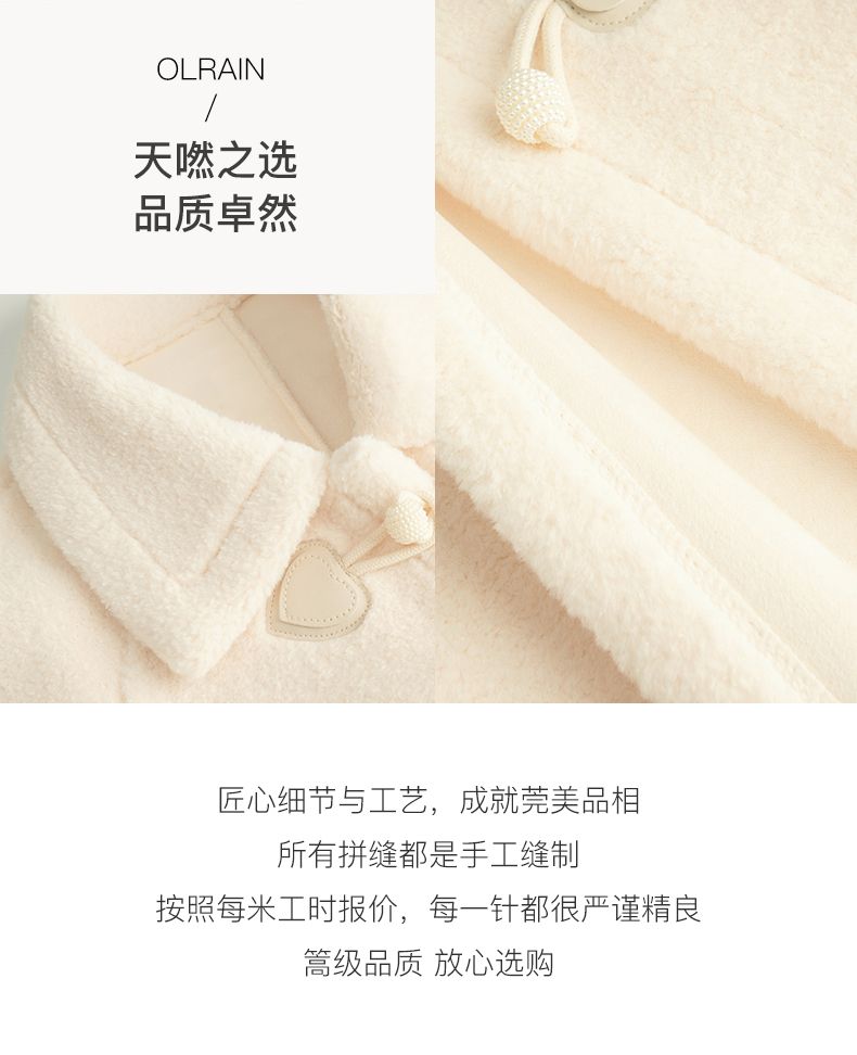 OLrain欧芮儿法式中长款皮草外套女秋冬2023年新款牛角扣加厚大衣