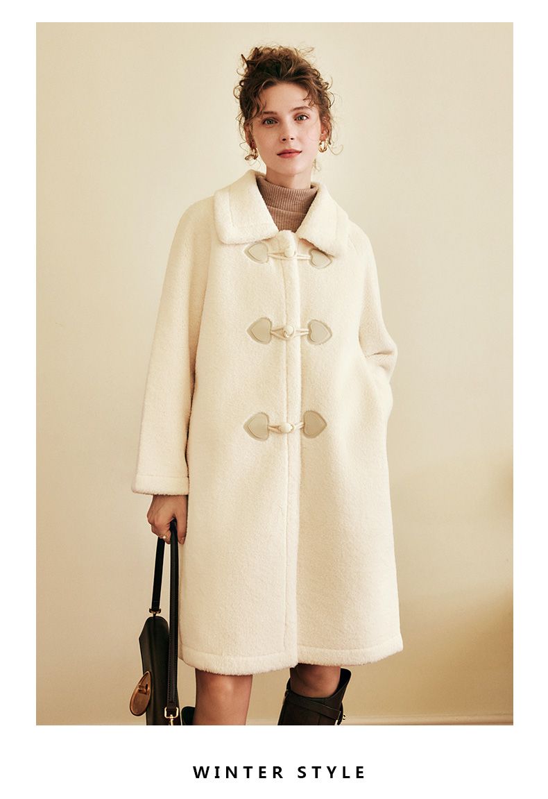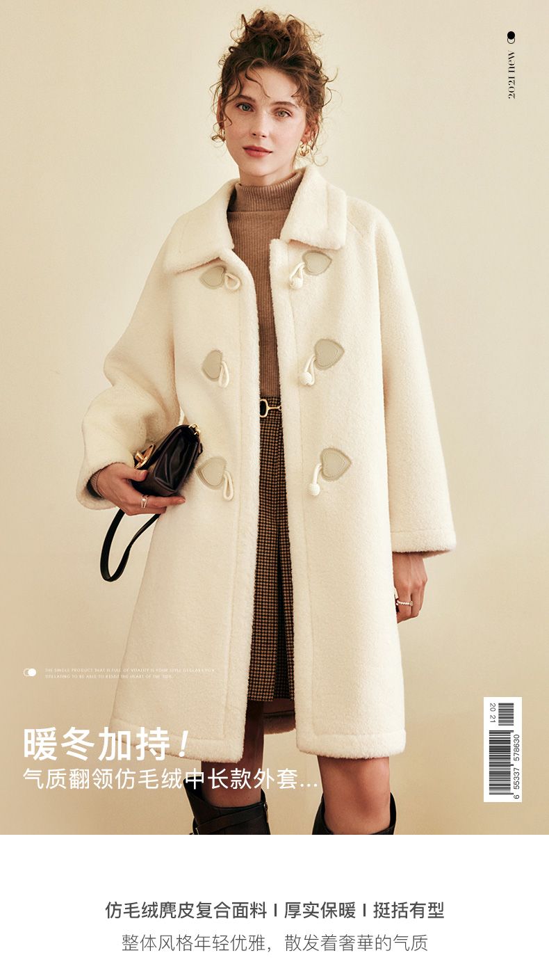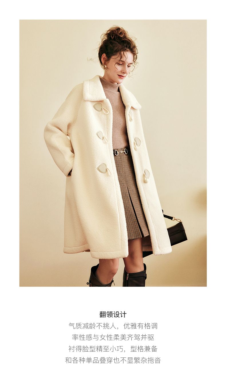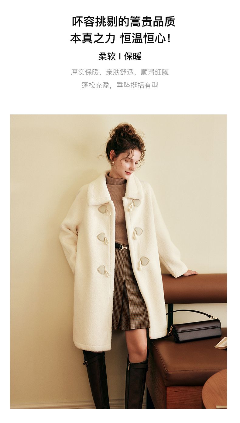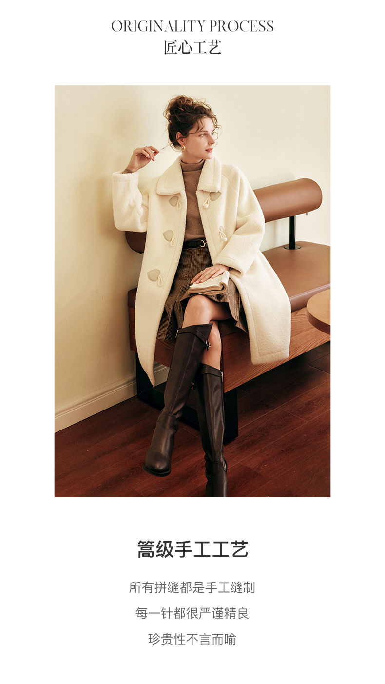 OLrain欧芮儿法式中长款皮草外套女秋冬2023年新款牛角扣加厚大衣
