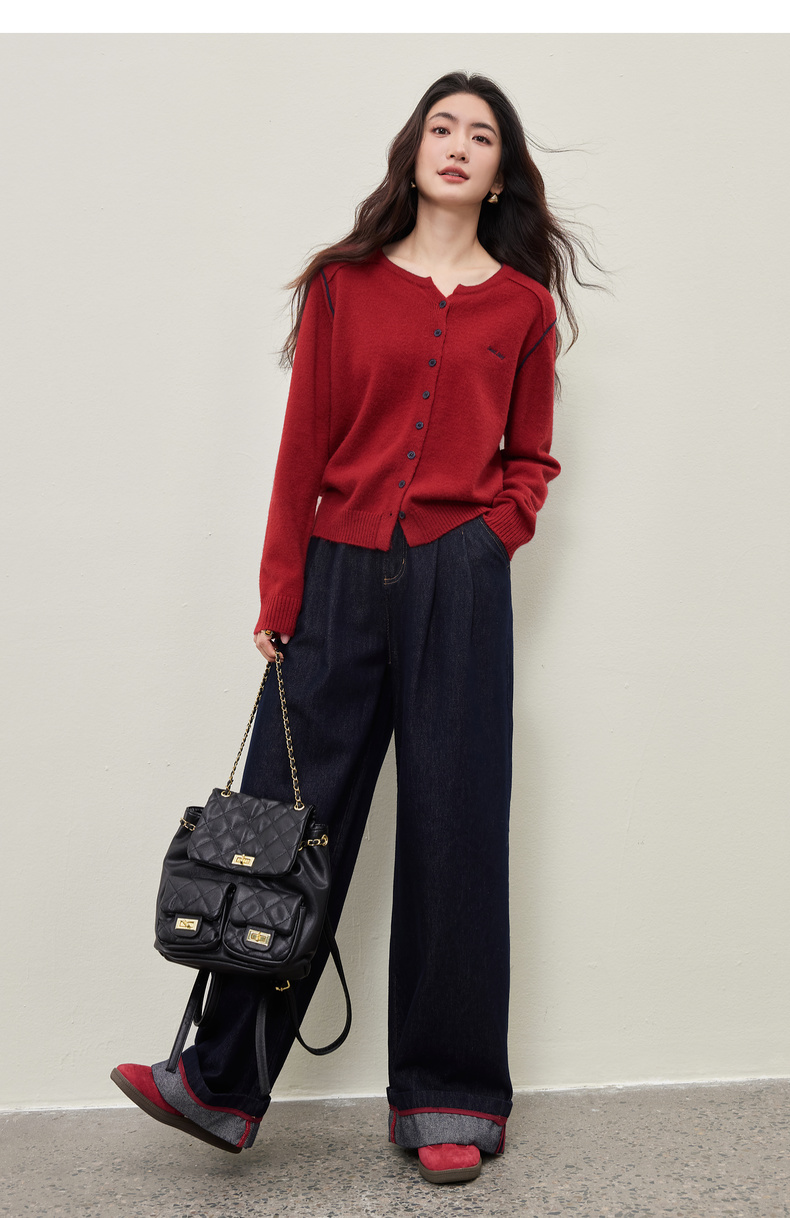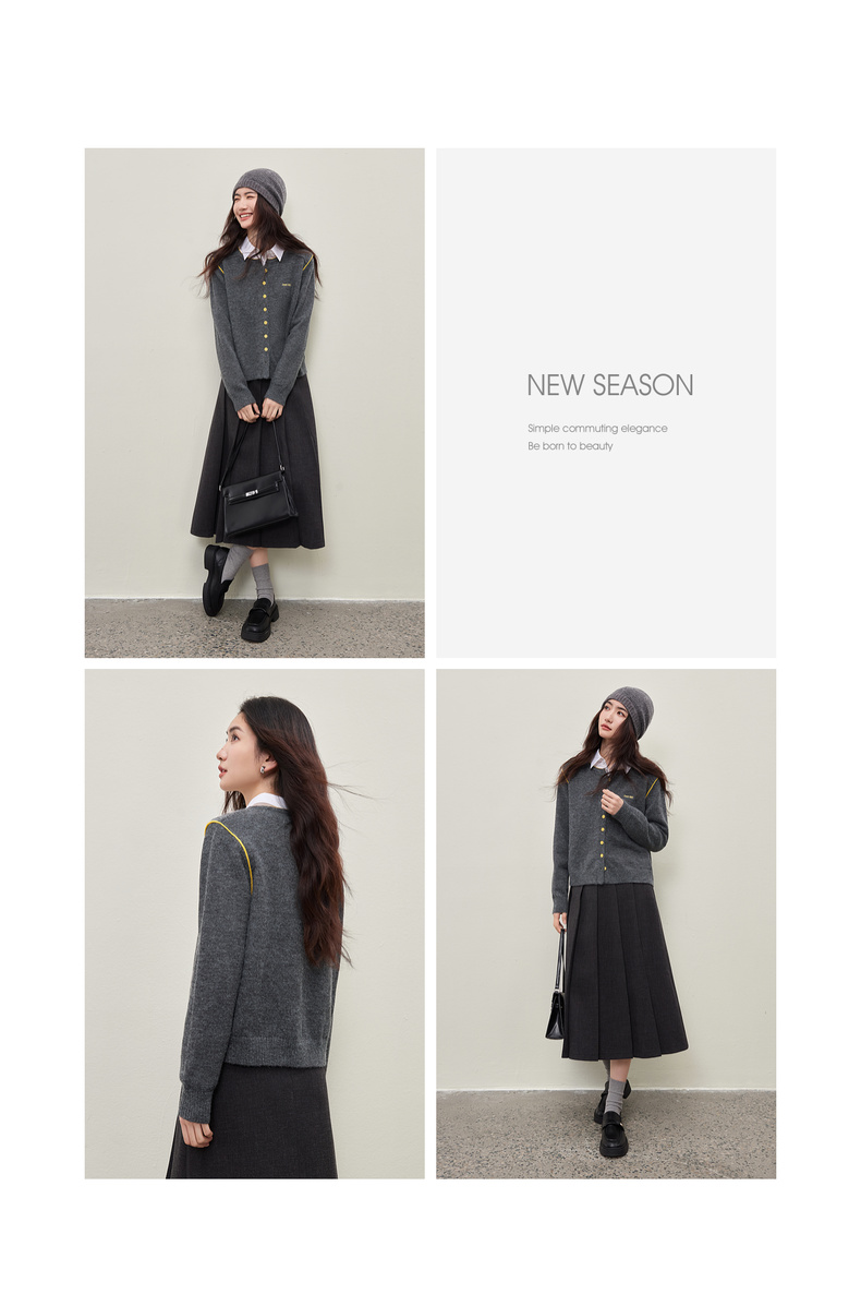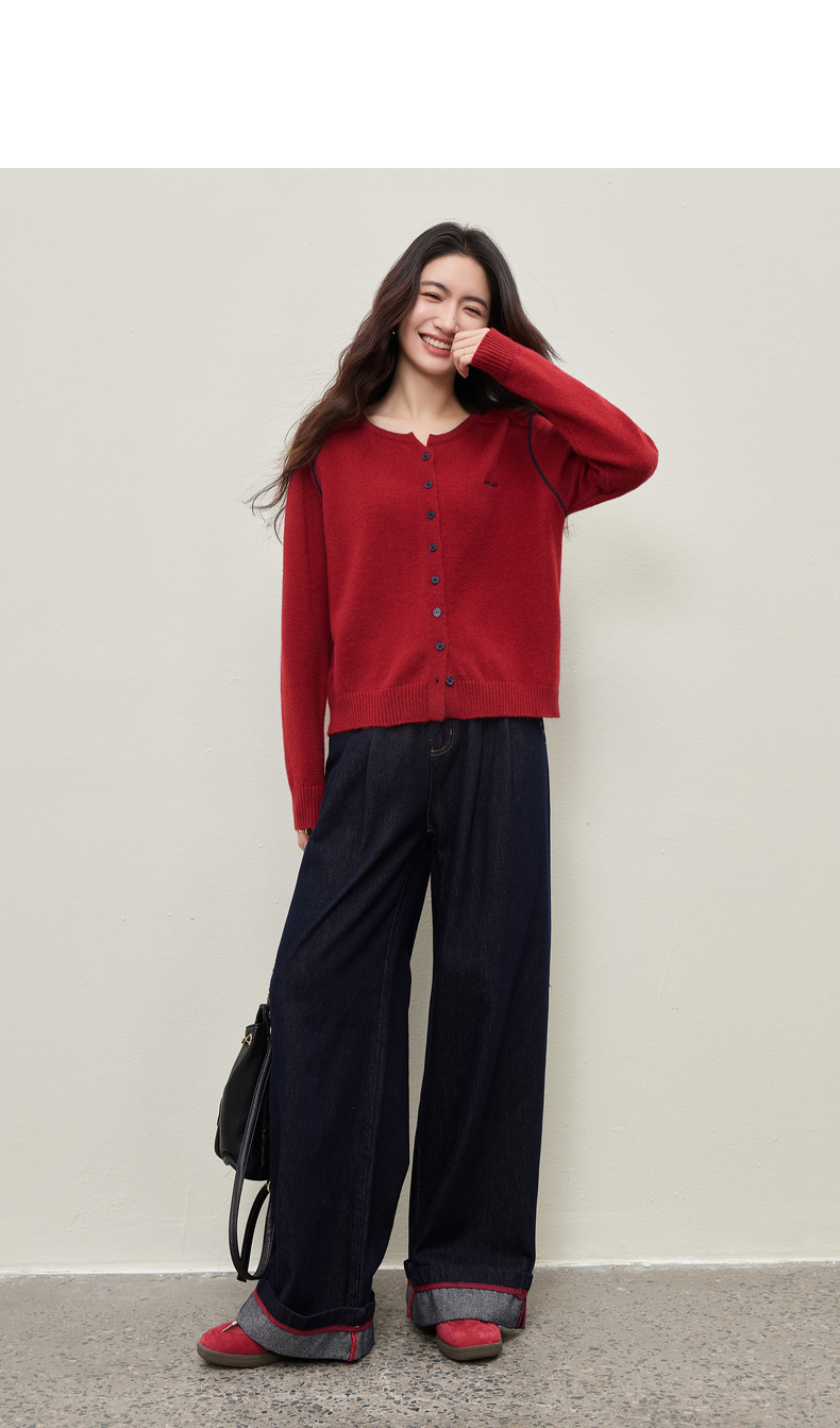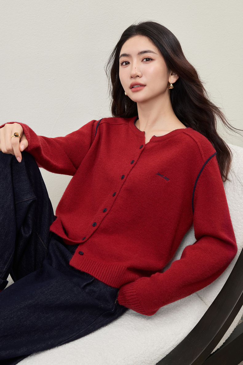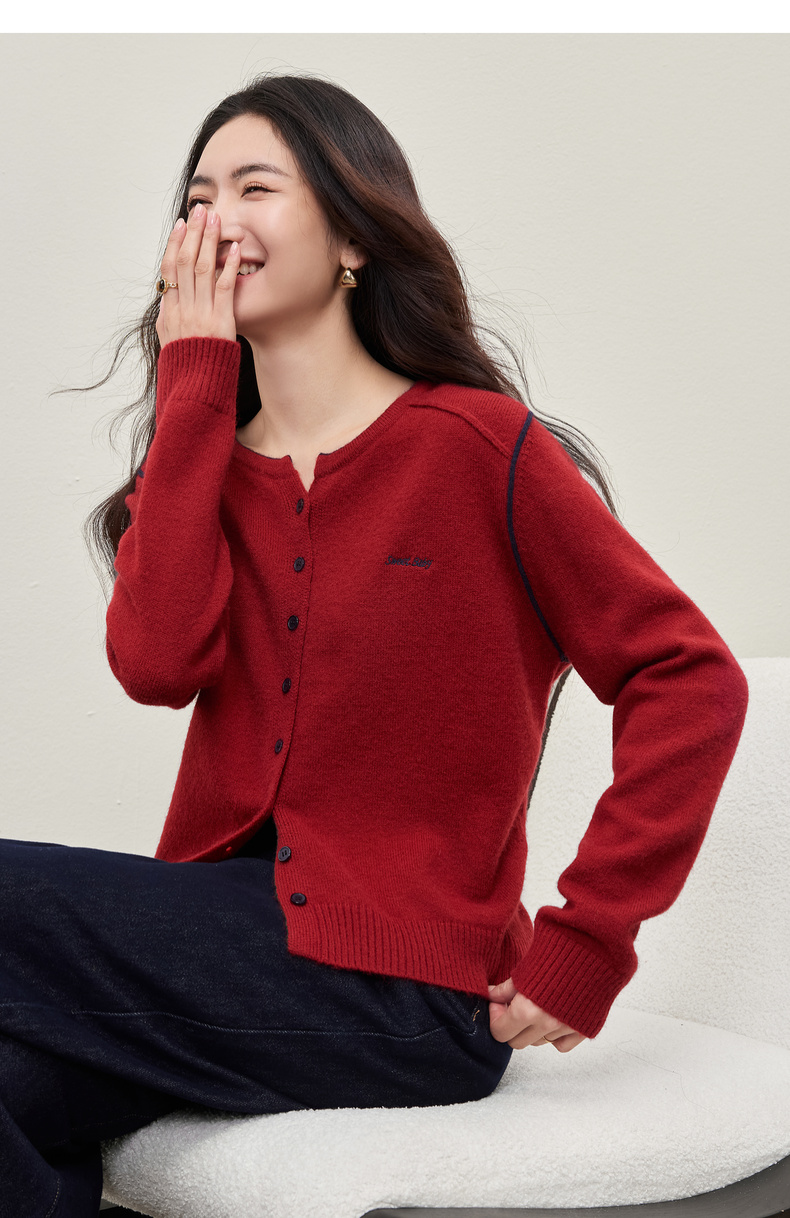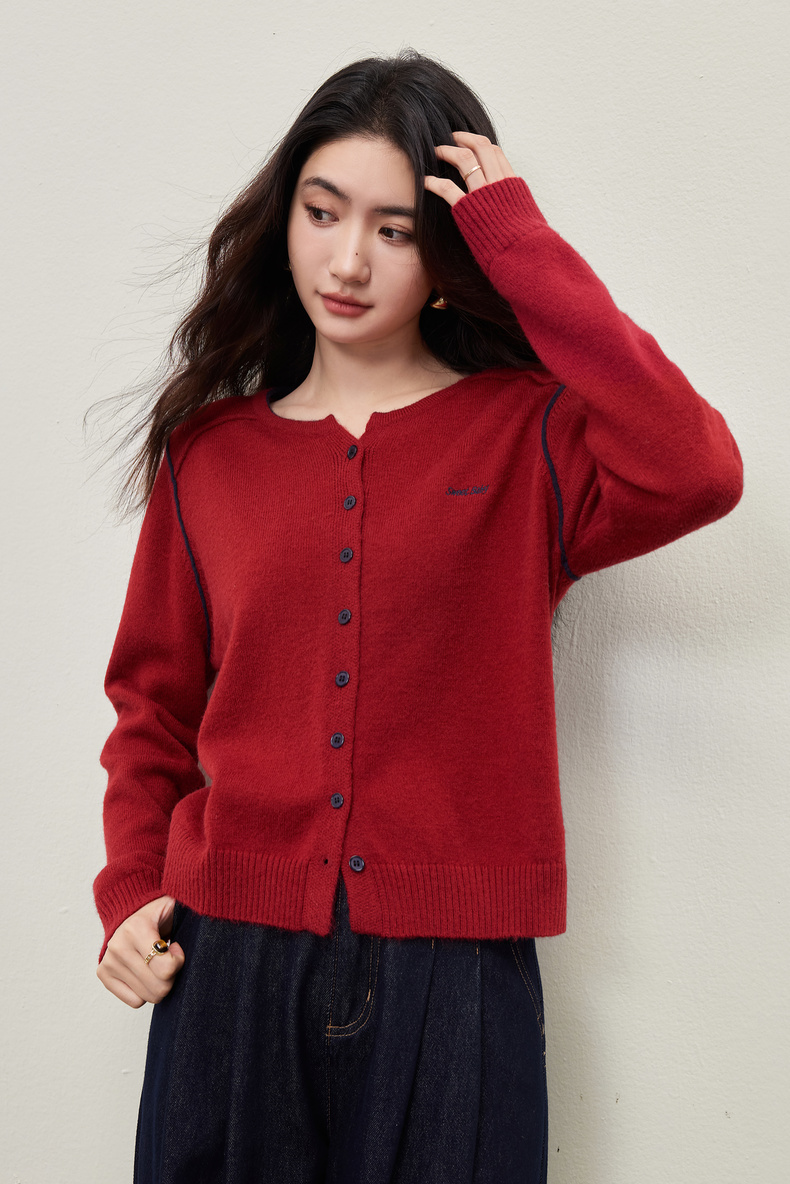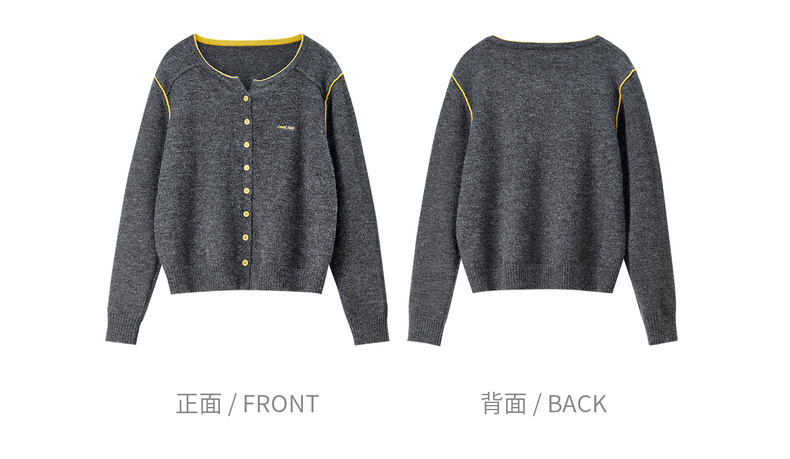 【内购】【撞色魔法】简约通勤圆领单排扣字母绣花宽松落肩显瘦厚开衫毛衣-W54ED4972