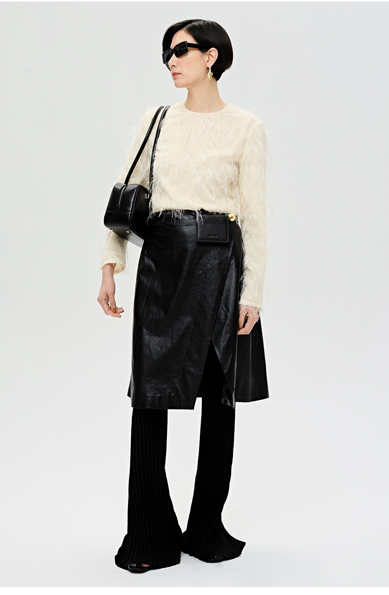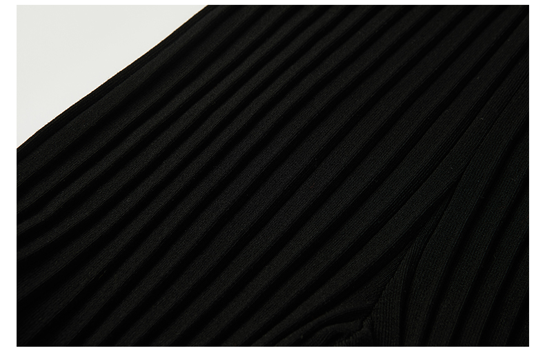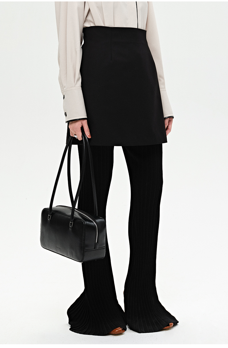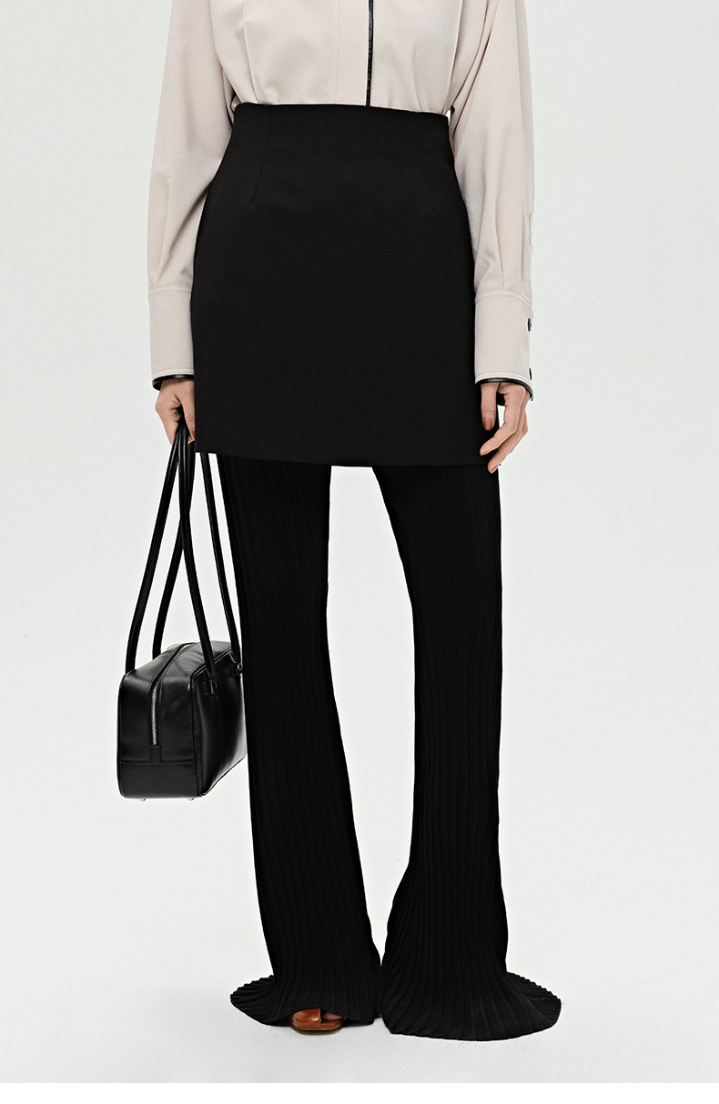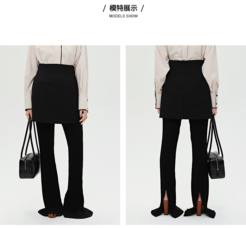HIDEMI 黑色竖条冰麻开衩喇叭神裤