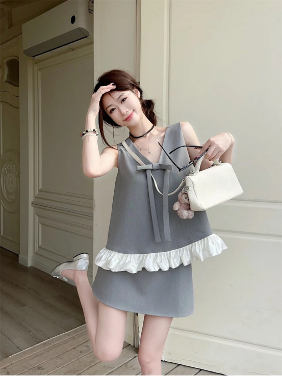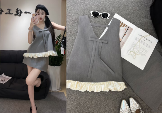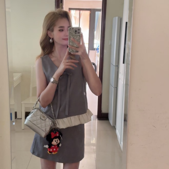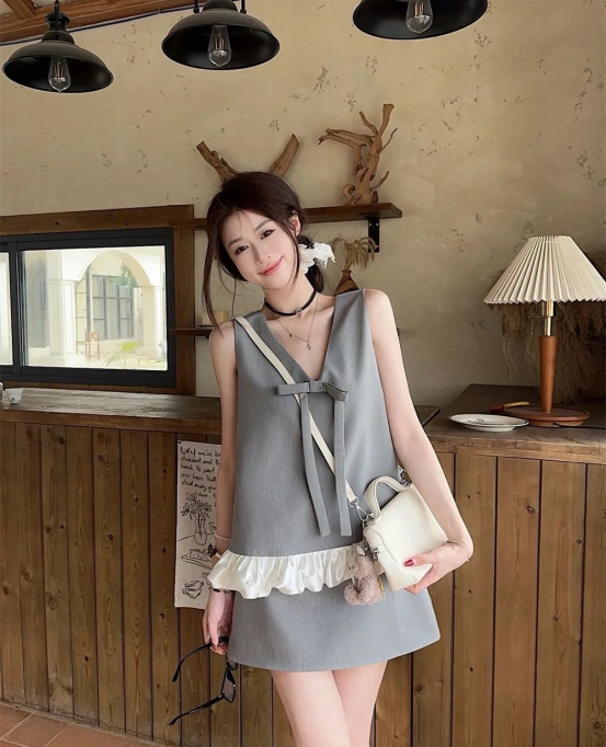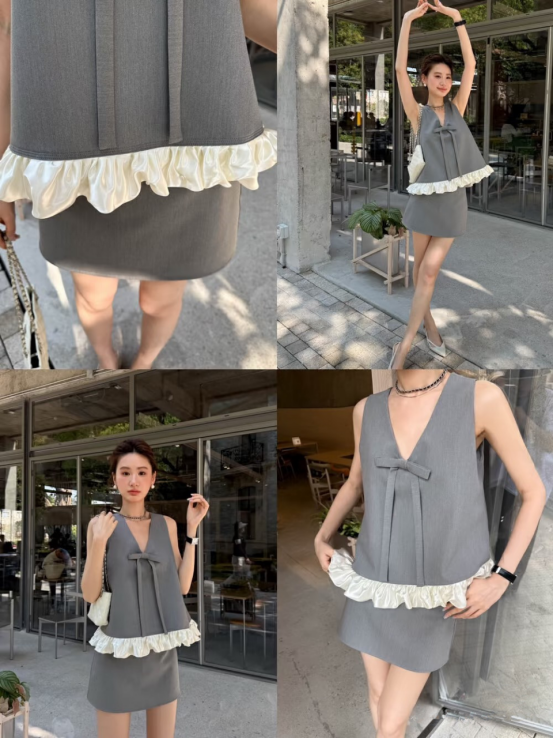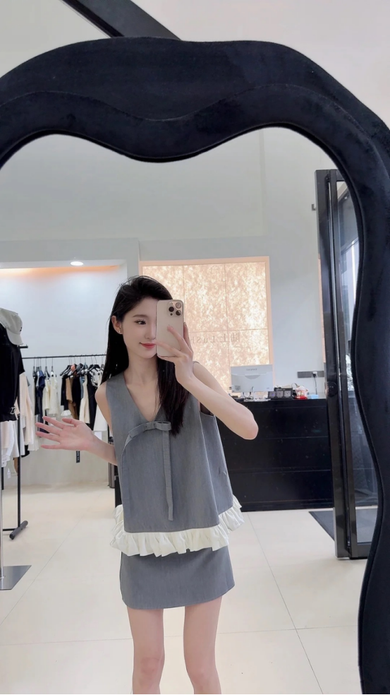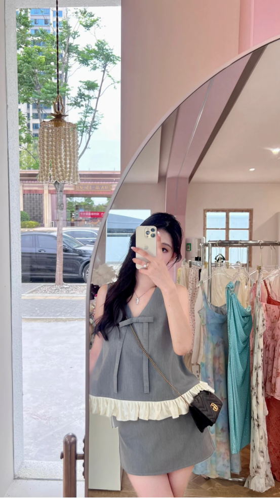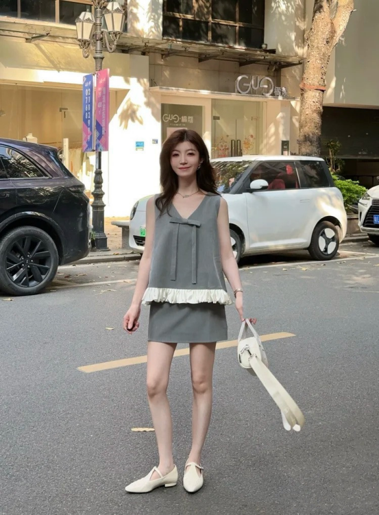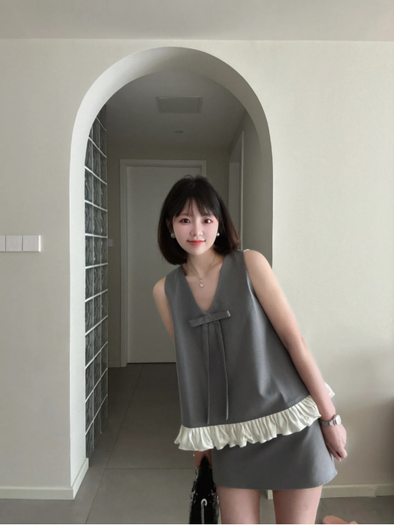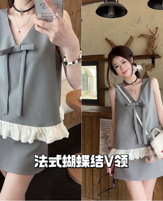 夏日氛围感拉满✨ 这套让我直接嫩回18岁! 谁懂啊家人们😭一到夏天就想穿得又凉快又显瘦, 翻遍衣柜终于挖到宝—— 这套法式蝴蝶结花边珍珠拼接西装裙套装 穿上秒变韩剧女主既视感~ 减龄显瘦直接拉满,必须按头安利给你们! 🌟【第一眼就心动的设计感】 V领小衫简直是方圆脸救星! 领口微微开叉露出锁骨, 心机又不暴露,搭配蝴蝶结设计 下摆珍珠花边拼接, 时尚高级就选他! 😎西装透气自带凉感面料 35℃高温穿出门都不闷热, 出汗也不黏身~ 下装是高腰包臀休闲短裙 做了高腰剪裁, 胯宽星人穿上秒变“纸片人”, 走路带风的垂坠感绝了~ 一套直接秒变可爱减龄气质乖乖女!
