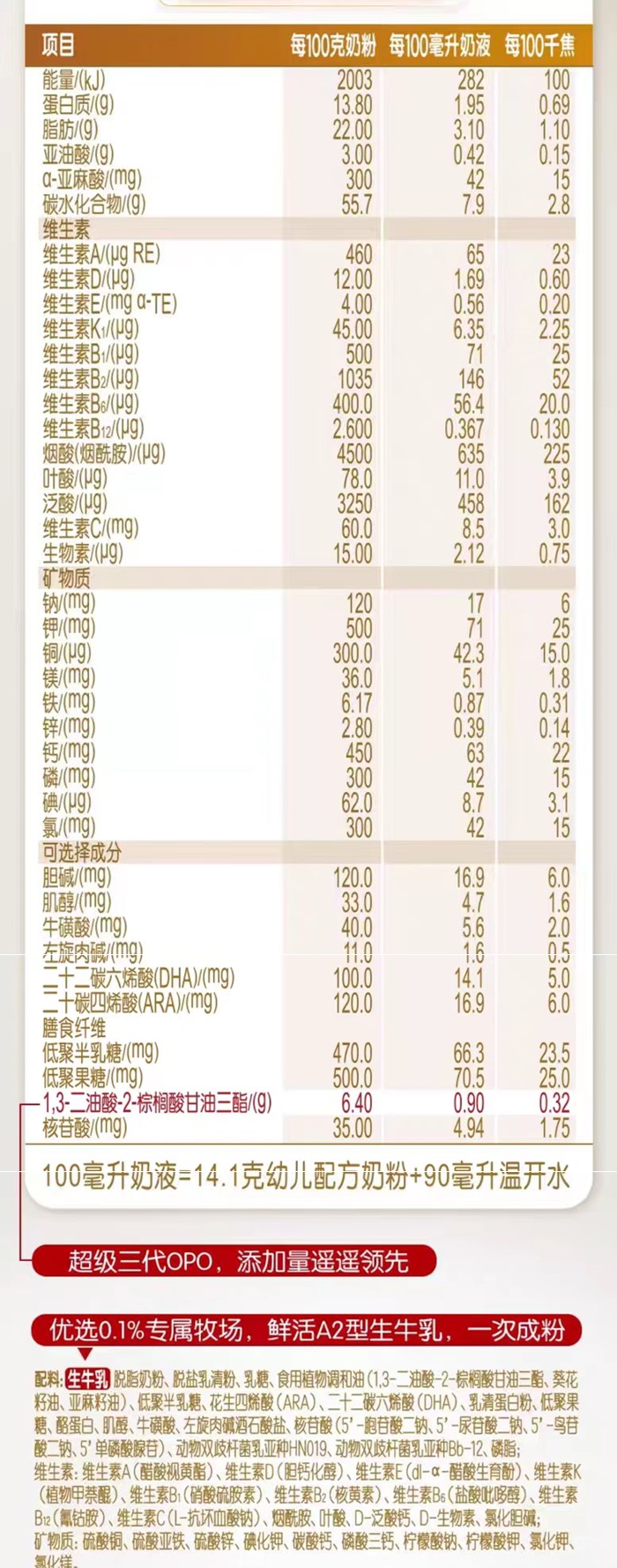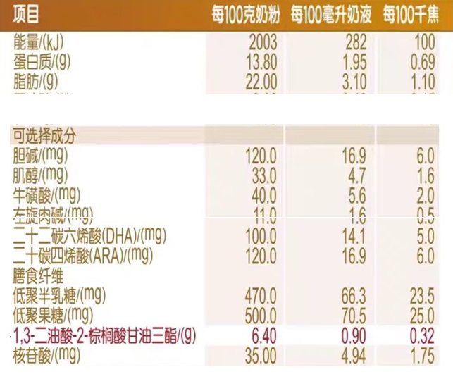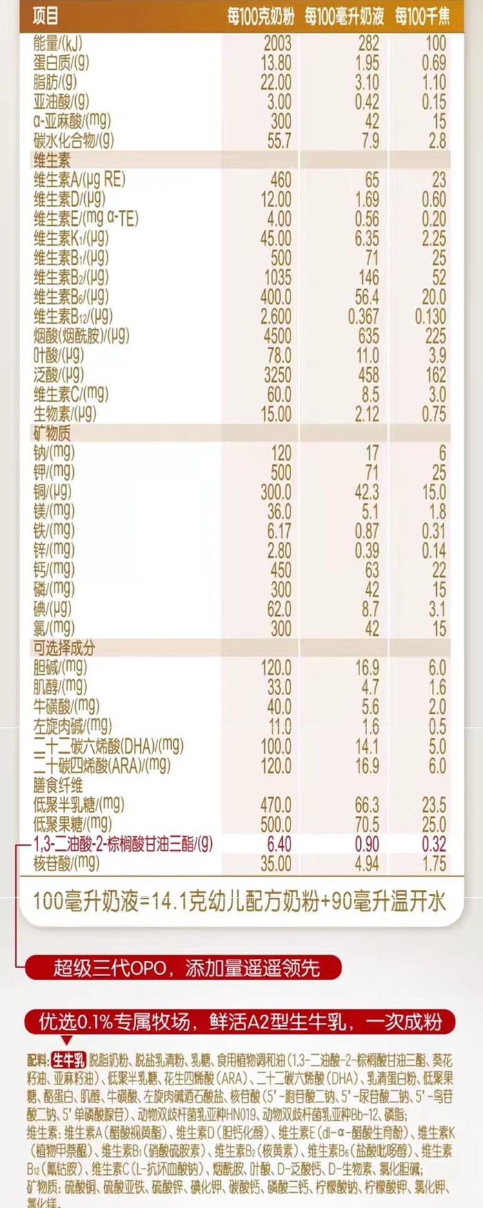 2.OPO含量在婴儿配方奶粉含量中较高,达到了每100克含量6.4克;