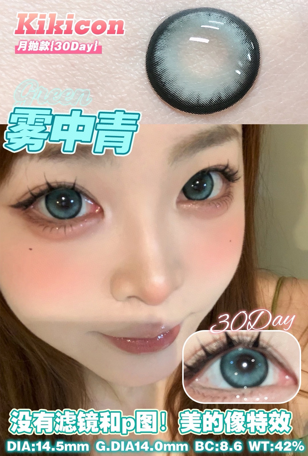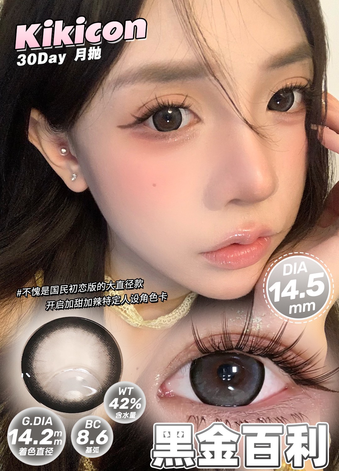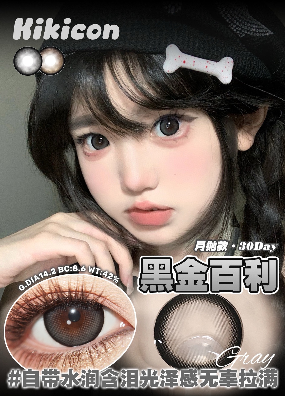 高舒适月抛Kikicon美瞳黑灰色 蓝巧