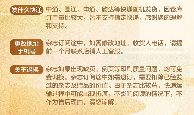 2026年一月刊(第1期+第2期),预计2026年1月15日前发货,如超期未收到杂志,您可以联系店铺人工客服,查询杂志的发货物流信息。订阅期内,每月15号前发当月的两本杂志,如遇春节等节假日发货稍有延迟,感谢您的理解与支持