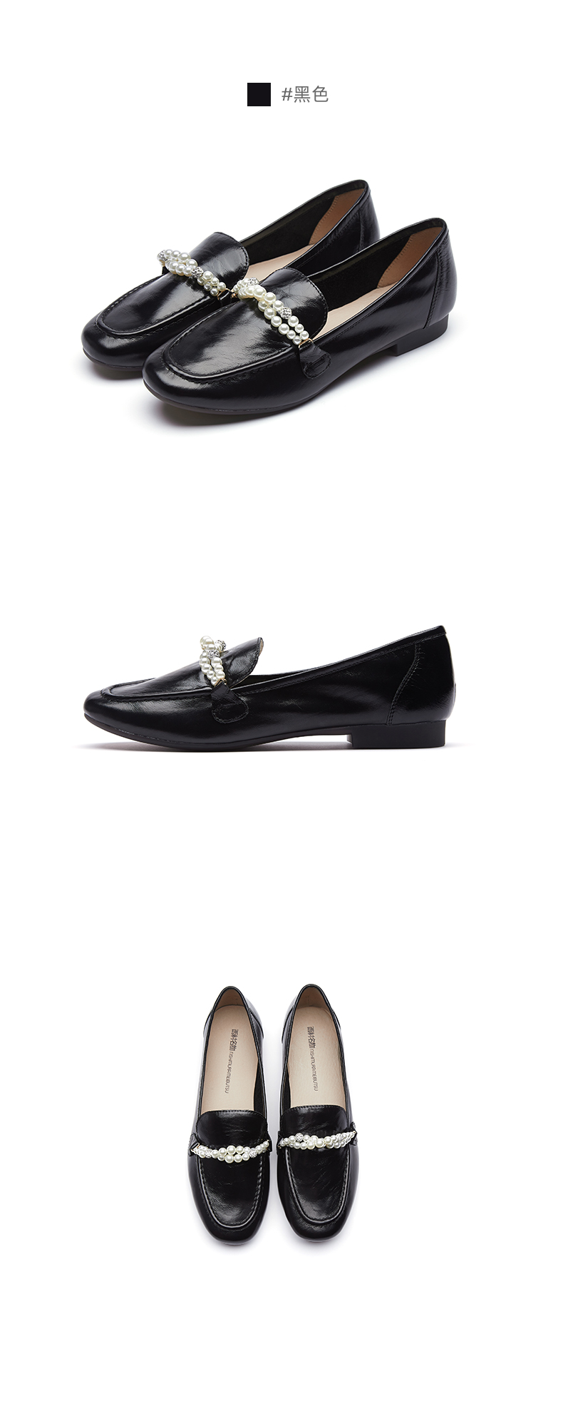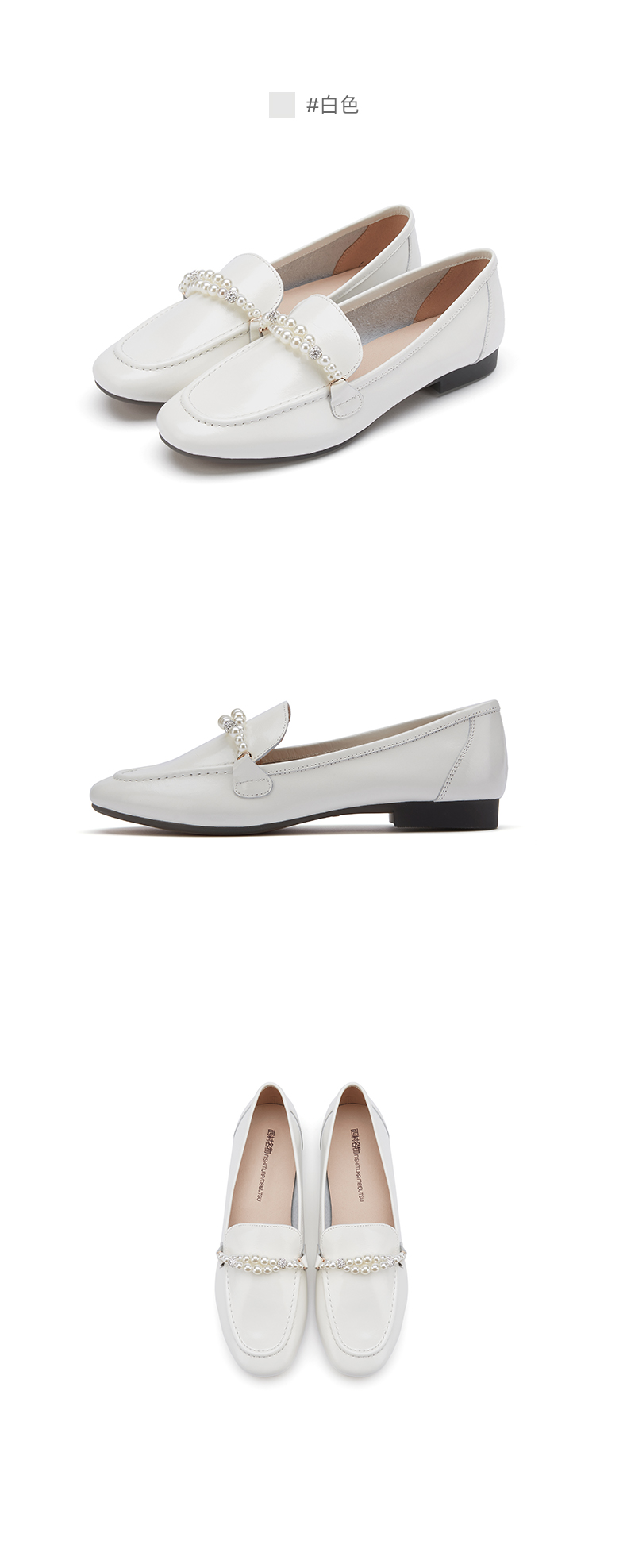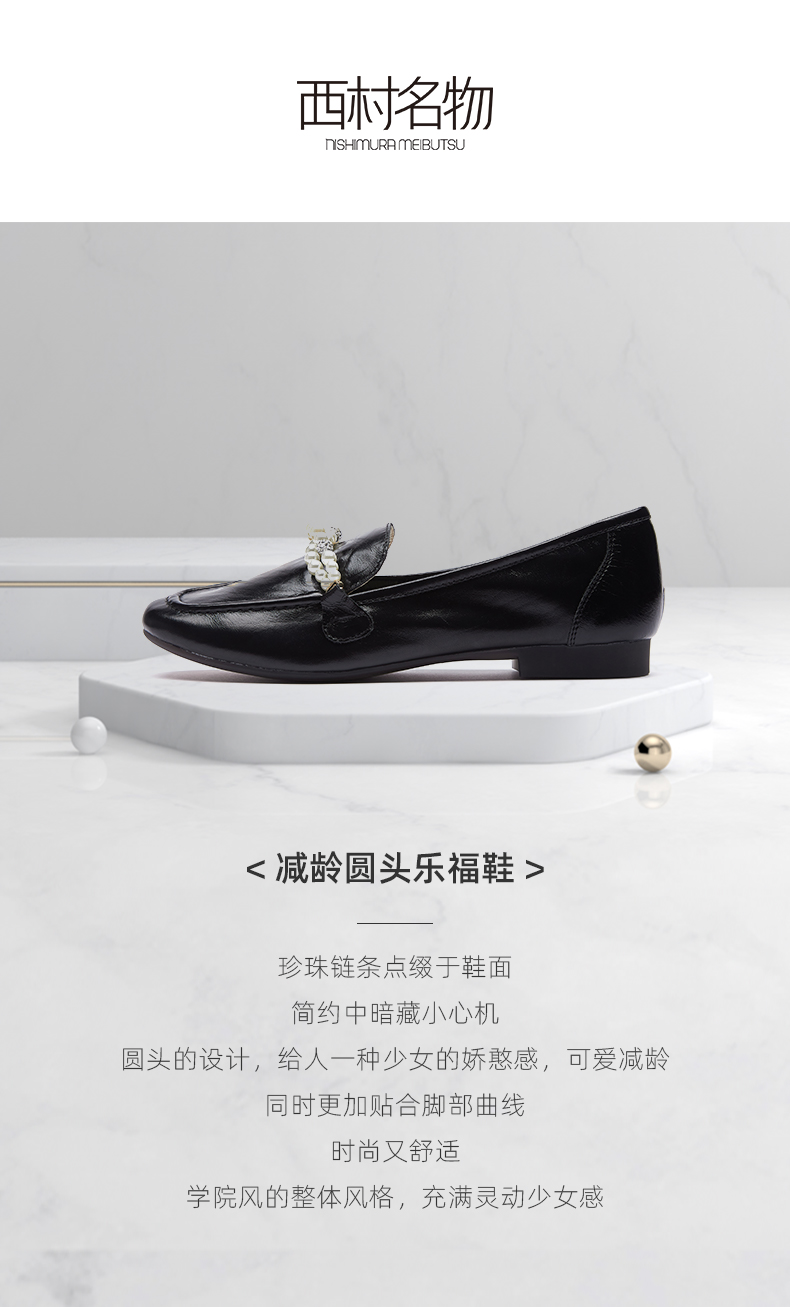西村名物2021秋季新款方头真皮乐福鞋女反绒珍珠链平底单鞋T21CM34001