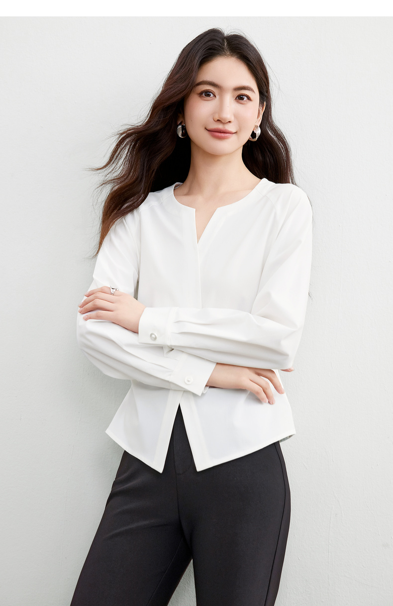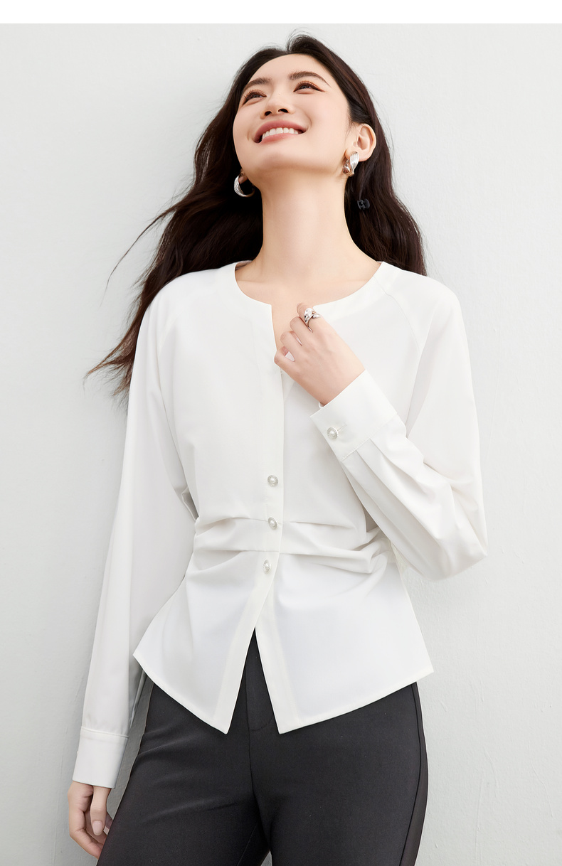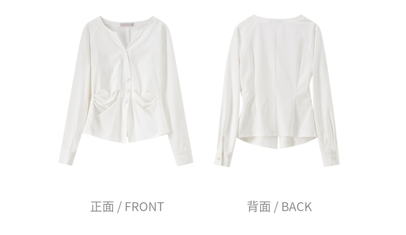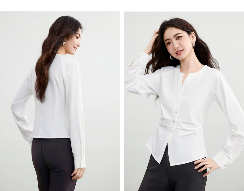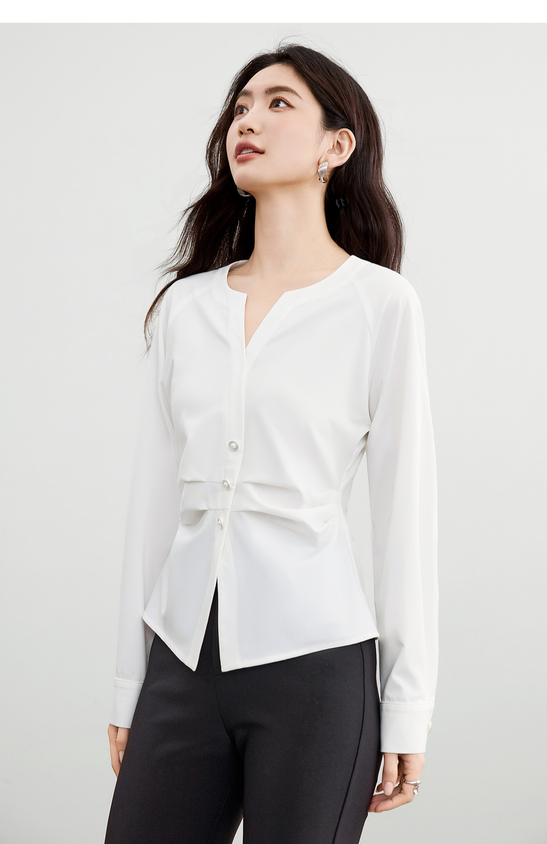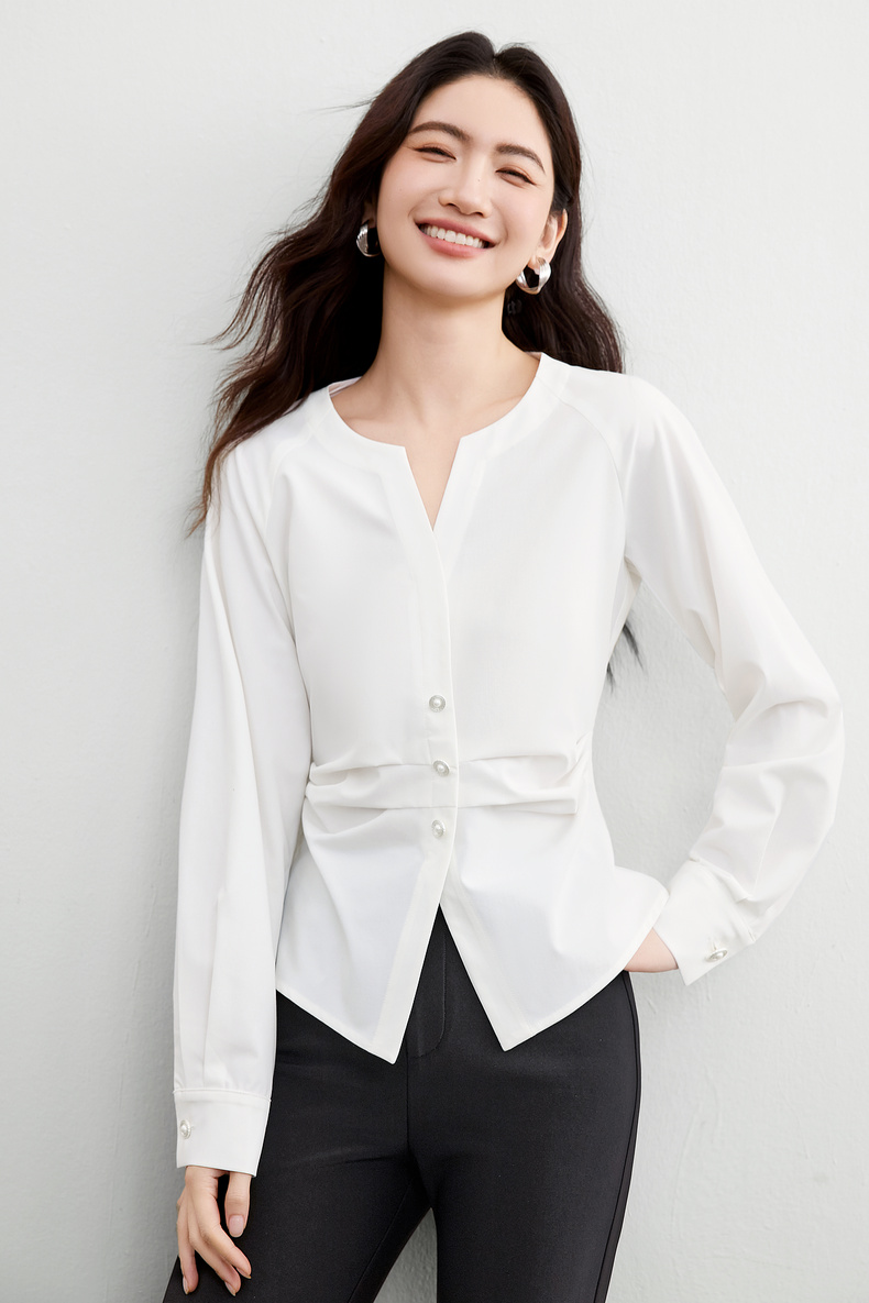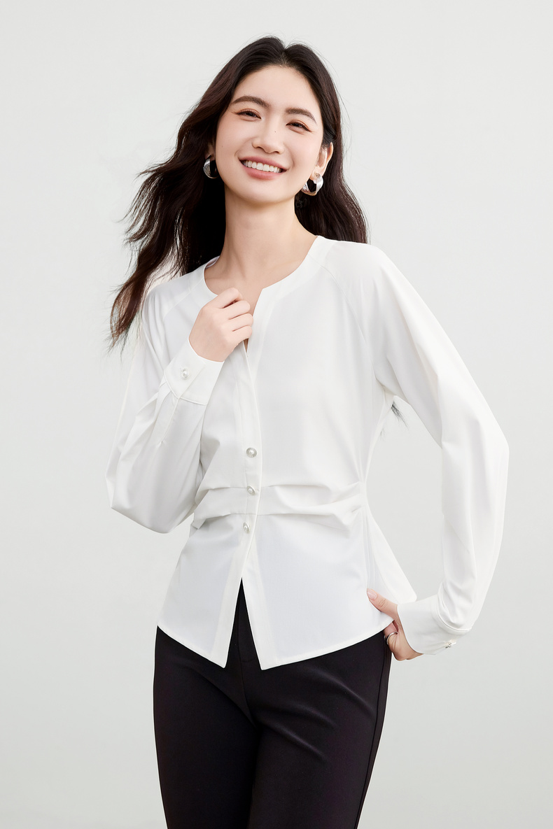 【内购】【立裁设计】优雅通勤圆V领金属扣假门襟捏褶设计修身长袖薄衬衫-153CB3058