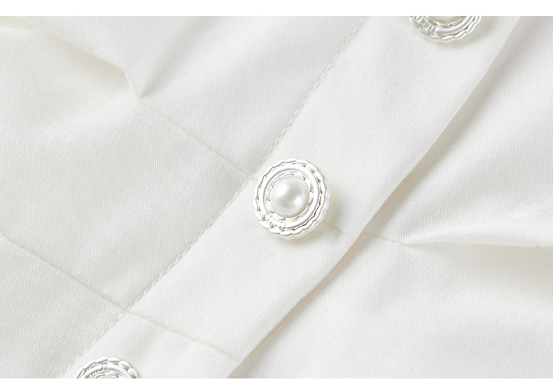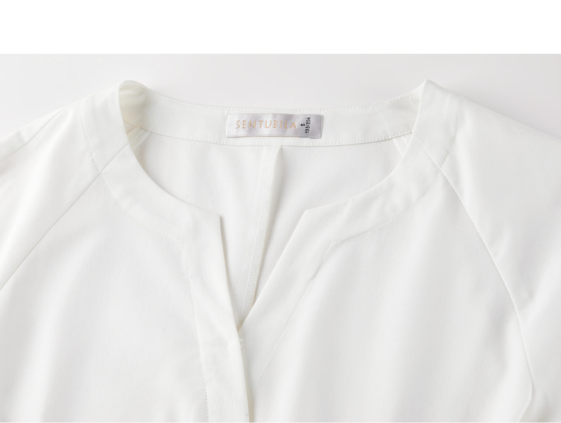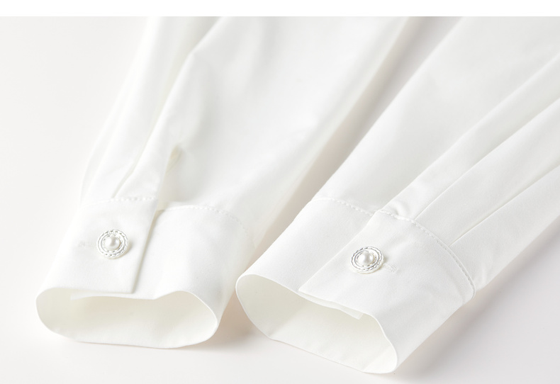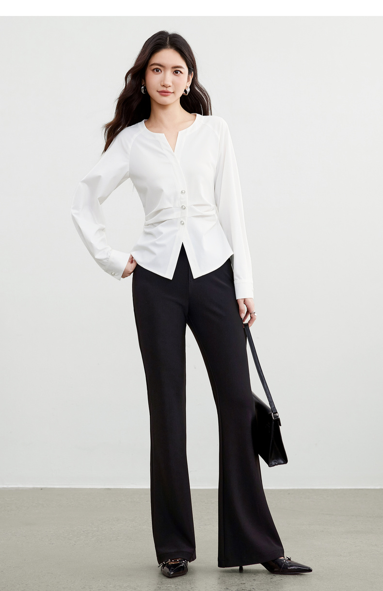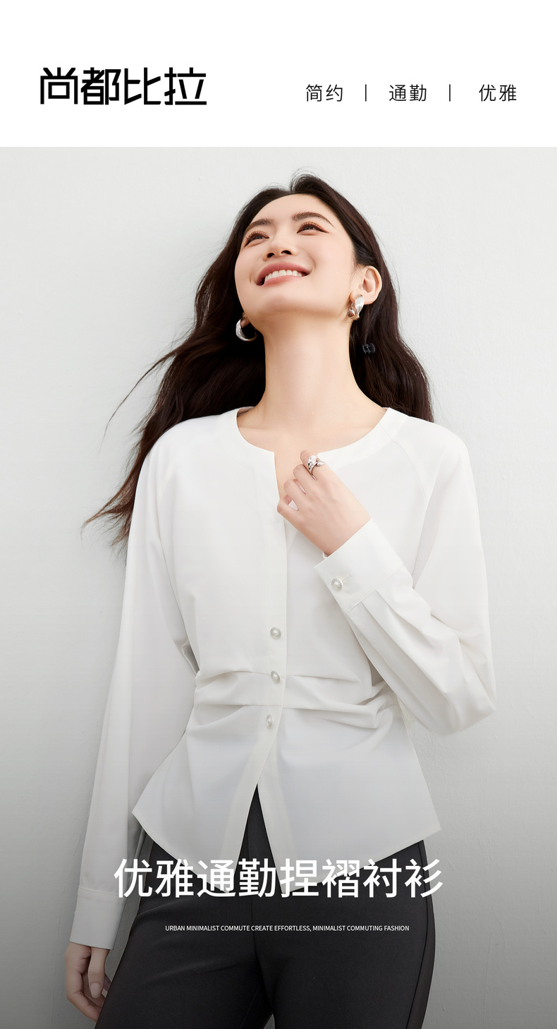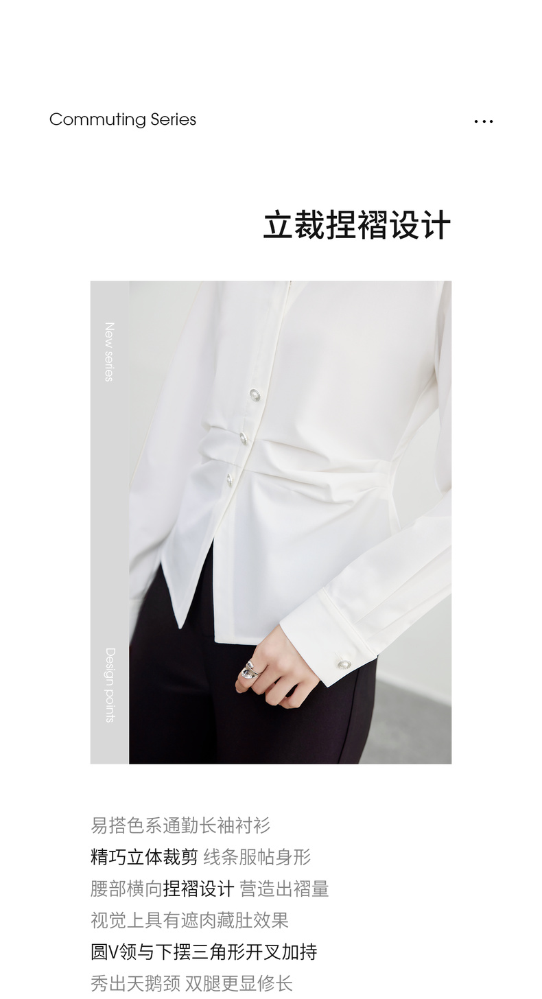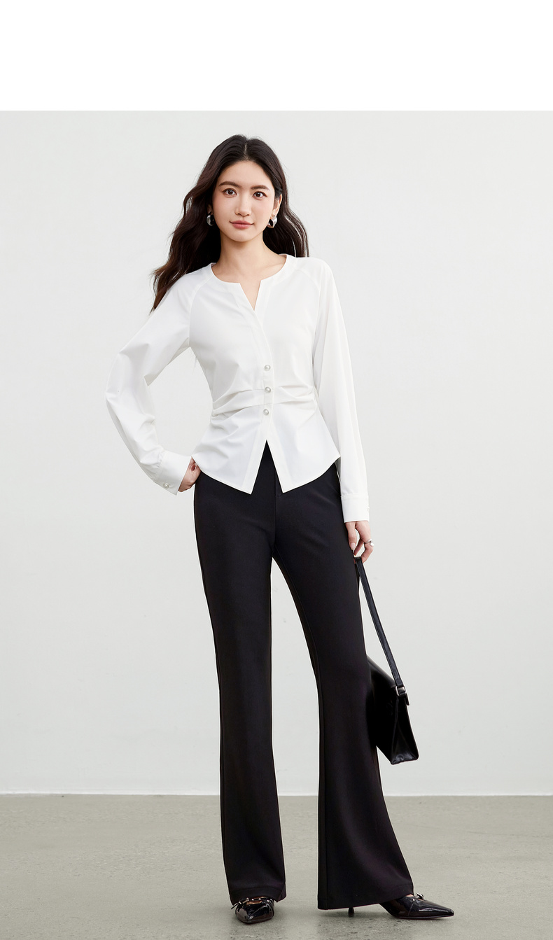 【内购】【立裁设计】优雅通勤圆V领金属扣假门襟捏褶设计修身长袖薄衬衫-153CB3058