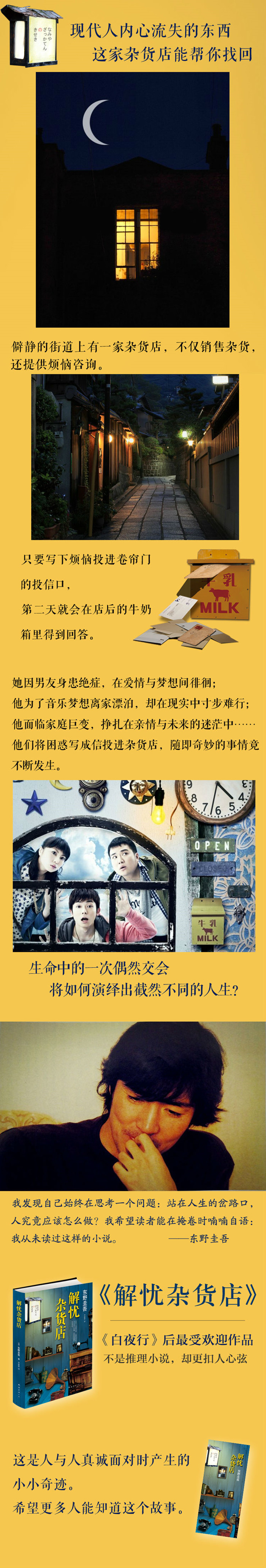 日本著名作家东野圭吾的《解忧杂货店》,出版当年即获中央公论文艺奖。作品超越推理小说的范围,却比推理小说更加扣人心弦。