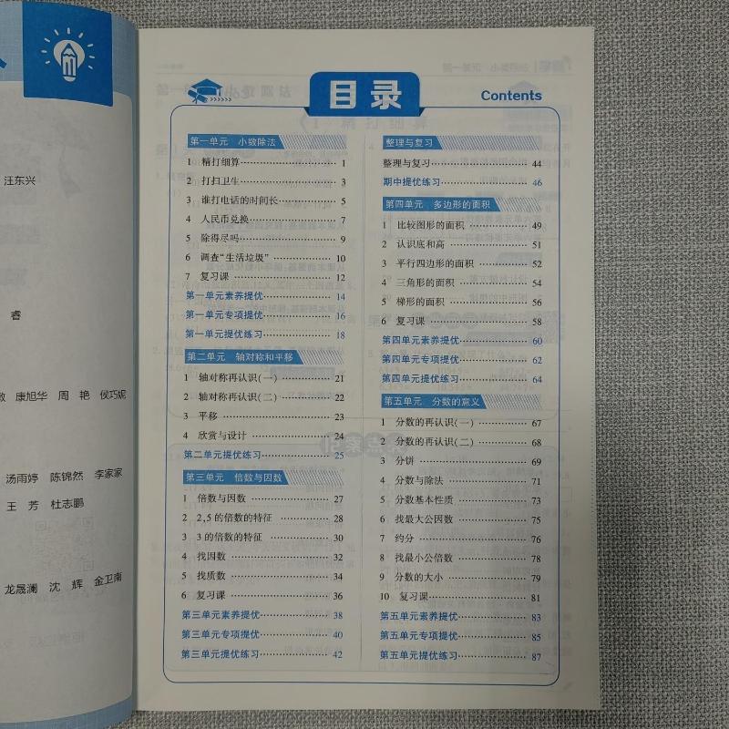 本书定位于北师版数学五年级上册的同步提优训练,按课时编写,配合教材中小数除法、轴对称和平行、倍数和因数、多边形和组合图形的面积、分数的意义和可能性等章节设置系统训练。每个章节设有章末测试卷,期末设有期末测试卷。本书采取三关编写结构,练速度、练准确率、练思维,逐层递进,逻辑清晰,符合学生学习的认知规律。在每个练习中,知识点覆盖全面,题型丰富,考查角度新颖,重难点突出,注重知识训练与数学解题方法、数学思想的融合。