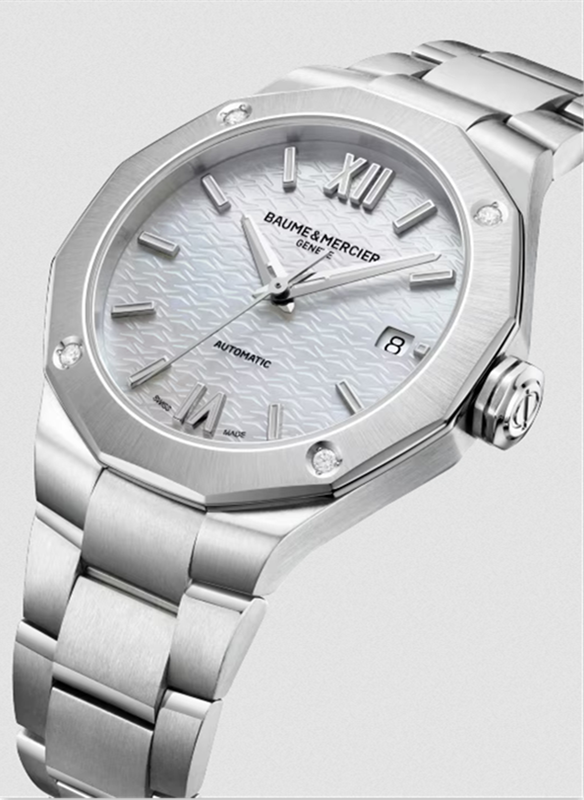 镜面材质 | 蓝宝石水晶玻璃 | 表盘 | 抛光与缎面打磨的精钢表壳 白珍珠贝母色表盘 以4颗钻石固定的精钢表圈 罗马数字和棒状时标 日期显示 |