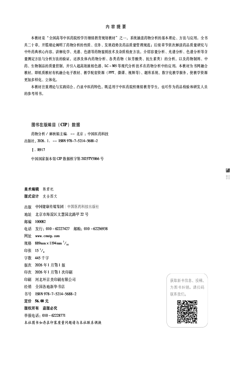 药物分析 麻秋娟 主编 全国高等中医药院校学历继续教育规划教材 供药学类专业用 中医药 教材 9787521456882 中国医药科技出版社
