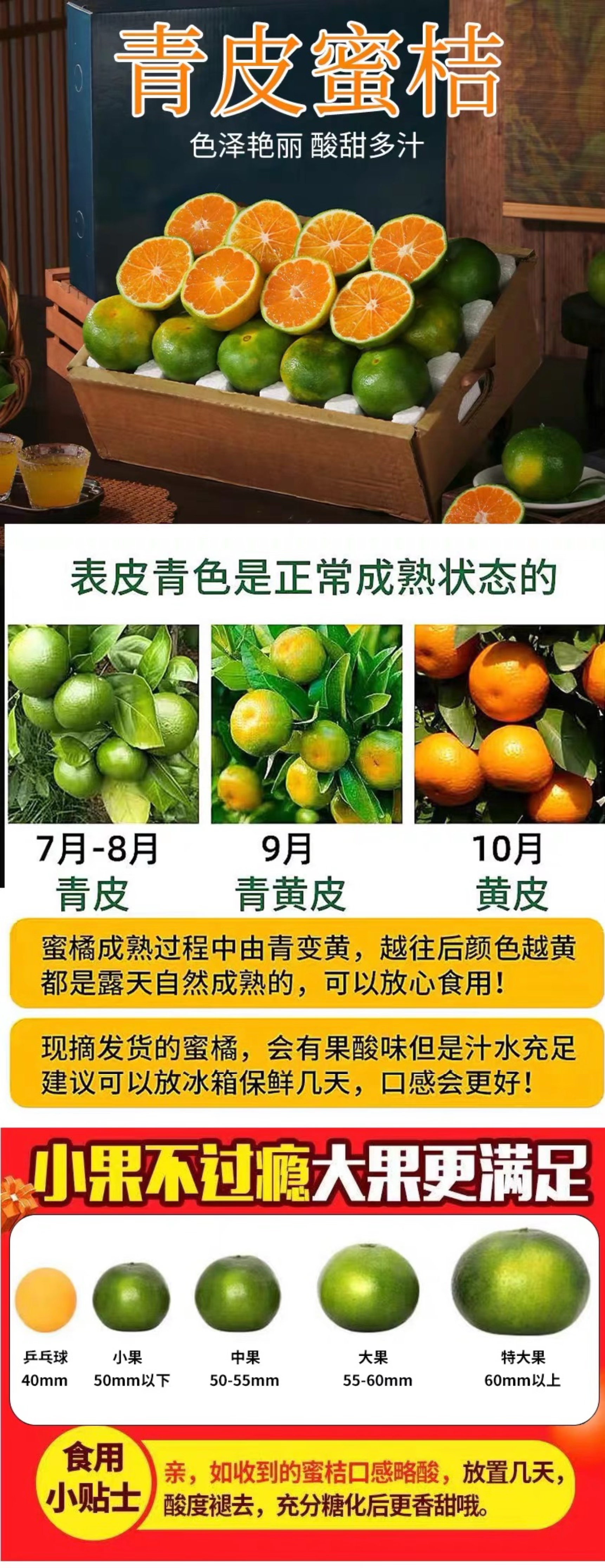 【品名】寻乌蜜桔 【产地】赣州 【发货地】赣州 【包装】彩箱 【发货时效】72小时内 【发货快递】普快随机 【售后标准】发货后不退不换不拦截不拒收,到货后请24小时内取货;如有质量问题请24小时内拍照(坏果+面单 缺一不可),无图片、超时不售后! 【说明】8.9月果子较青,甜度约12度,到货后放置几天味道更好! |
