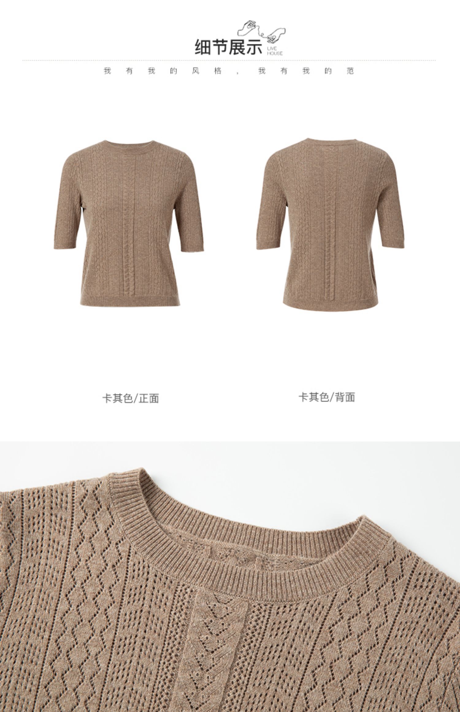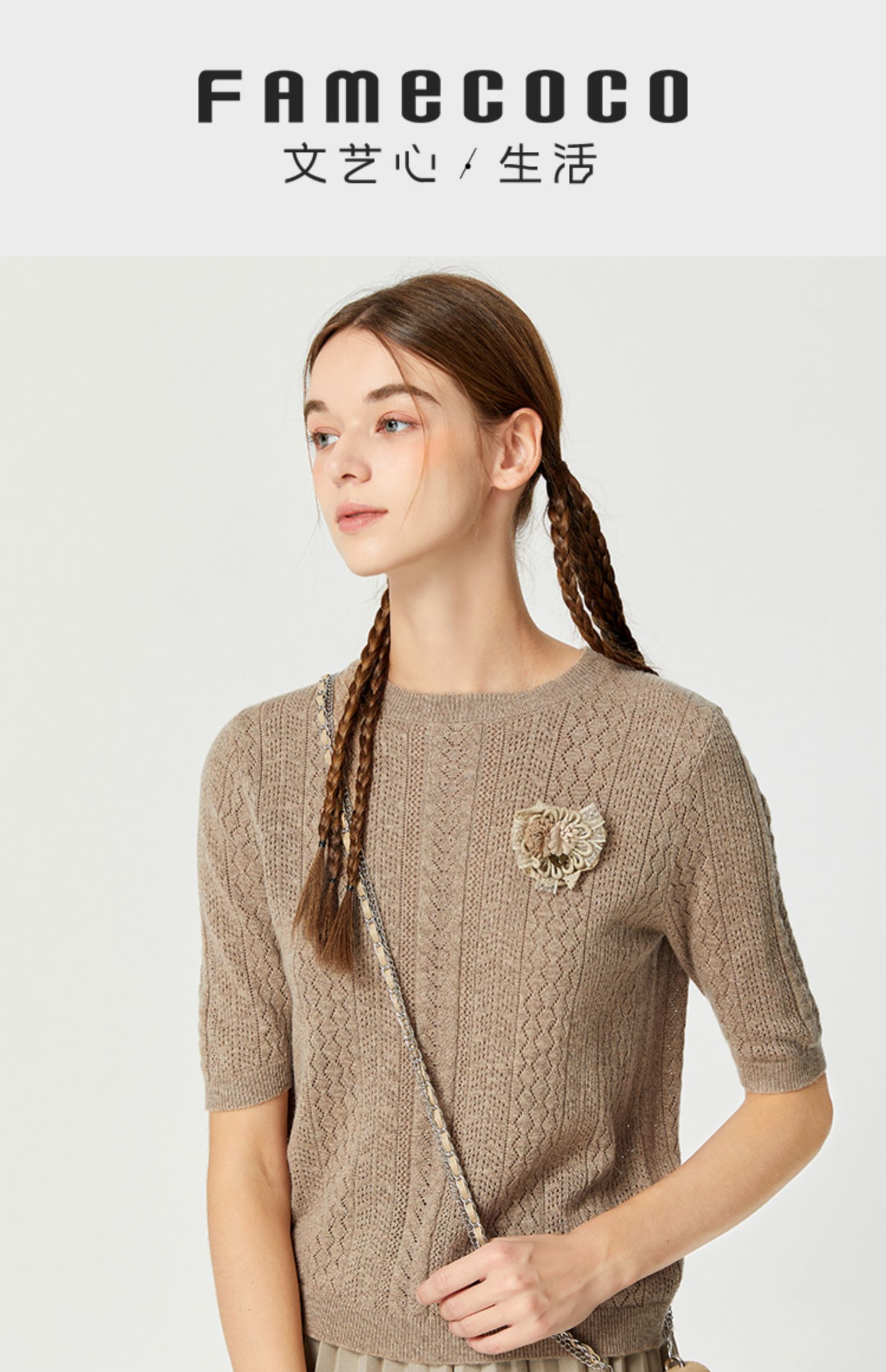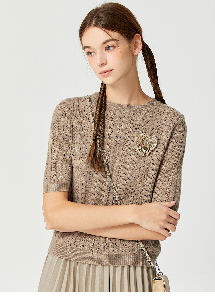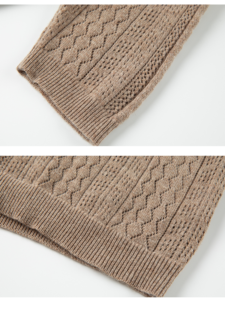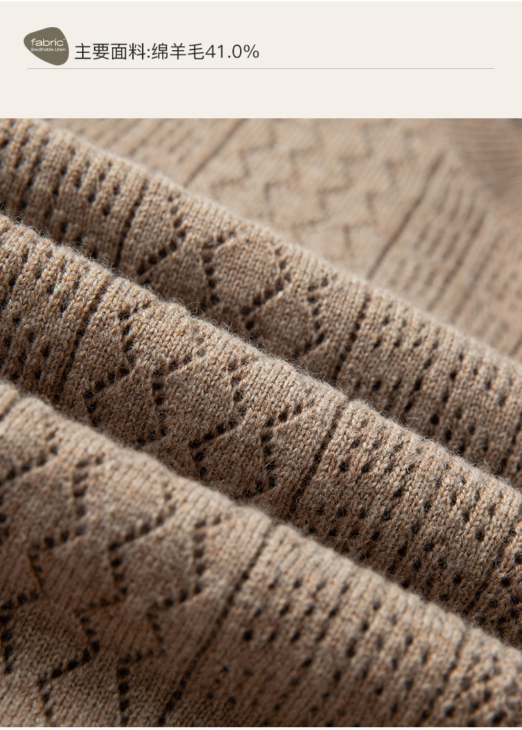 Famecoco范可儿卡其色镂空针织衫t恤秋羊毛微透上衣女宽松高级感F225DB002