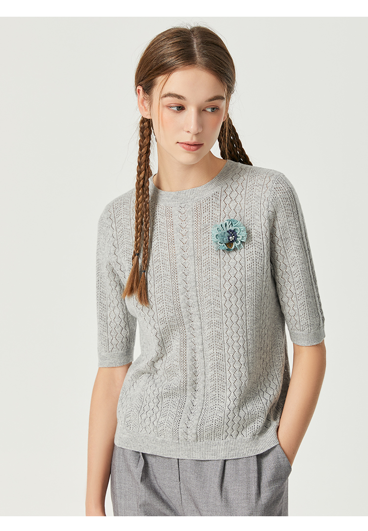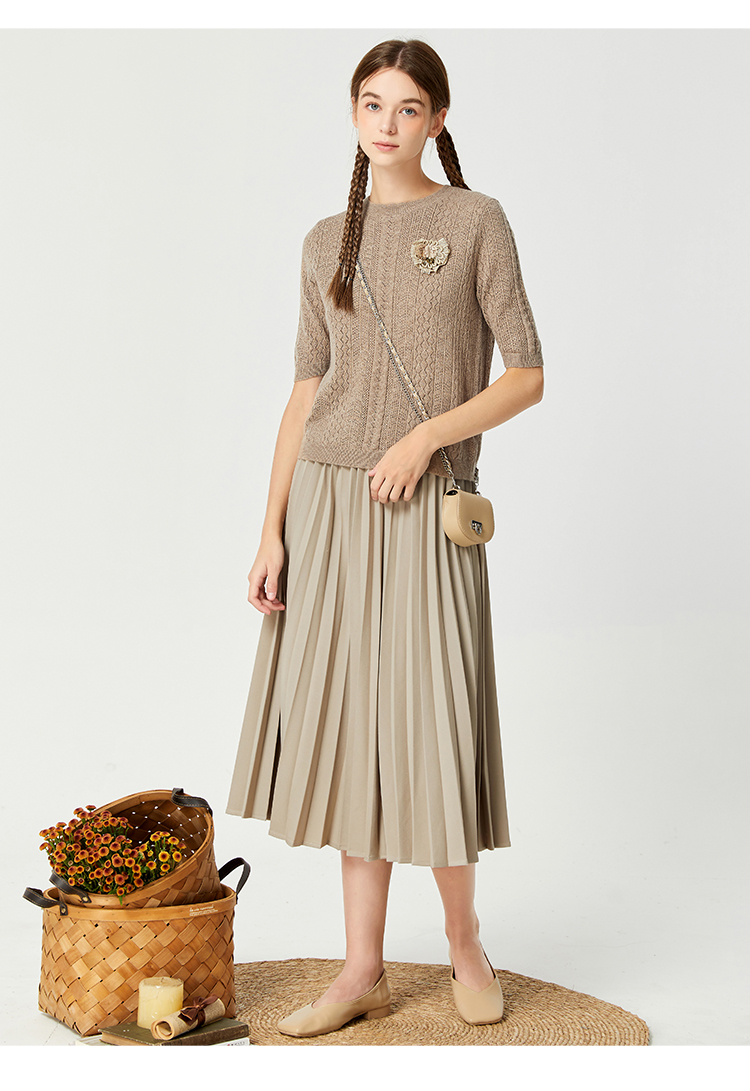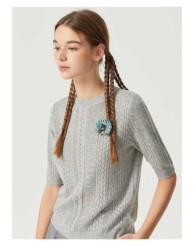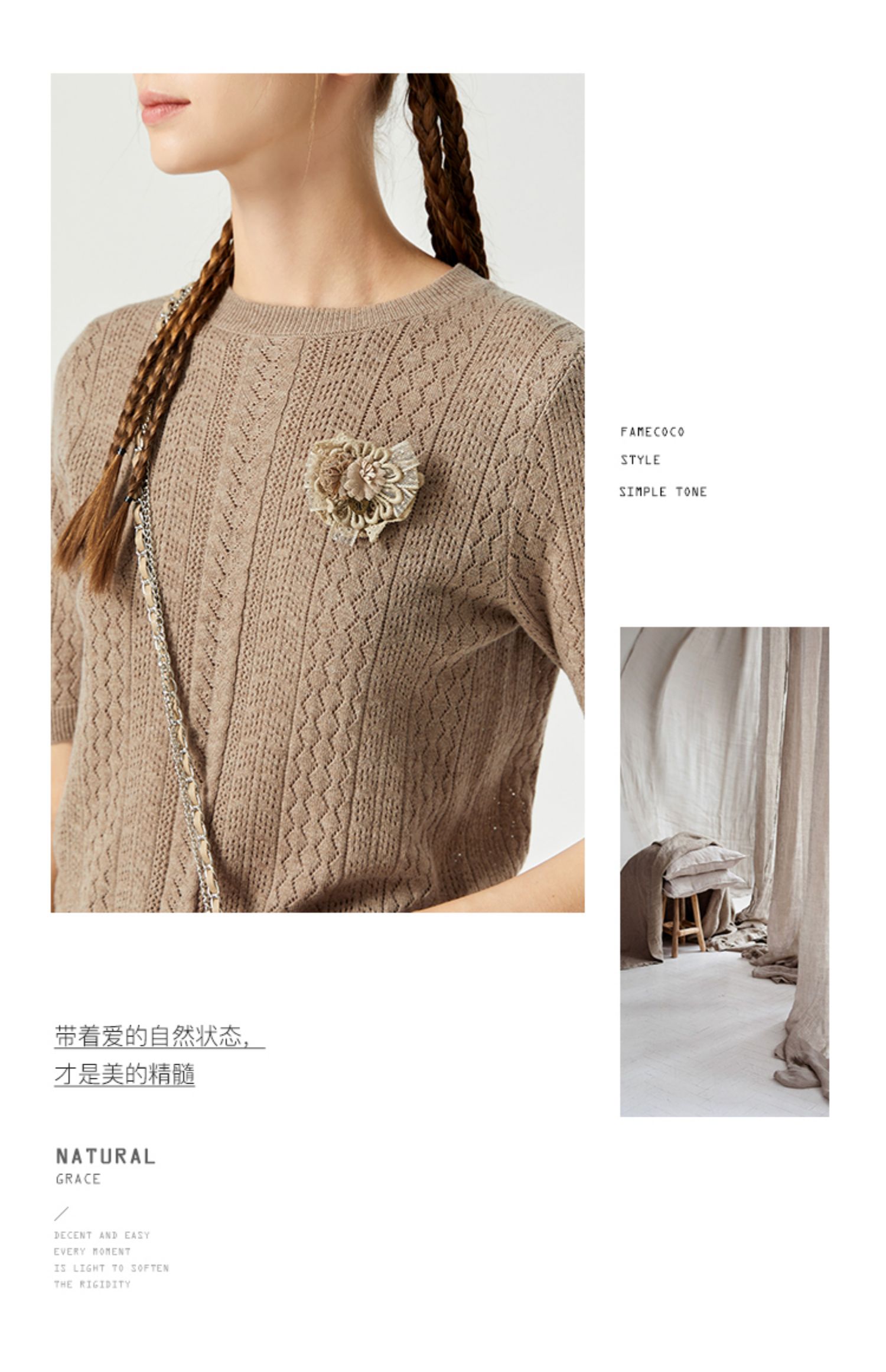 Famecoco范可儿卡其色镂空针织衫t恤秋羊毛微透上衣女宽松高级感F225DB002