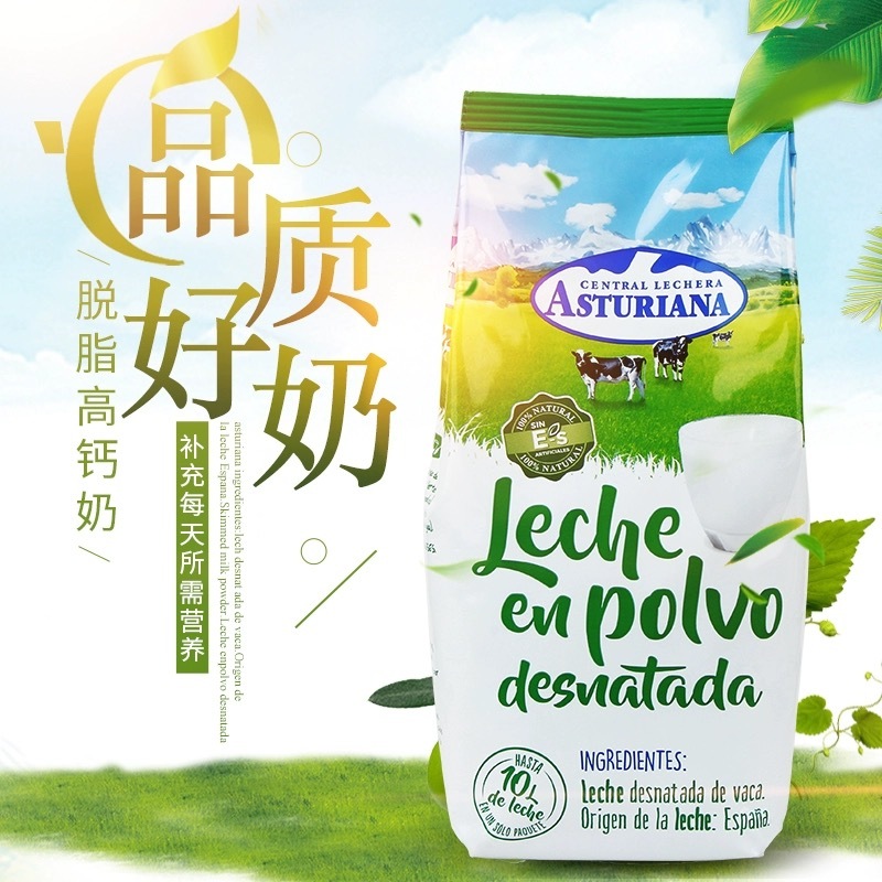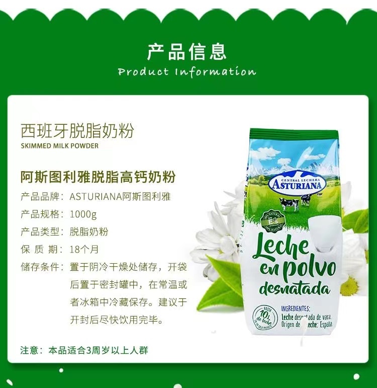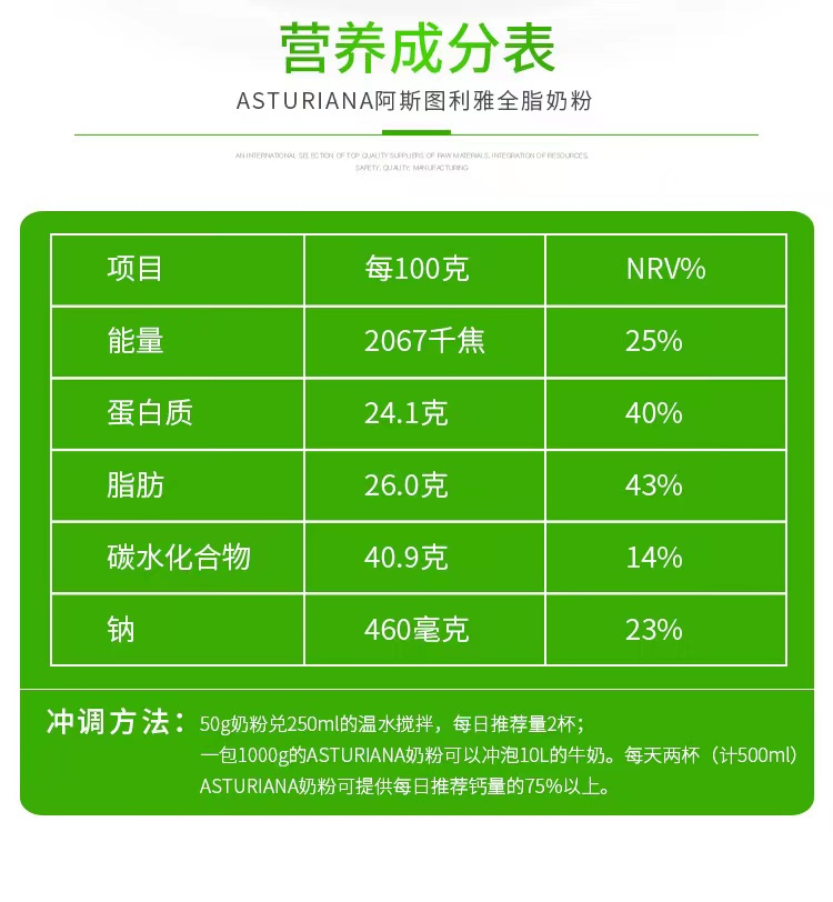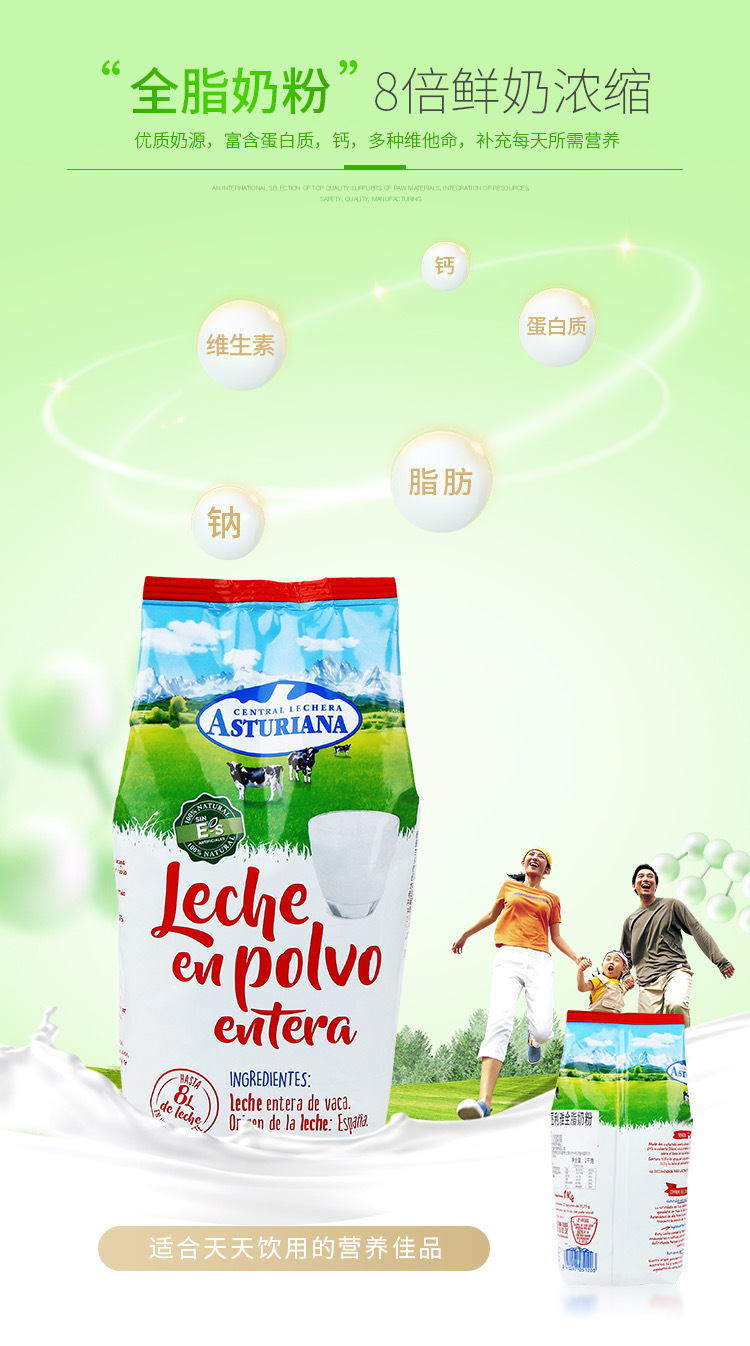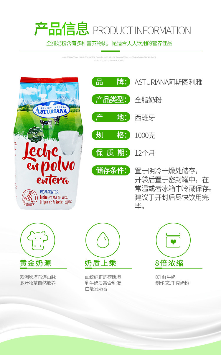 每1kg Asturiana 全脂奶粉是有8L鲜奶经过高温消毒、干燥而制成的