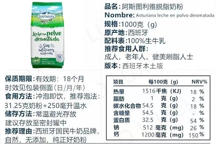 简单来说就是Asturiana 鲜奶直接脱水干燥而成的原始奶粉,整个过程中没有去除和添加任何物质🏆🏆🏆
