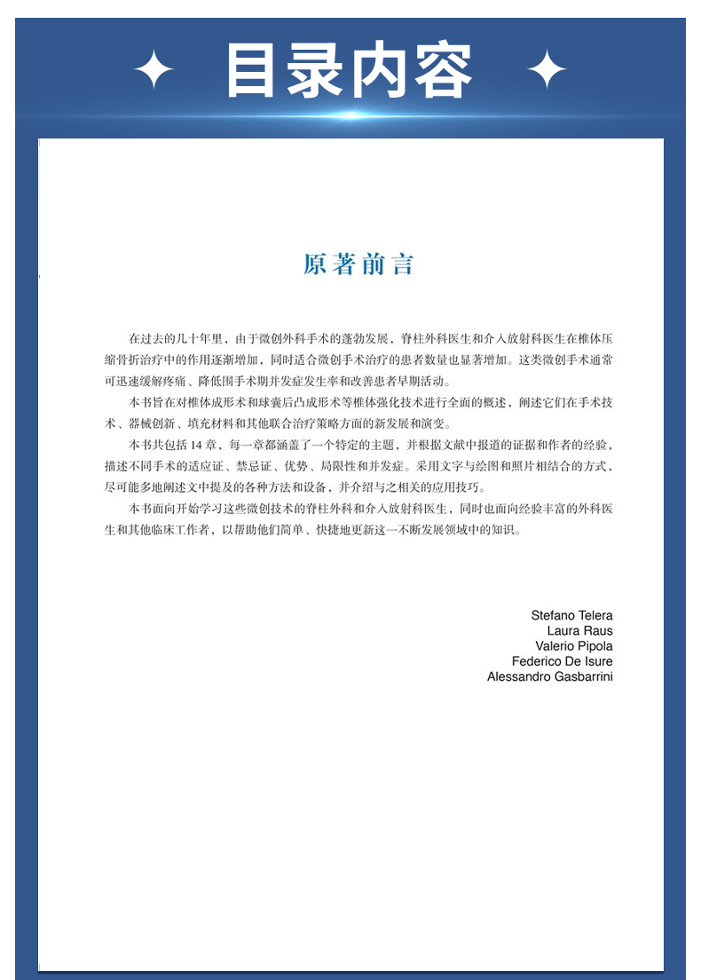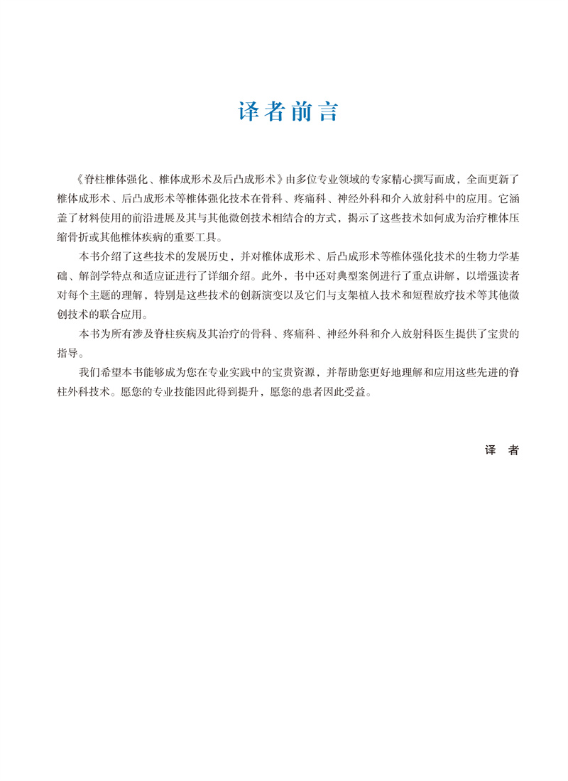 《脊柱椎体强化、椎体成形术及后凸成形术》由多位专业领域的专家精心撰写而成,全面更新了椎体成形术、后凸成形术等椎体强化技术在骨科、神经外科和介入放射科中的应用。它涵盖了材料使用的最新进展及其与其他微创技术相结合的方式,揭示了这些技术如何成为治疗椎体压缩性骨折或其他椎体疾病的重要工具。本书详细介绍了这些技术的发展历史,讲述了过去20年间使用的材料,并对椎体成形术、后凸成形术等椎体强化技术的生物力学基础、解剖学特点和适应证进行了详细介绍。此外,书中还对典型案例进行了重点讲解,以增强读者对每个主题的理解,特别是这些技术的创新演变以及它们与支架植入技术和短程放疗技术等其他微创技术的联合应用。本书为所有涉及脊柱疾病及其治疗的神经外科医生、骨科医生和介入放射科医生提供了宝贵的指导。