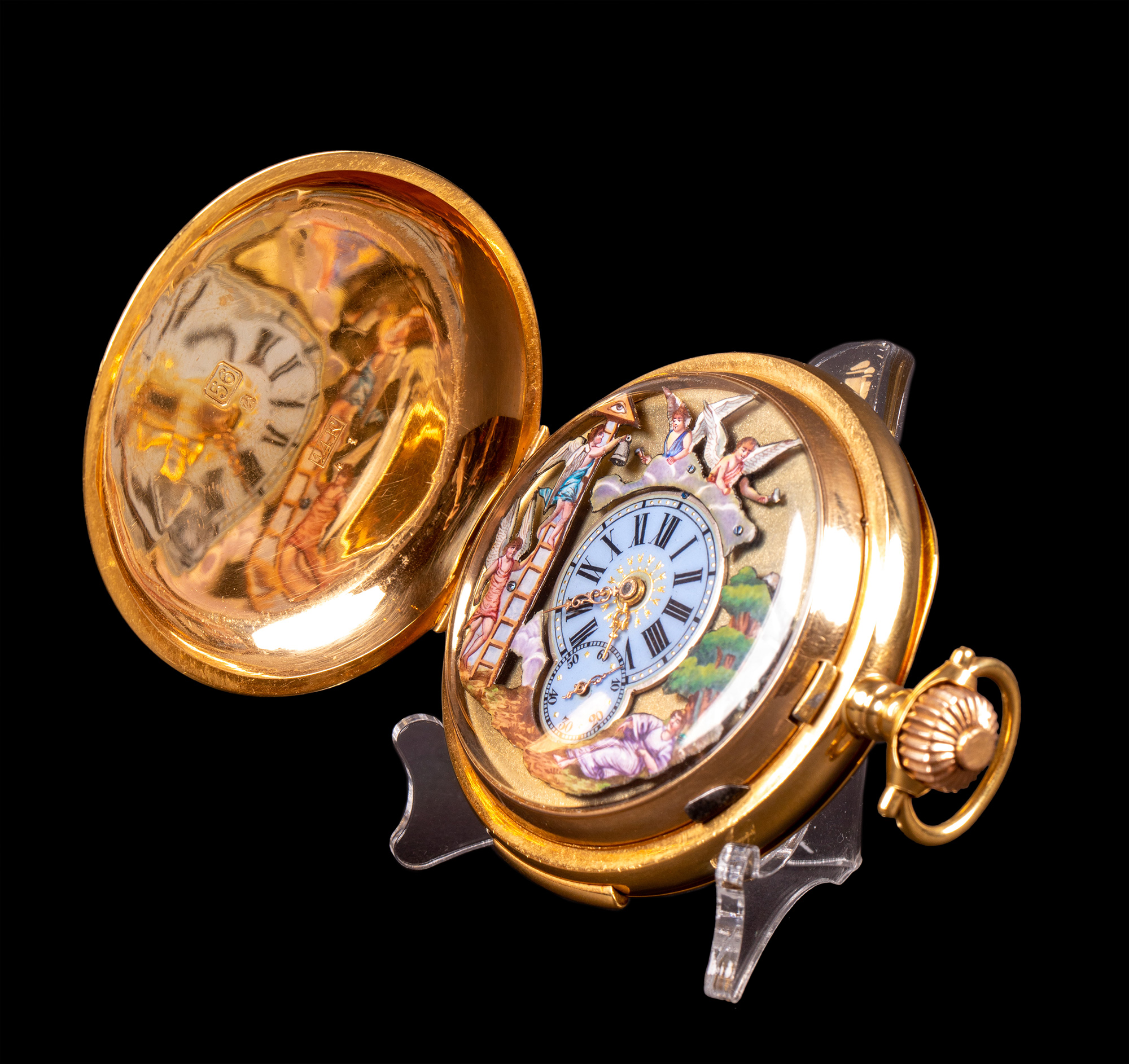 独角鹿西洋古董1890瑞士罕见14K金珐琅天使活动人偶三问报时怀表