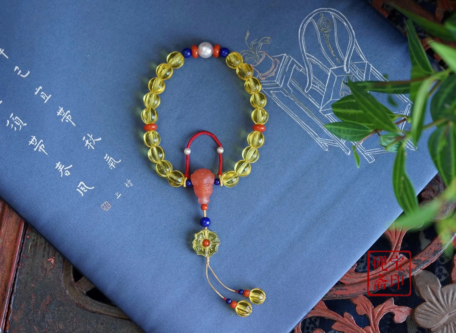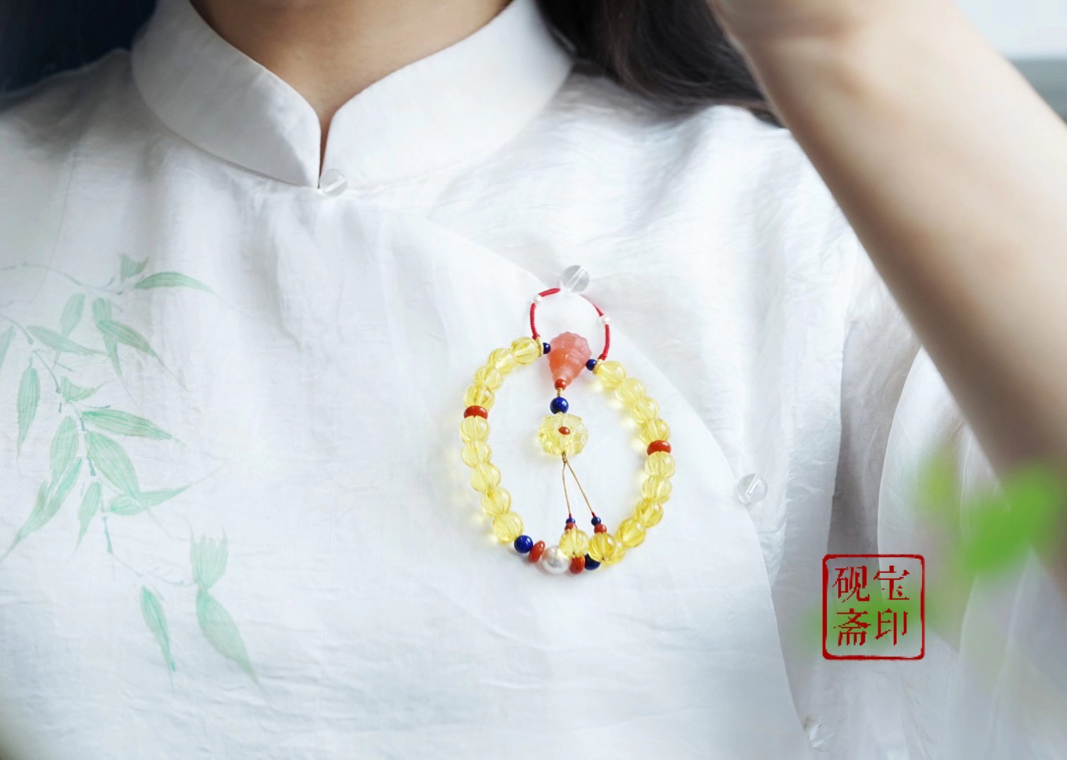 正好遇到这批金珀南瓜珠,觉得好合适!金,本身在古代就是富贵的颜色,放在十八子的设计上好招财的感觉😍整体色调碧橙明亮,特别是如果有一身旗袍(图5⃣️)十八子衣襟的功能发挥的淋漓尽致。