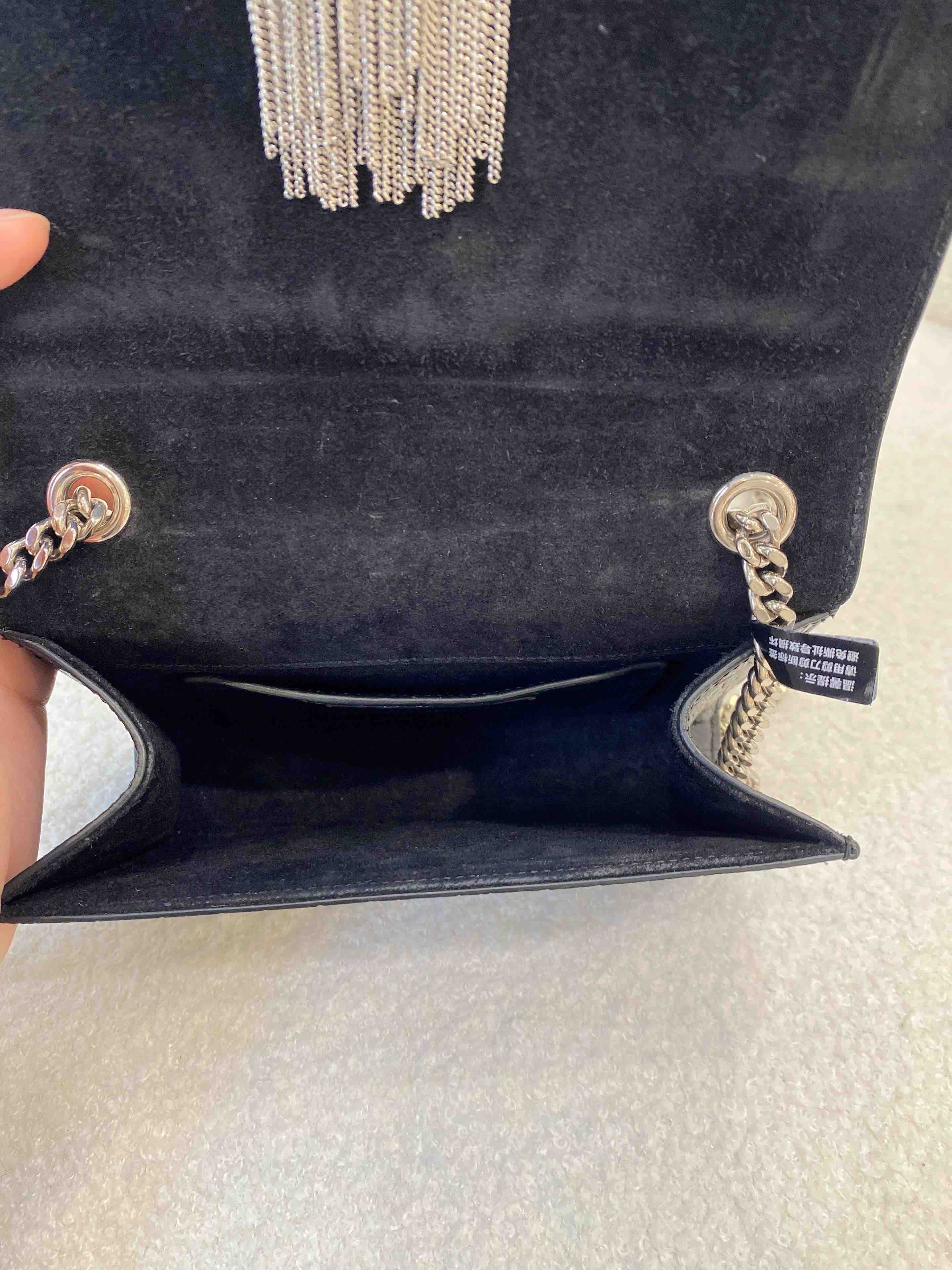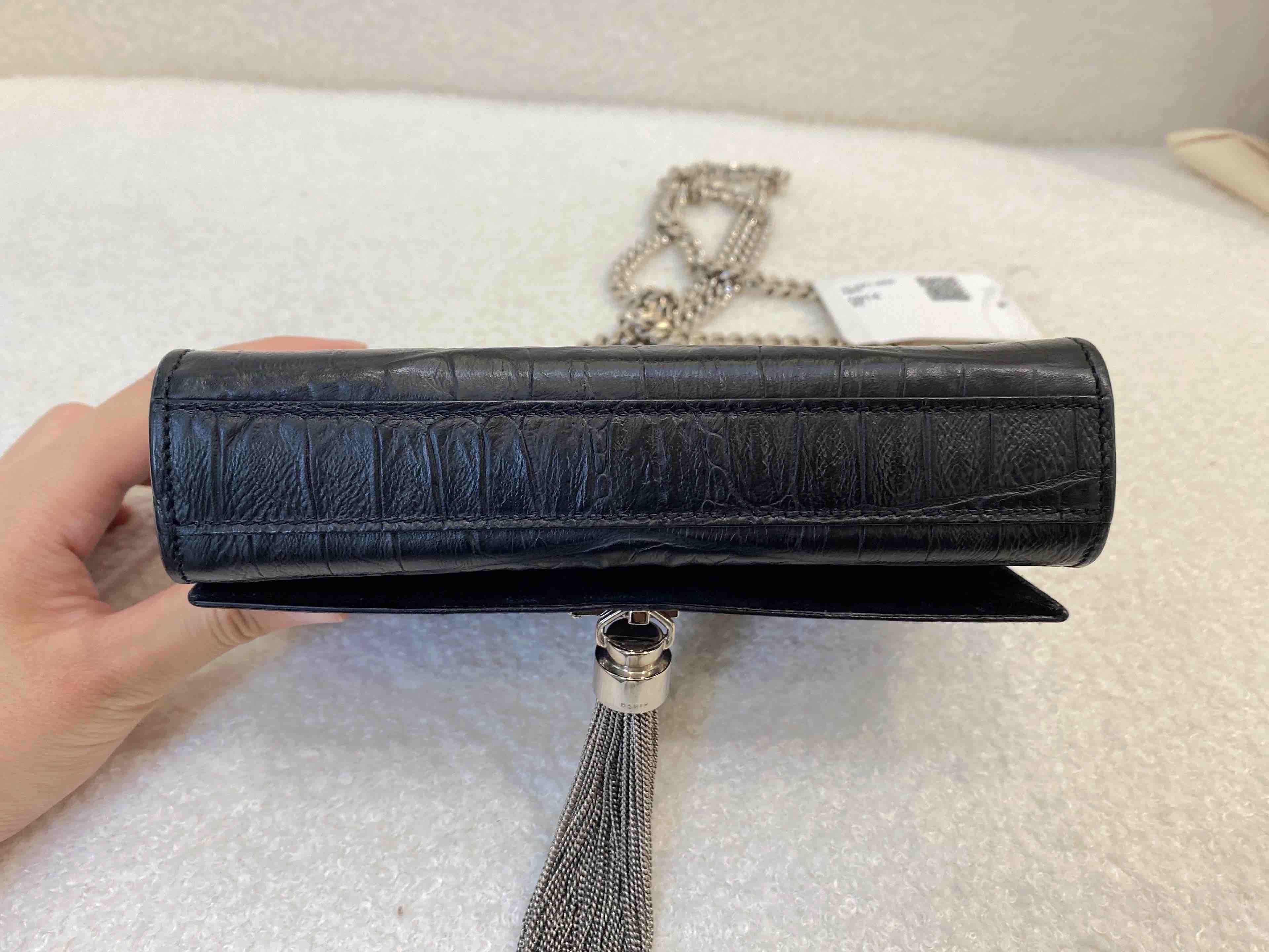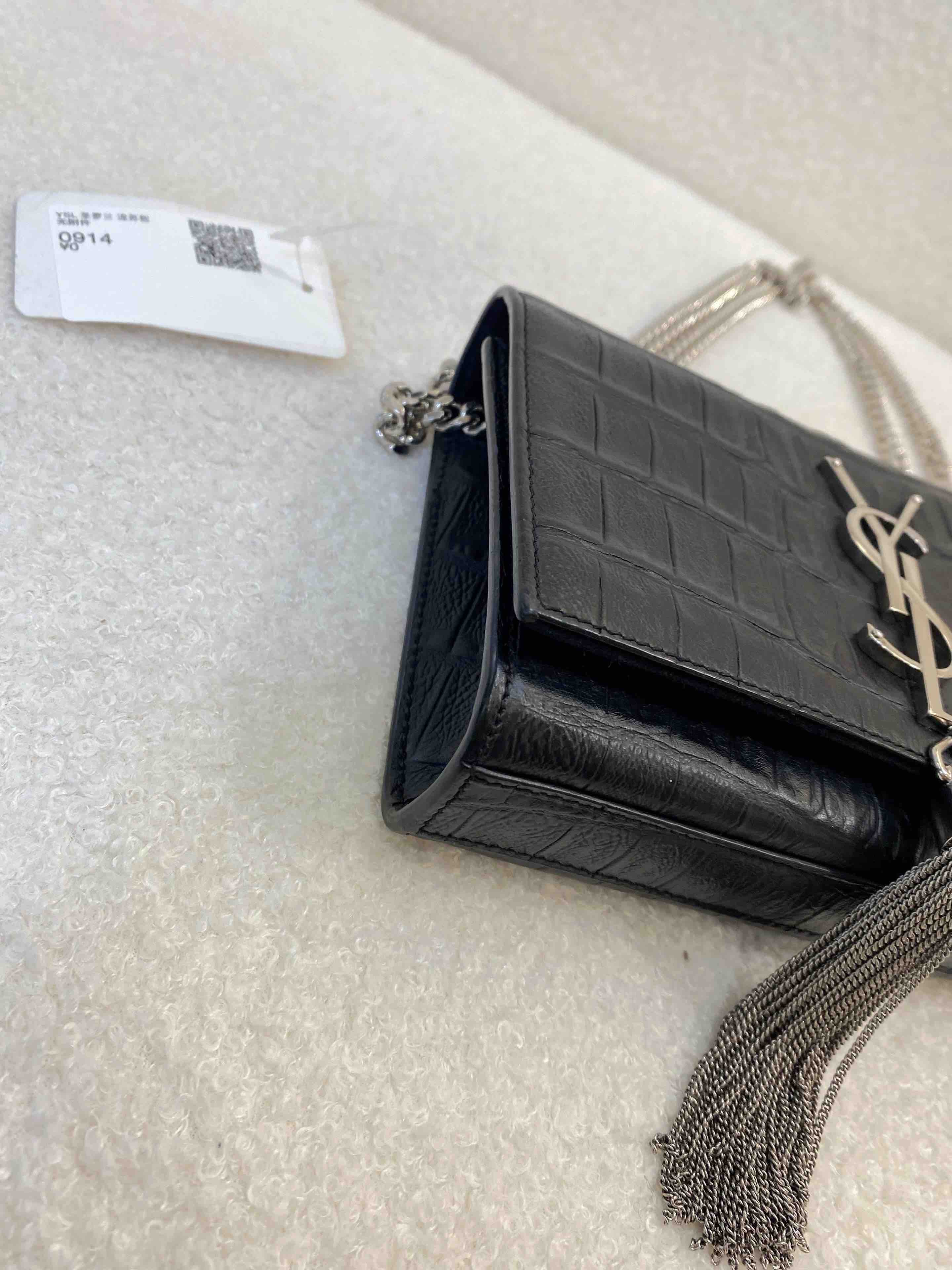 【商品详情】正品二手 YSL 小号 黑银 雾面 鳄鱼压纹牛皮 kate 流苏 链条包🪷97新 20×15 配件 :说明书。翻盖内里麂皮有轻微磨损 金属部分轻微使用感 精致时尚