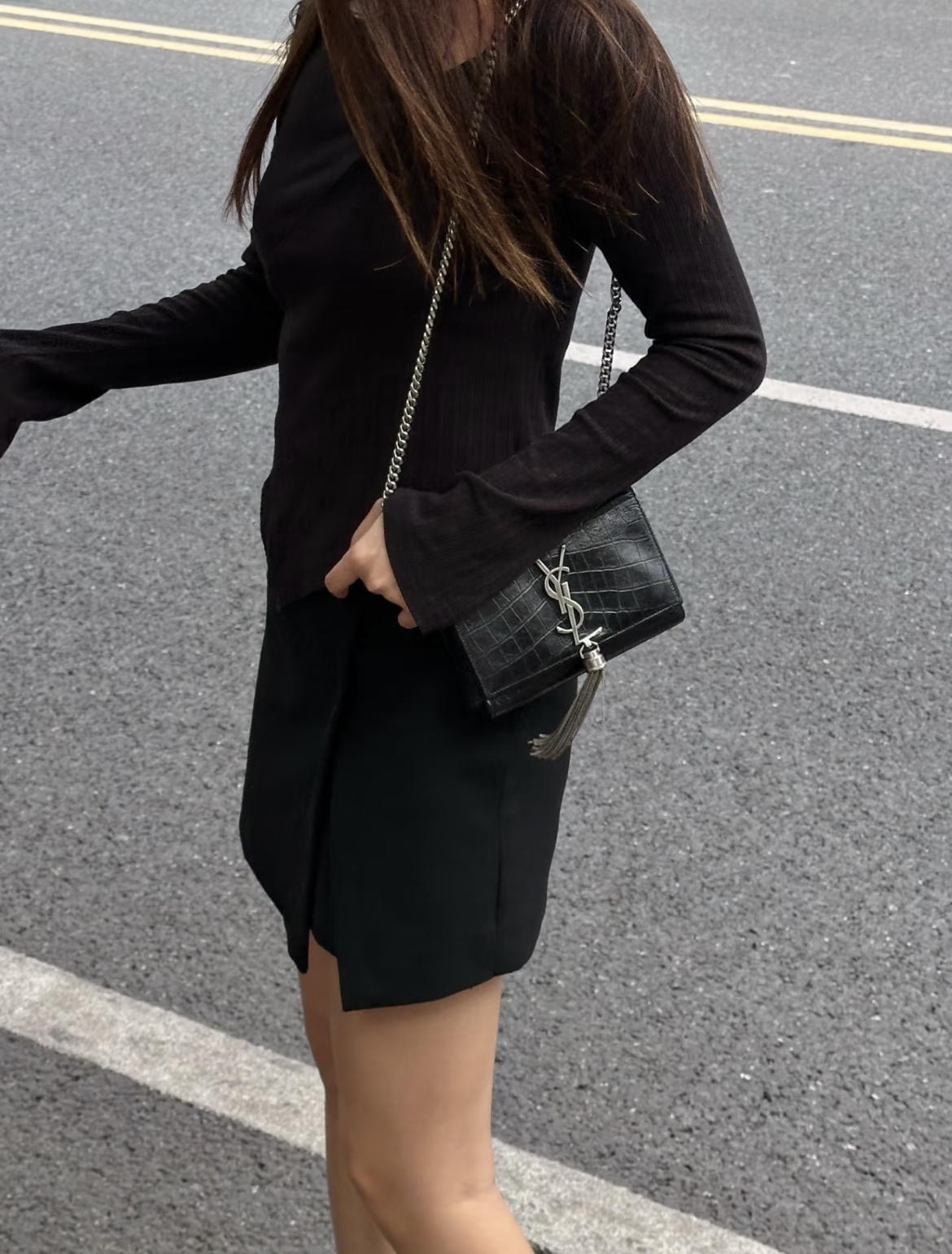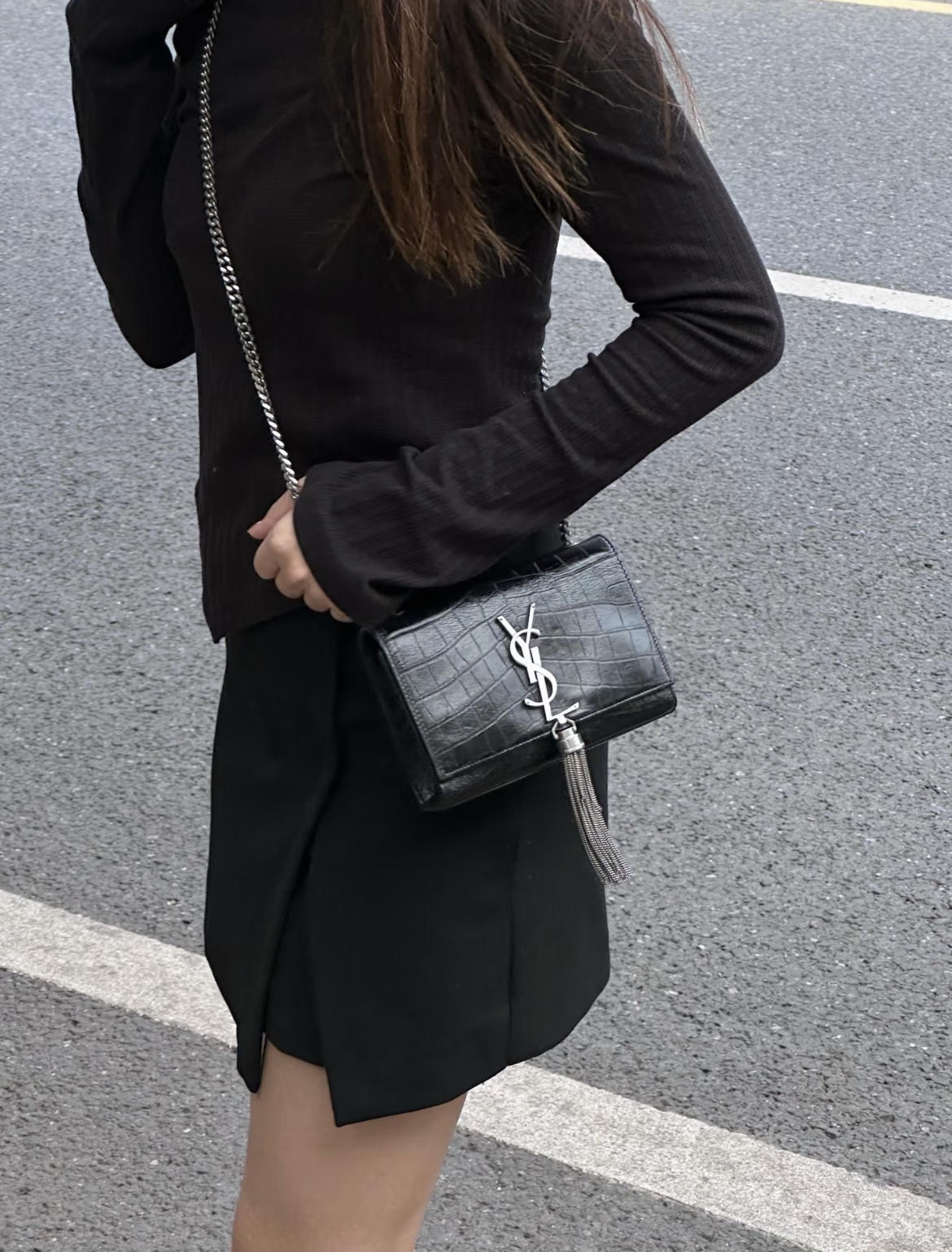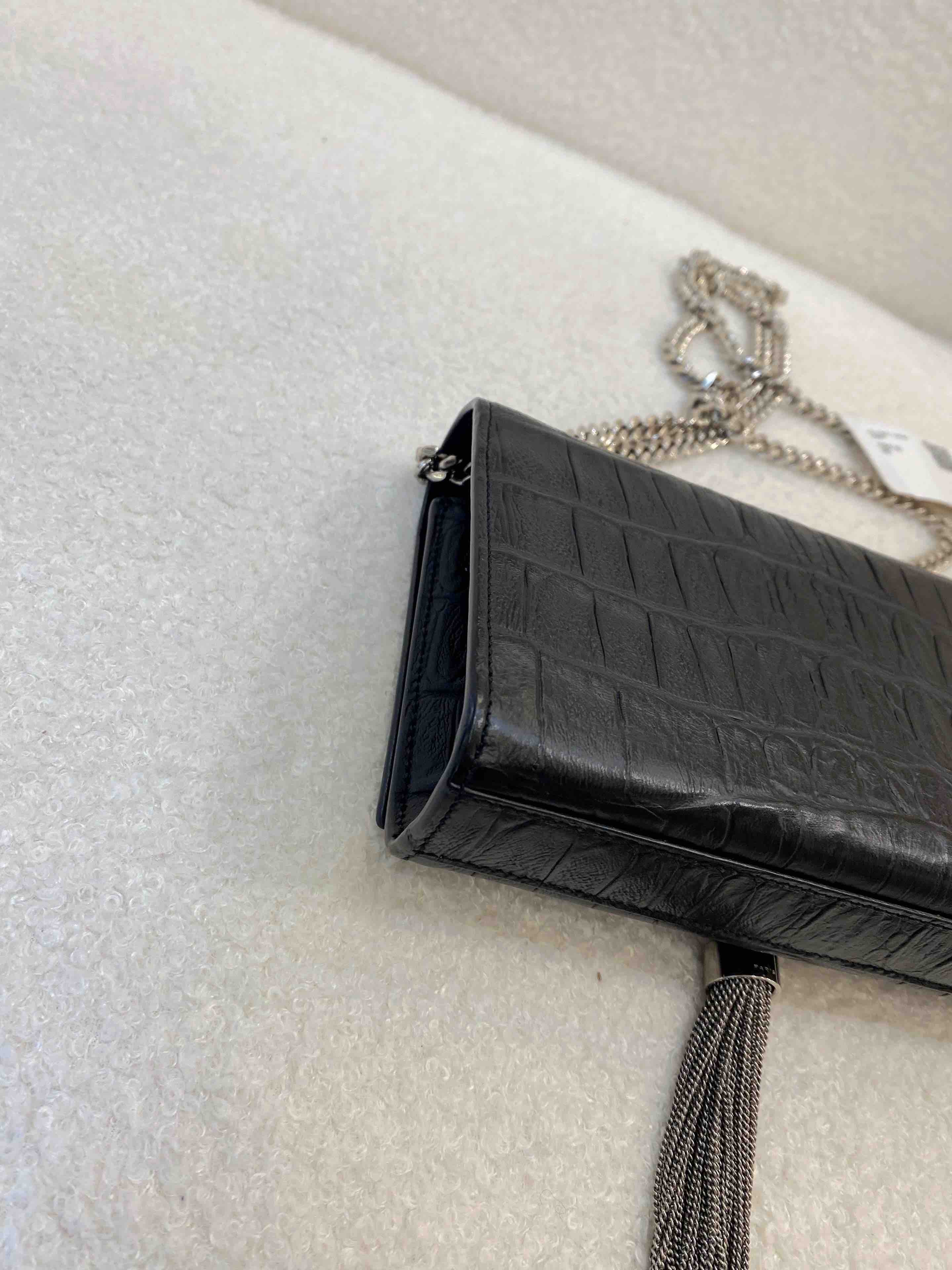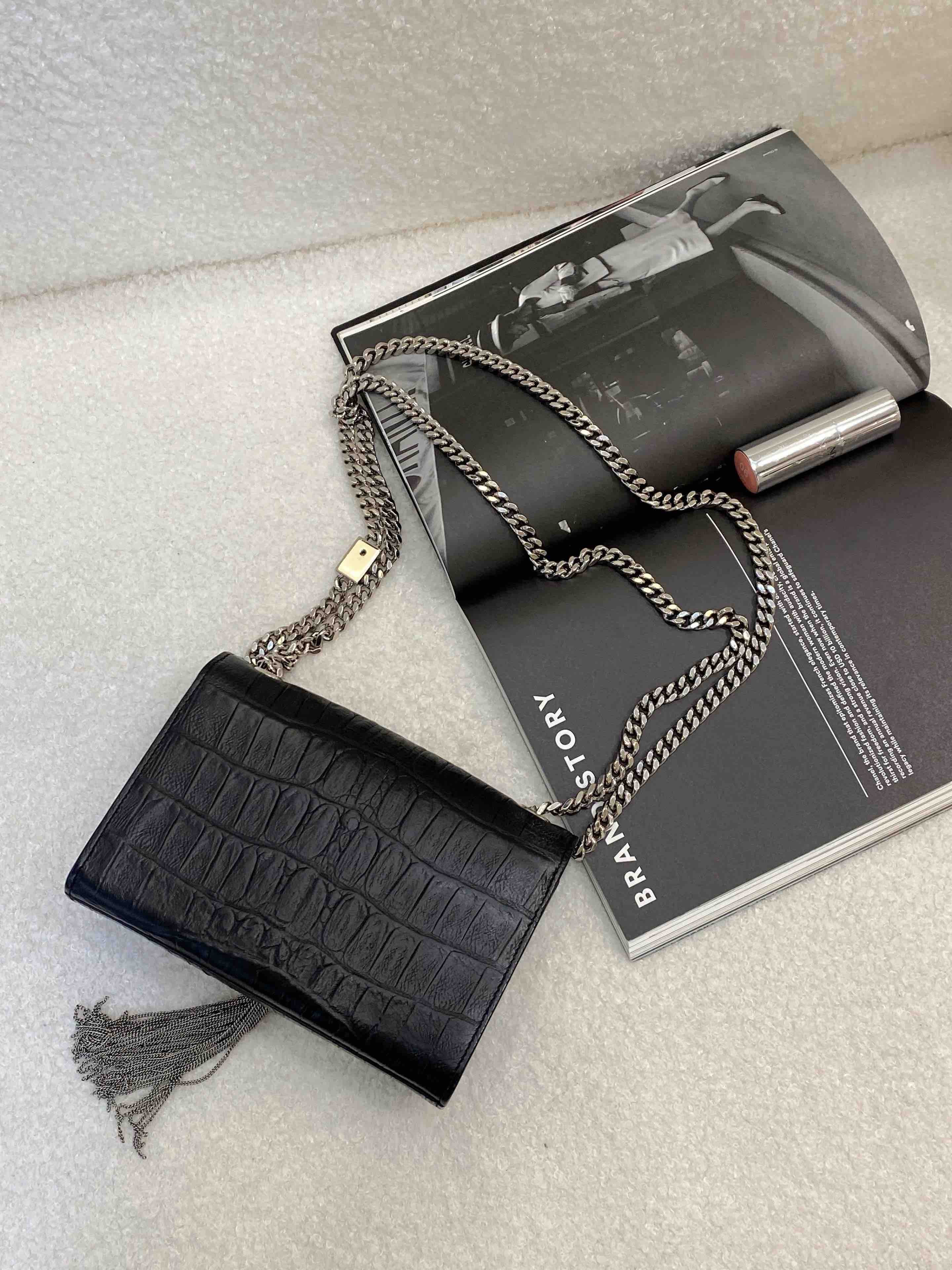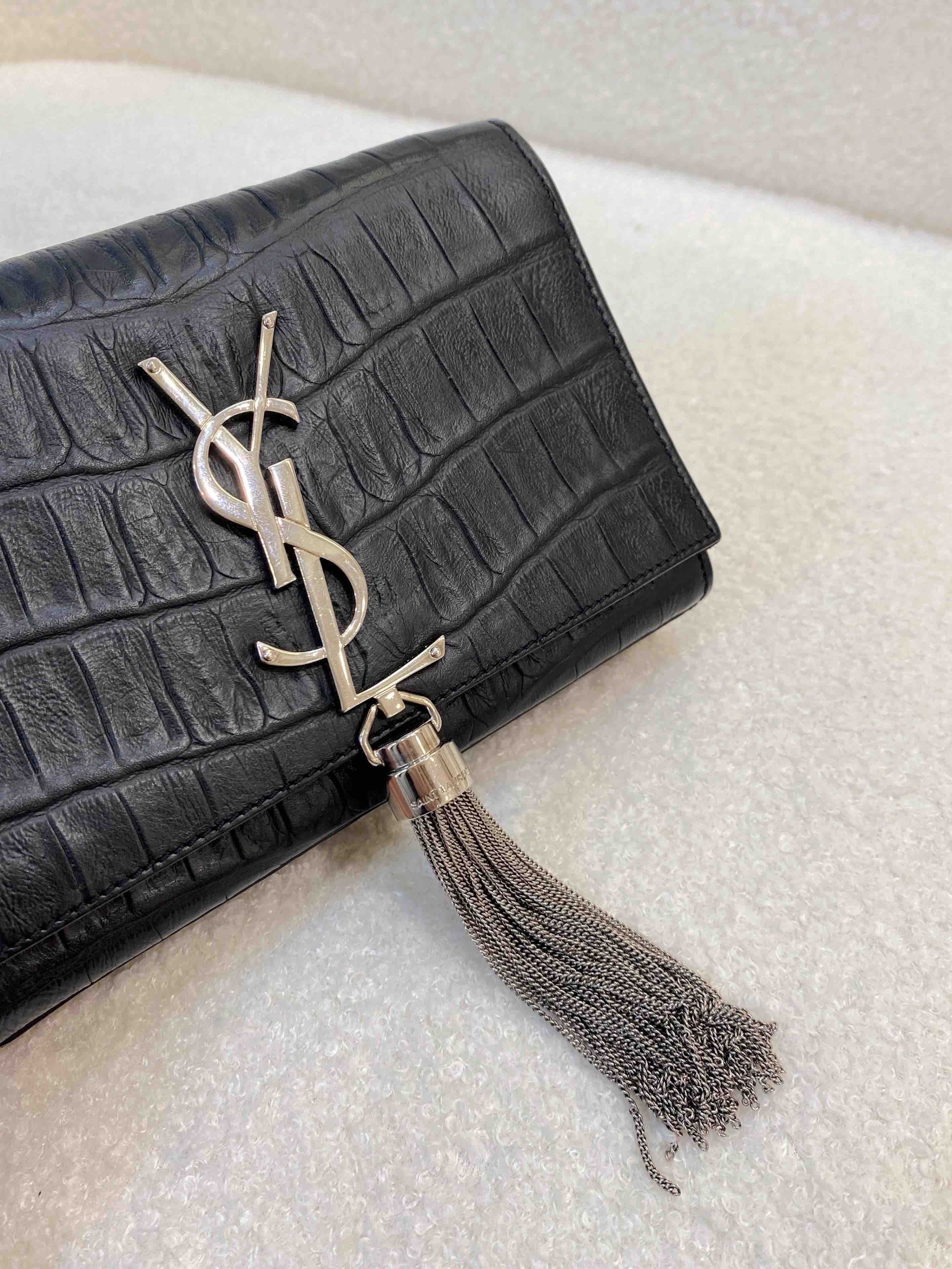 YSL 小号 黑银 雾面 鳄鱼压纹牛皮 kate 流苏 链条包