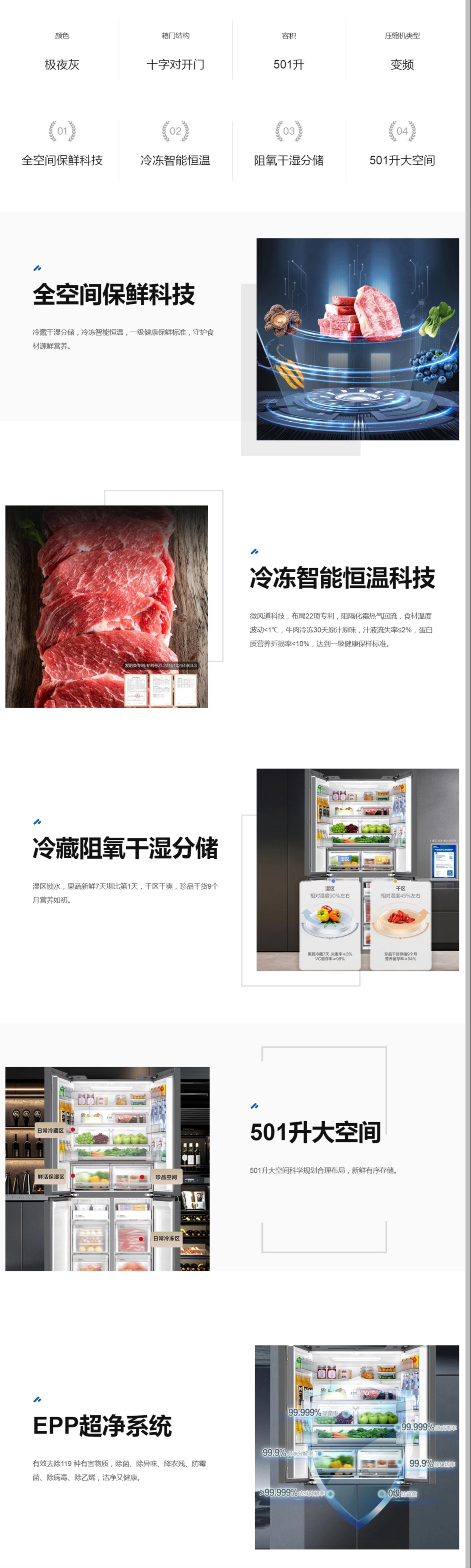 海尔 冰箱 BCD-501WGHTD1BH3U1 501升 一级能效 风冷 变频 十字对开门 钢化玻璃面板 电脑控温 触摸