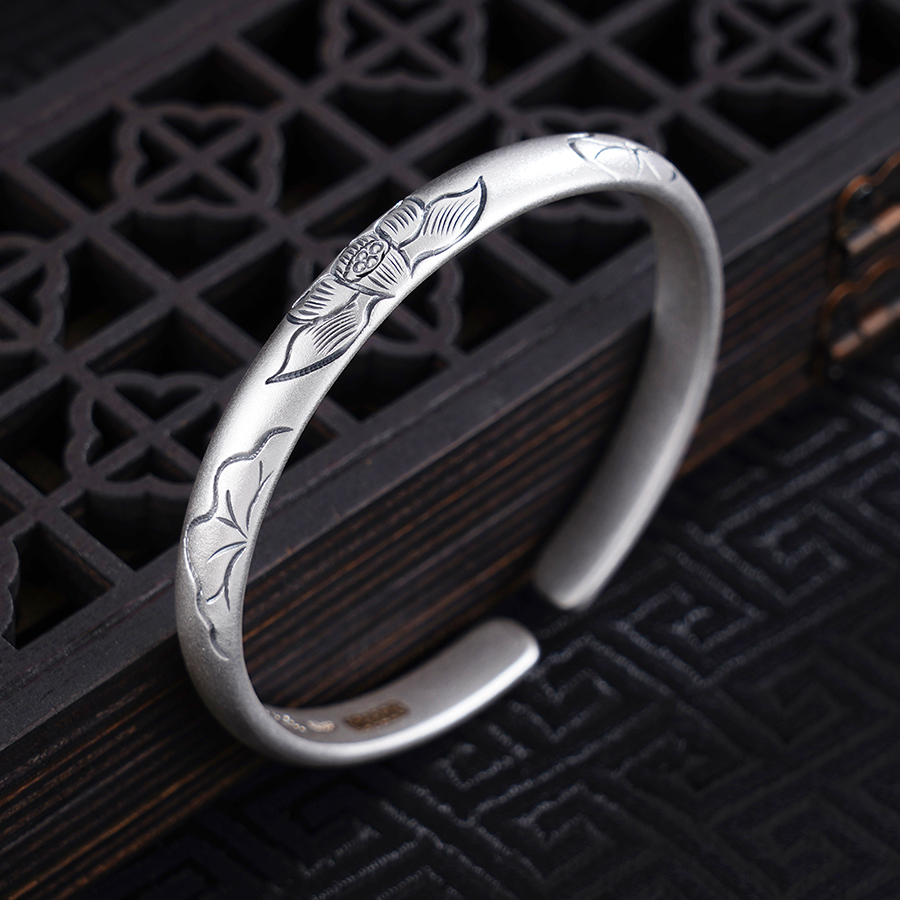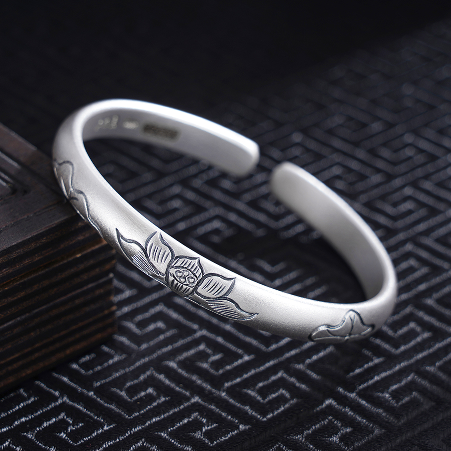 【寓意】:纯银开口手镯,镯面錾刻莲花莲叶图案。莲叶同辉,寓意和合美满,福寿绵长。