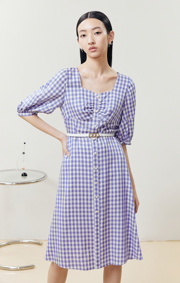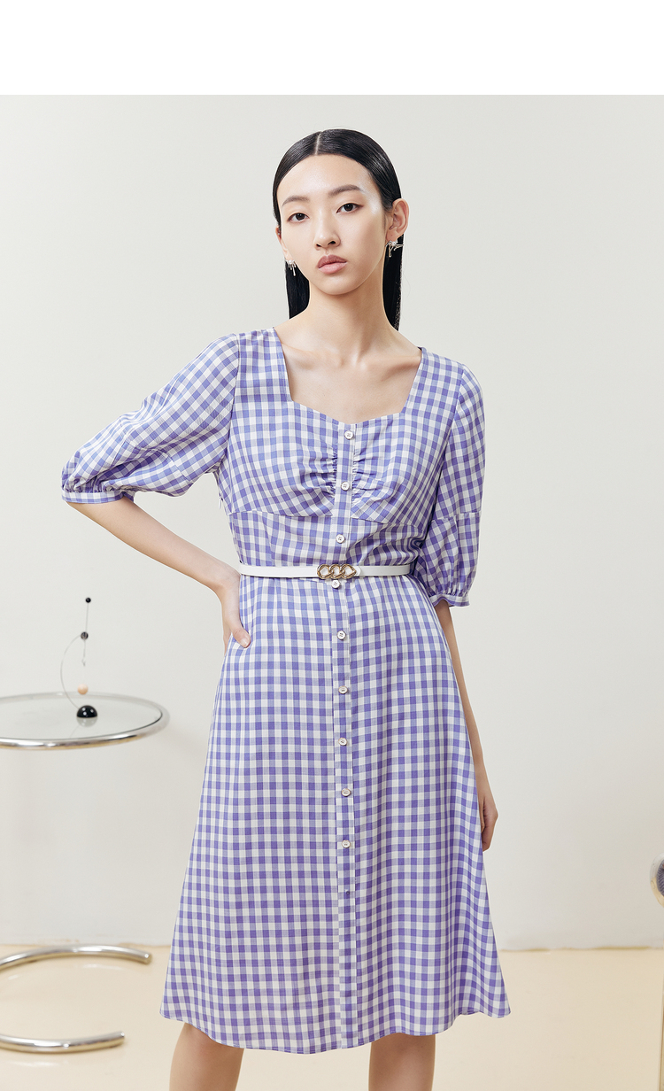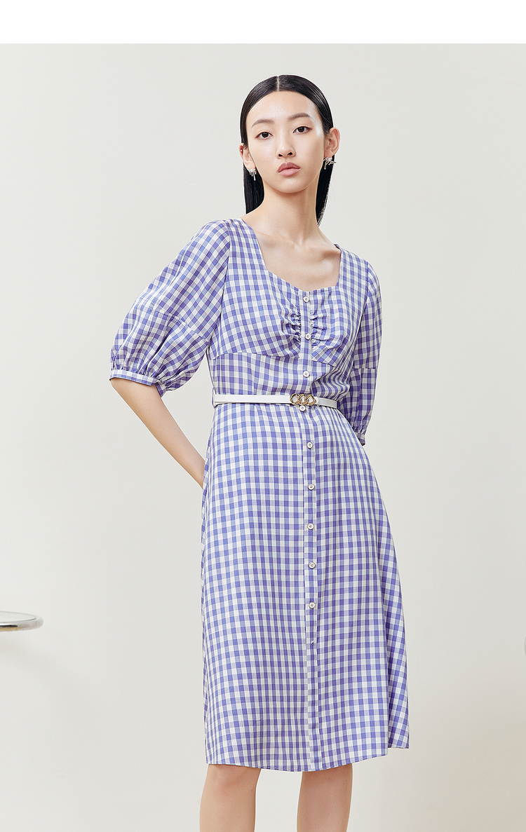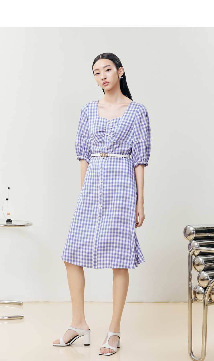 NEELLY纳俪商场同款复古方领格子连衣裙女单排扣系带A字裙中长款N22051Y01135