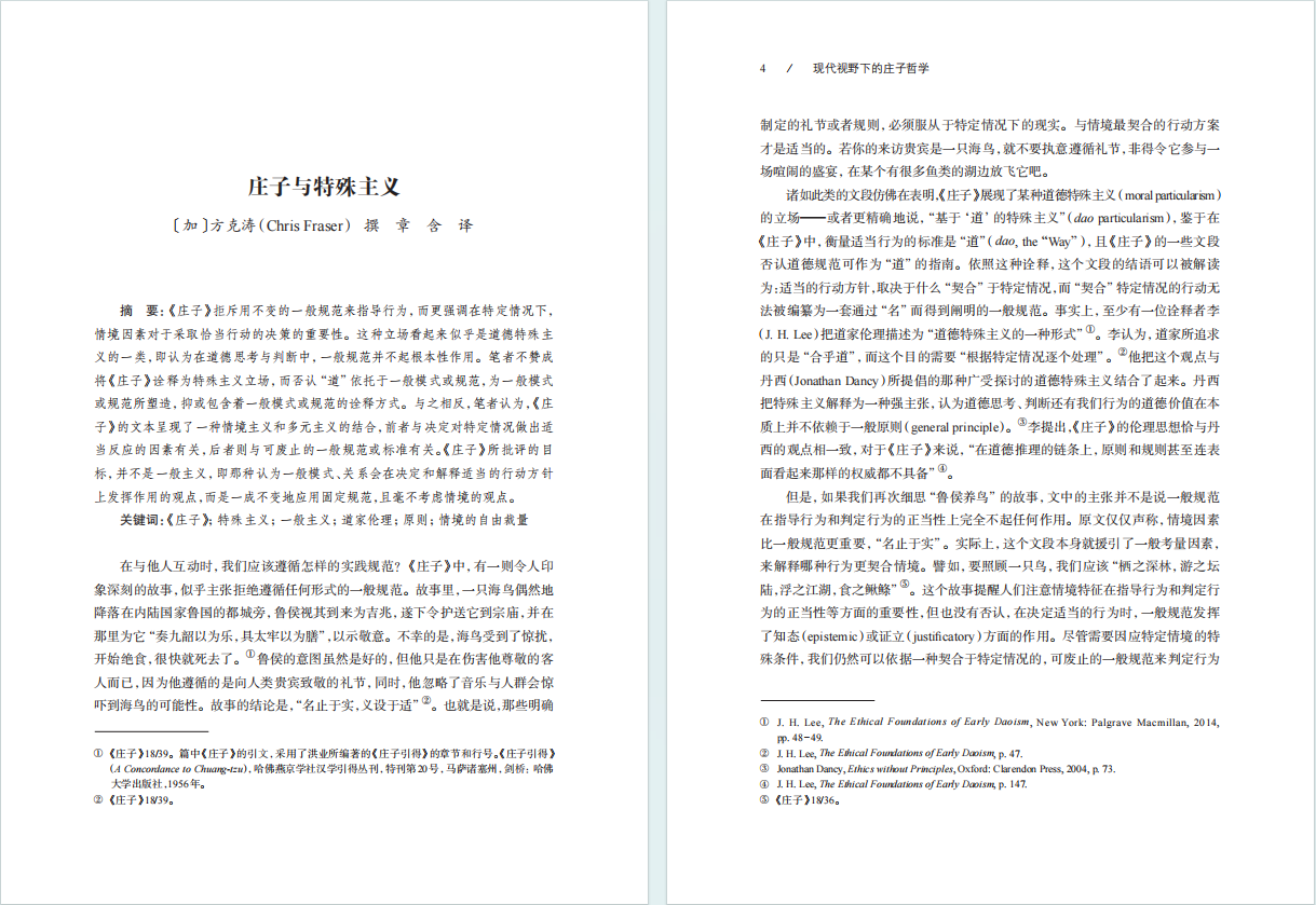 《现代儒学》是复旦大学上海儒学院主编的辑刊,旨在推动儒家多元传统的研究,面向现代世界阐发儒家思想。本辑《现代儒学》主题为“现代视野下的庄子哲学”,除方克涛先生特稿《庄子与特殊主义》外,既有胡建萍、黄勇关于《论〈庄子〉中的行为对象道德相对论 》一文的学术商榷,还荟萃了袁艾、章含等知名学者的庄子哲学研究成果;胡湘农《孟子的义利之辨:对后果主义解读的批判》、季磊《经学研究的新样态——评丁四新〈洪范大义与忠恕之道〉》等文章会通中西,对儒学阐释的现代化也具有较高学术价值。