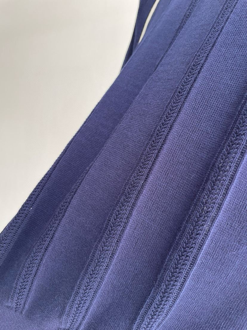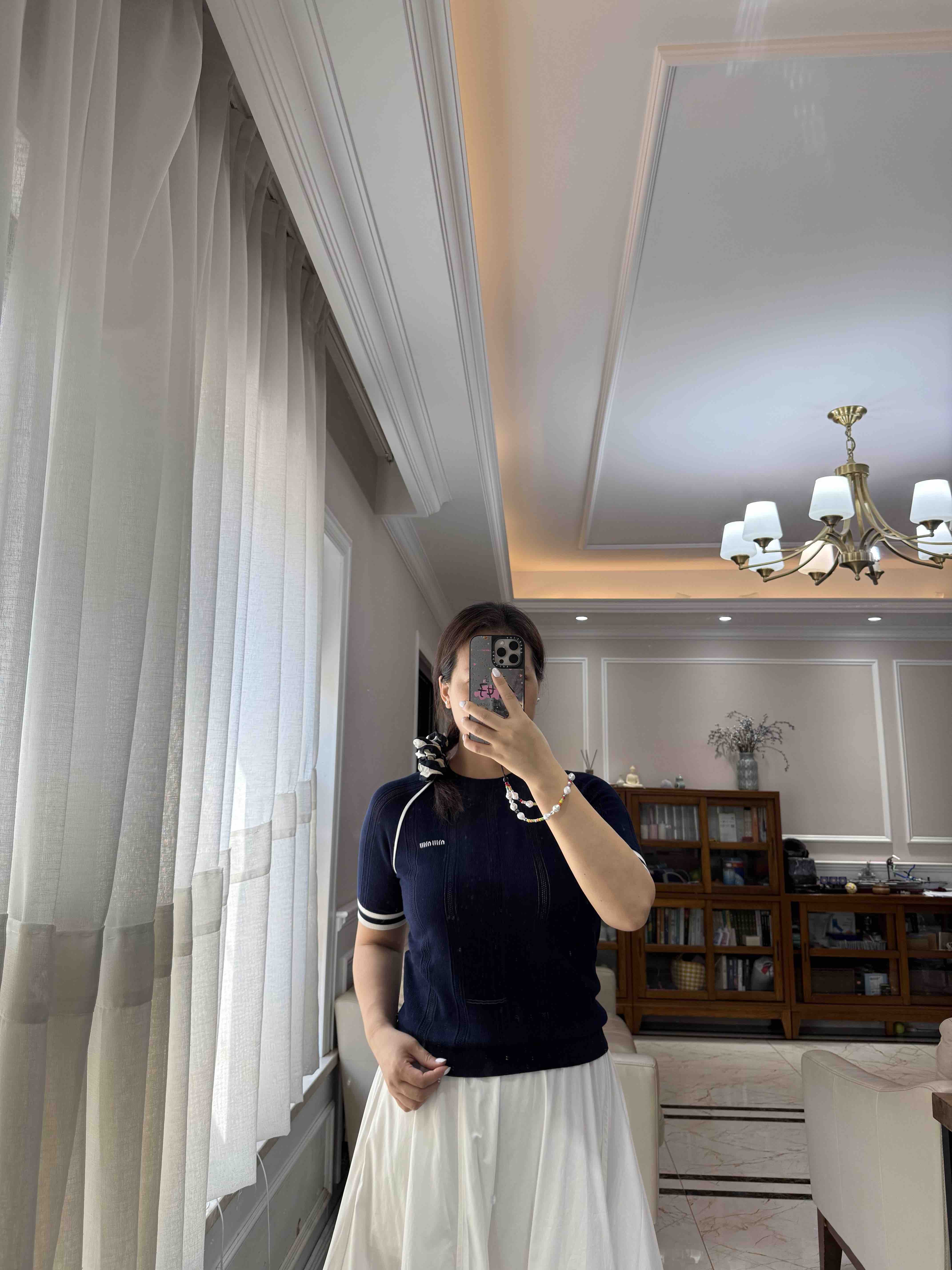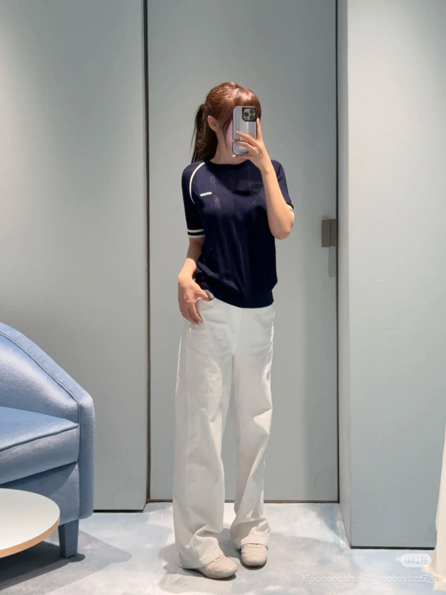 排他独性家圆,正藏青色挑空肌针理织 白色嵌 条圆领针短织袖。