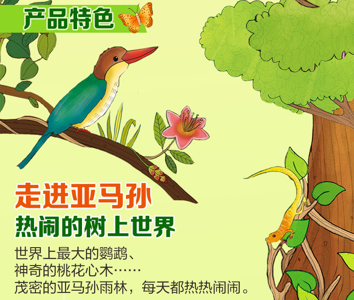 《揭秘雨林》这本书带孩子走进神秘的雨林世界——亚马孙雨林、非洲的雨林、印度的雨林、加里曼丹岛的雨林,了解不同地区雨林中的奇妙动物和植物,邂逅自然界里的绚丽。