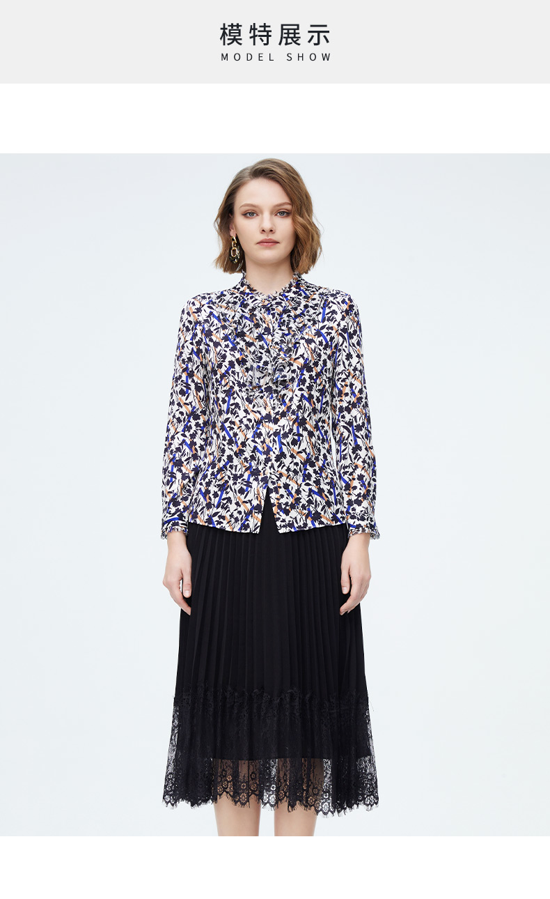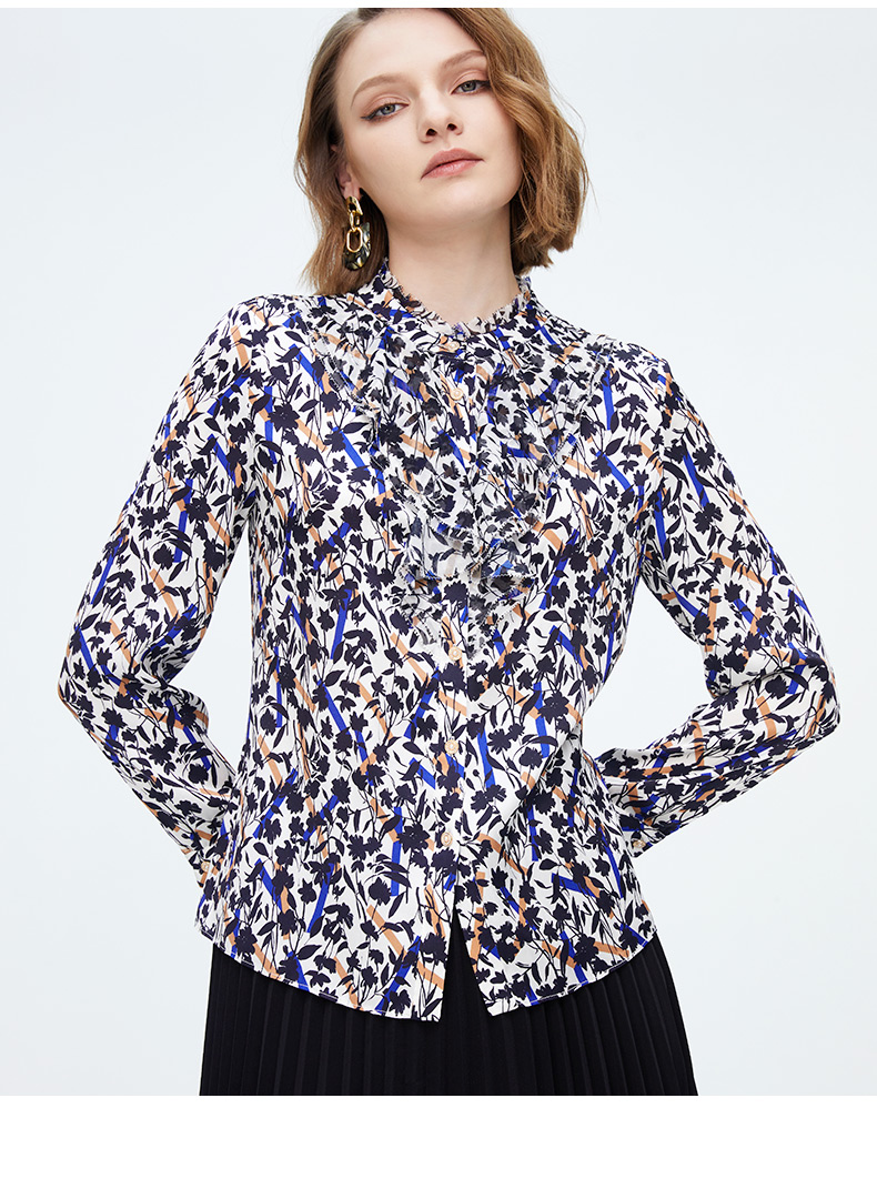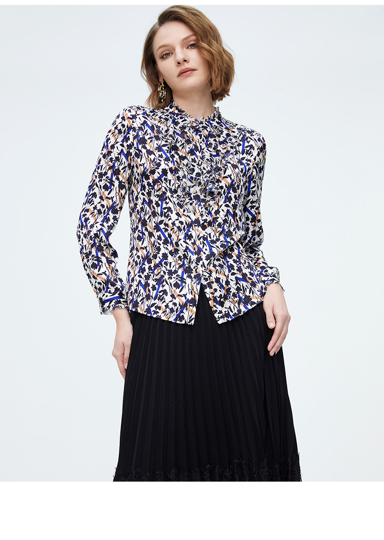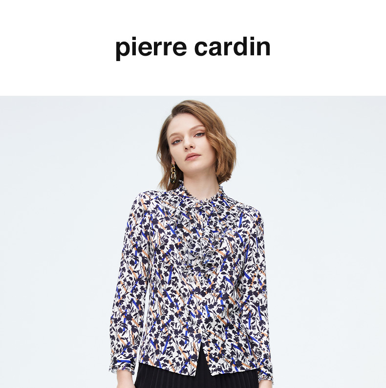 皮尔卡丹女装新款时尚印花荷叶领简约衬衫P4124B4012N3