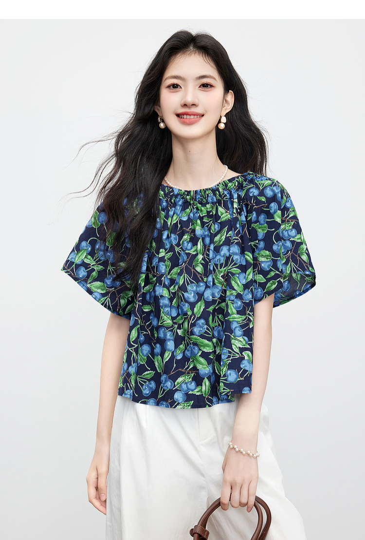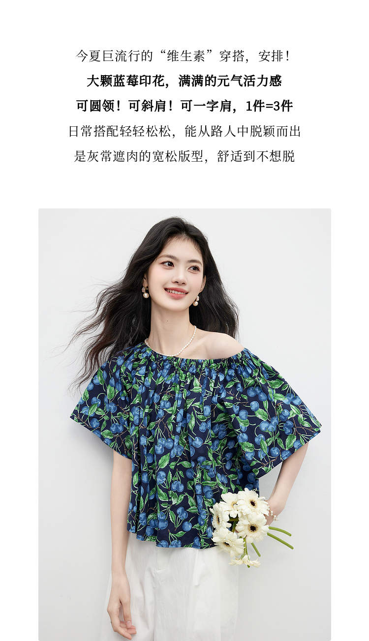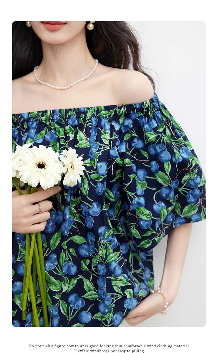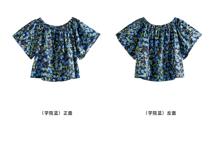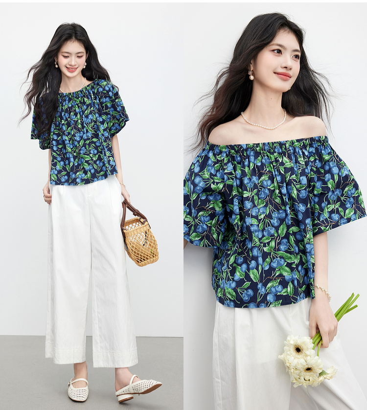 【周四狂欢价】熙世界纯棉蓝莓印花衬衫女设计感小众休闲一字肩上衣2025夏日新款